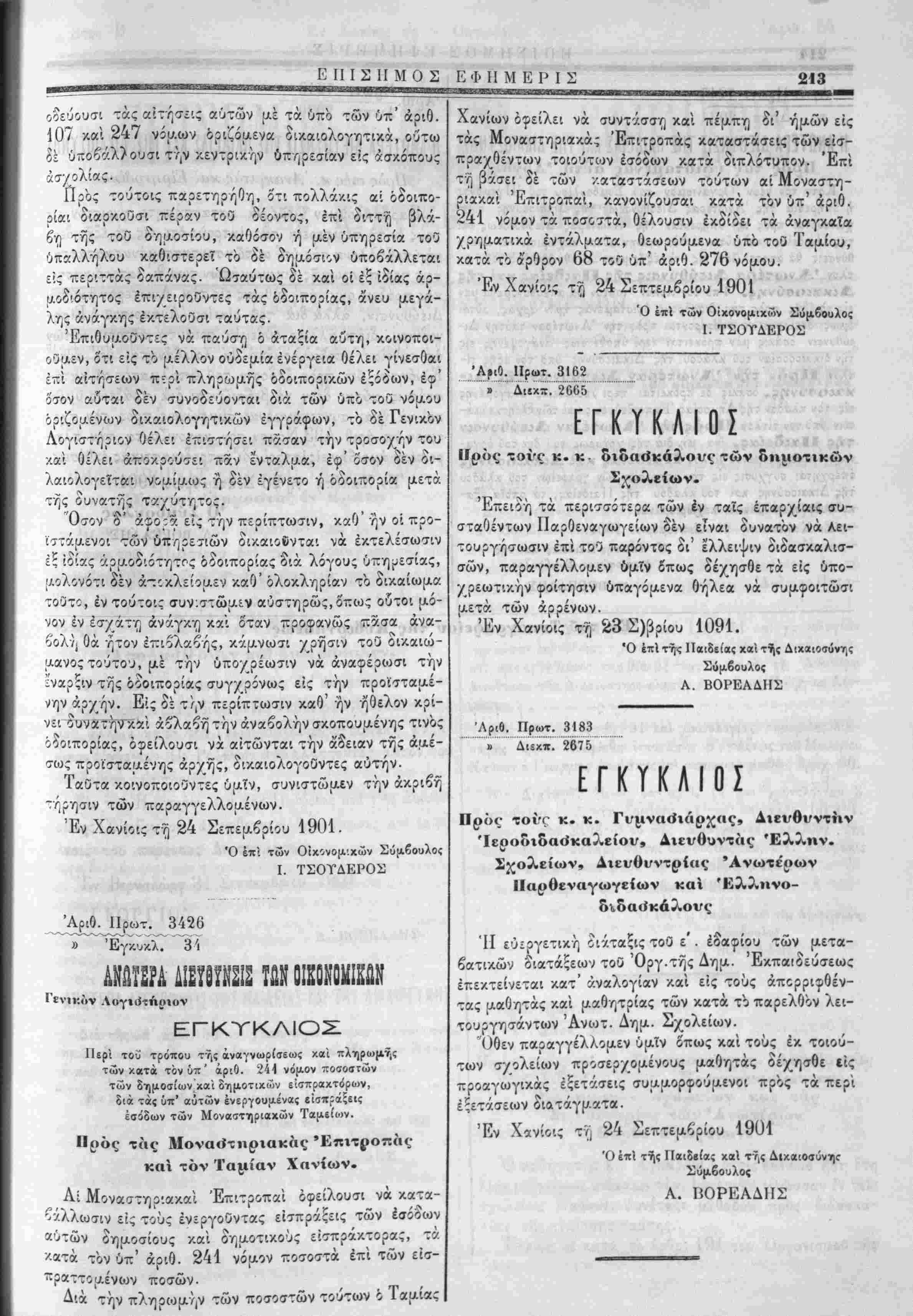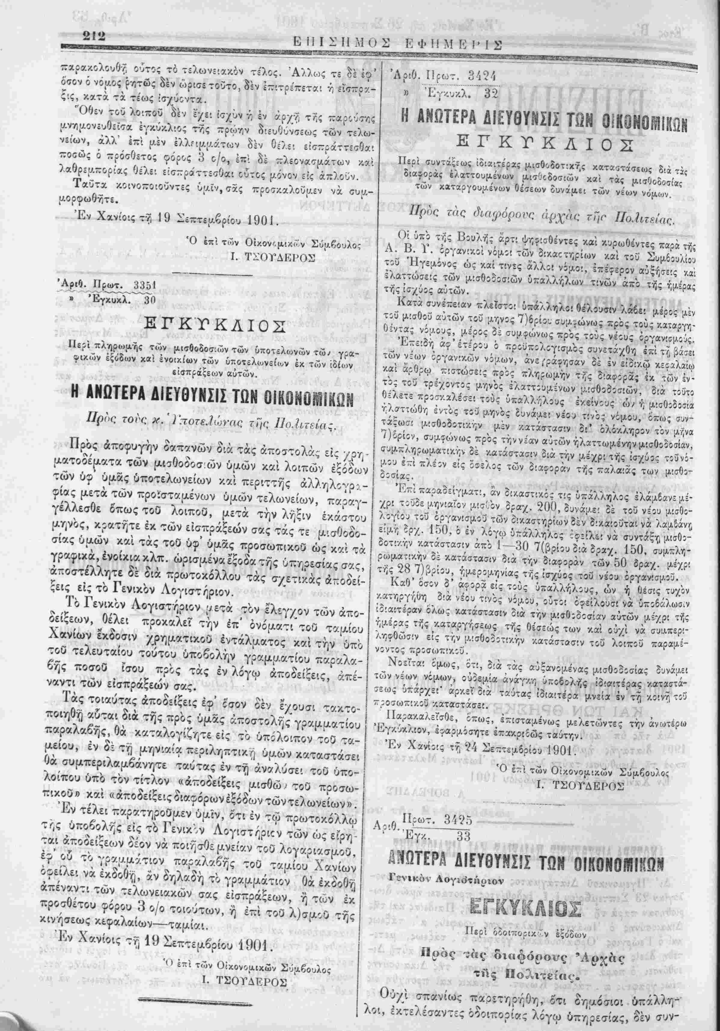)αθρ5(Λπορίας θέλει εϊ<™ράττεσθαι ούτος μόνον ε·<: άπ-ίουν. Ταυτα κοινοποιοΰντες υμίν, σας προσκαλούμεν νά συμ¬ μορφωθήτε. Έν Χανίοις τνί 19 Σεπτεμβρίου 1901. Ό επί των Οικονομικήν Συμβουλάς Ι. ΤΣΟΥΔΕΡΟΣ Άβι9. Πρωτ. Π7ΤΤΙΓΤ Αριθ. Πρωτ. 3424 » Ένκ.υζλ. 32 , Μ Η ΑΝΩΤΕΡΑ ΔΙΕΥΘΥΝΣΙΣ ΤΗΝ ΟΙΚΟΝΟΜΙΚΟΝ ΕΓΚΓΚΛΙ02 Περί συντάξ:ως ιδιαιτέρας μισθοδοτικτ,ς καταστάσεως διά τας διαφοράς έλαττουμένων μισ'.'οδοσΐών καί τάς μισθοδοΐίας των καταργουμενων θέσεων δυνάμει των νέων νόμων. τας διαφόρους τηο ΠοΜτει'ης. 3_35' 30 ΕΓΚΎΚΛΙΟΝ Περί πληρωμάς των μισβοδοσ.ών των ΰποτελο-.νών τώ/ γρα- φικών έξόδωγ χαΐ ένοικίων των ύτιοτελ<υνεί<υν έκ των ιδίιον εϊσπράξεων αυτών. Η ΑΝΩΤΕΡΑ ΔΙΕΥΘΥΝΣΙΣ ΤΩΝ ΟΙΚΟΗΟϋΚΰΝ Πρός τθΓθ, χ. 1'ποτε.ν'·>ναο, τΓμ; Πο.ΙυτΓία:.