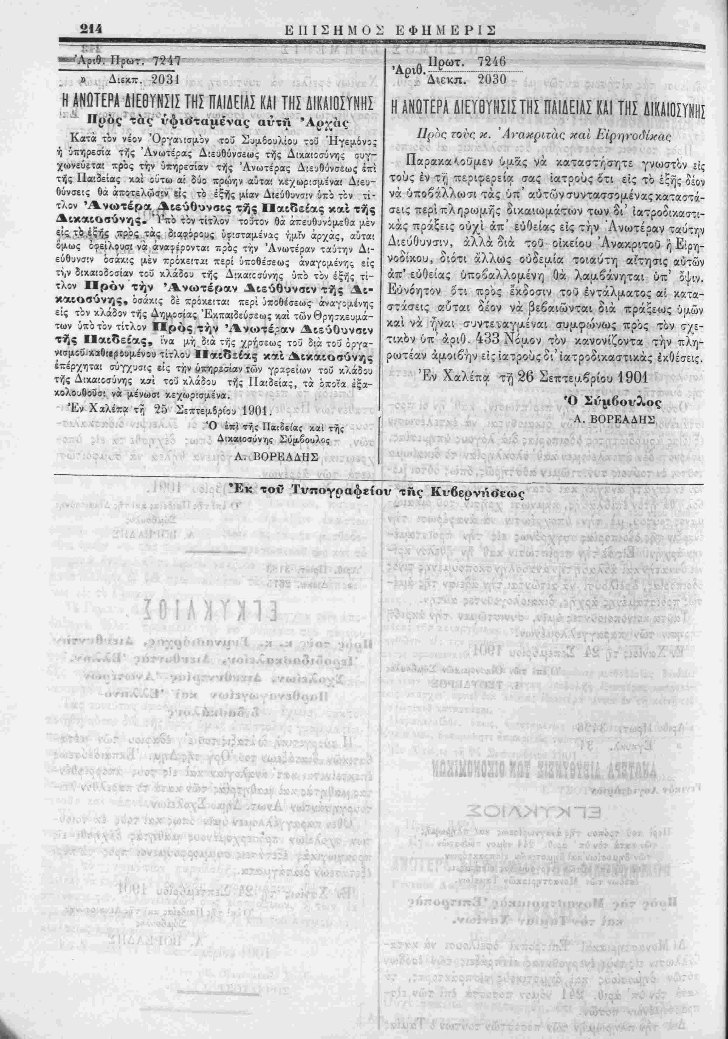 καΐοσύνης, όσ/.:ς δέ πρόκειτα: περΐ υποθέσεως άναγομένης είς τόν κλάδον τής Δημοσίας Έλΐταιδεύσεως καί τώνθρητκε.ιμ.ά- των όπό τόν τίτλον Πρός την Ανωτέραν Διεύθυνσιν τής Ηαΐδείας, 'να μη §'α τΛ,ς χρήσεως τ:ϋ οιζ το3 όργα- δ χρ ργ καθ'.ερουμένου τιτλοο Παιδείας καί Δικαιοβύνης έπέρχητα: σύγχυσις είς την υπηρεσίαν των γραφείων τοϋ ν.λάδίυ τής Δΐκαΐοσΰνης κ»ΐ το3 κλάδοο τής ΙΙαιδείας, τα όποΐα έξα- κολθυθοϋσ'. νά μένωσ! κεγωρ'σμένα. ,· ΈνΧαλέπατή 25 Σ5πτε;ο.6?'οο 1901. Ό επί τής ΙΙαιδει'ας καΐ τήί χ ^ ν, Δ'καιοσύνης Σύμβουλος Α. ΒΟΡΕΑΔΗΣ Πρωτ. 7246 ■****»«*- ^*Β»«««Β!κ««&ε»—-ρ- Διεκπ. 2030 ,,ν -. Τί-ΐ».',. Η ΑΝΟΤΕΡΑ ΔΙΕΥΘΥΝΣΙΣ ΤΗΣ ΠΑΙΔΕΙΑΣ ΚΑΙ ΤΗΣ ΔΙΚΑΙΟΣΥΝΗΣ ΠρϊΊο τονς κ. Λνακριταο, καί Είρηνοόίκαο, Παρακαλούμεν υμάς νά καταστήσητε γνωστόν είς τοϋς έν τ?) -εριφερεία σας ίατροϋς ότι είς τό εξής δέον νά υποβάλλωσι τάς ύπ' αυτών <τυντασ·σομένας καταστά¬ σεως ·περί πληρωμάς δικαιωμάτων των δι ίατροδικαστι- κάς πράξεις ούχι άπ' εΰθείας είς την Ανωτέραν ταύτην Διεύθυνσιν, άλλά διά τοθ οίκείου ΆνακριτοΟ η Ειρη- νοδίκου, διότι άλλως ούδεμία τοιαύτη αίτησις αυτών άπ' εύθείας ύποβαλλομέν/) Οά λαμβάνηται ύπ' όψιν. Ευνόητον ότι πρός έκδοσιν τοθ έντάλματος αί κατα- στάσεις αύται δέον νά βεβαιώνται διά πράξεως υμών καί νά ΐ^ναι συντειαγμέναι συμφώνως πρός τόν σχε¬ τικόν υπ' αριθ. 433 Νόμον τόν κανονίζοντα την πλη- ρωτέαν αμοιβήν είςίατροϋς'δι'ίατροδ'.καστικάς εκθέσει;. Έν Χαλέπα τ?) 26 Σεπτέμβριον» 1901 ,,-.-,- Ό Σύμβουλος ο) 'Ν ,.' '^'-ν^.χΊό ^;Α- ΒΟΡΕΑΔΗΣ ( , -» >: -ΐ/.','-ν ΐ'3 ;ν.'ζοπιο;ί ίΐ7^Γ?^οο^ο ;