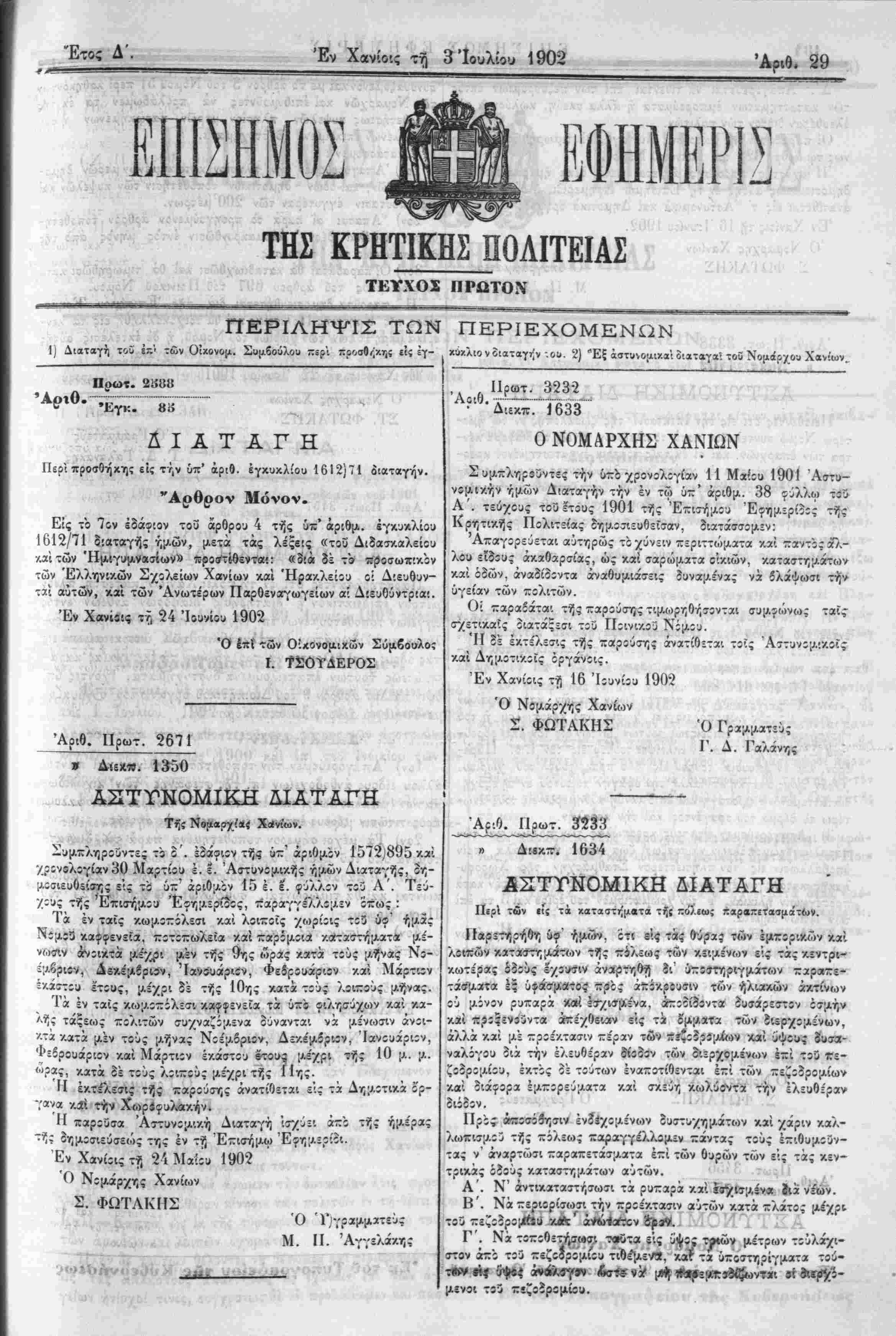 1) Διαταγτ) τοϋ Ιγ.'· τδν Οίχονομ. Συμβοΰλου περ'ι προσβί,χης άς έγ- χ·.»λιο ν διαταγήν ου 2) Έξ αστυνομικαί δ-αταγα- τοίί Νομάρ/ου Χανίων.