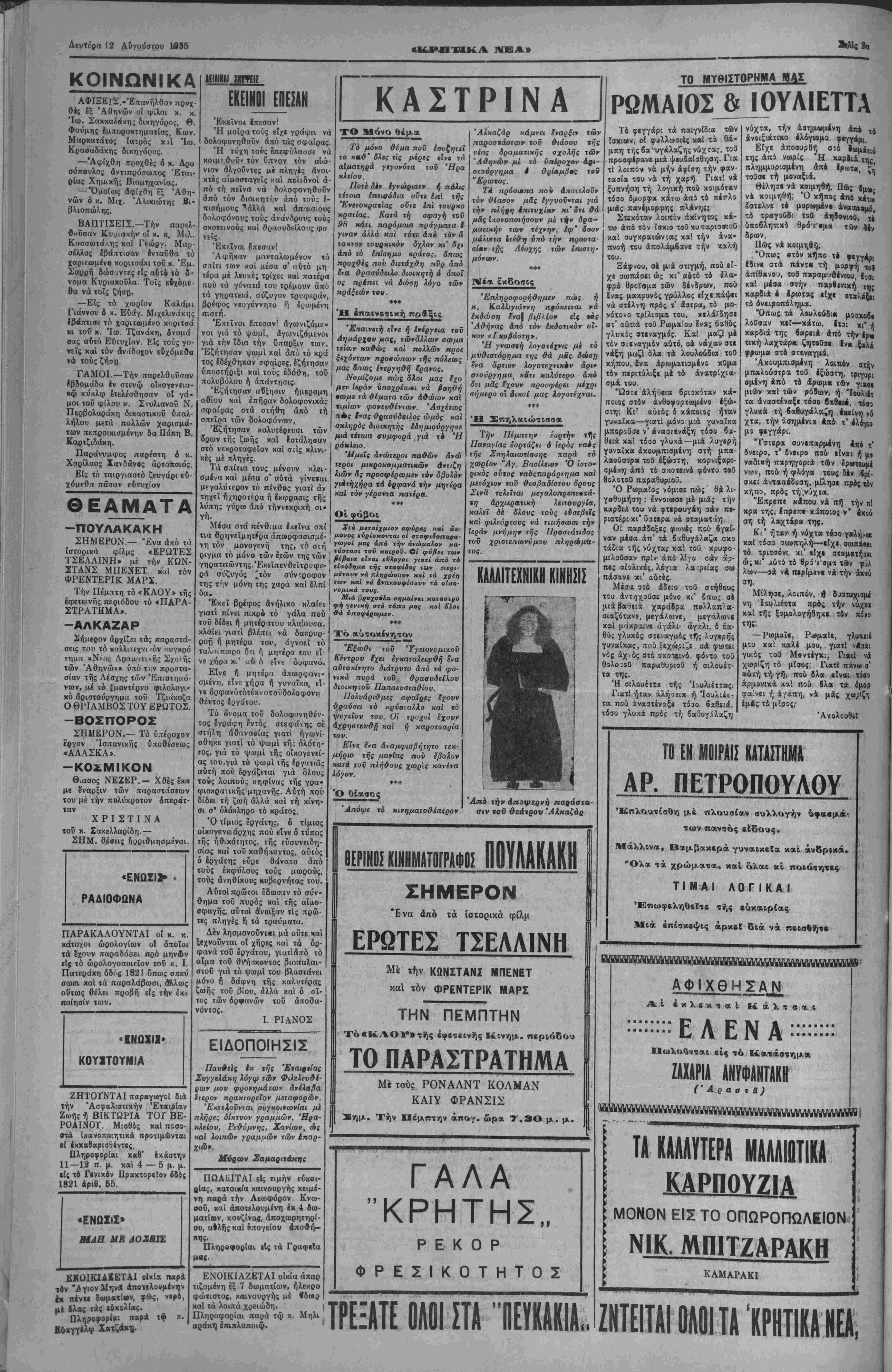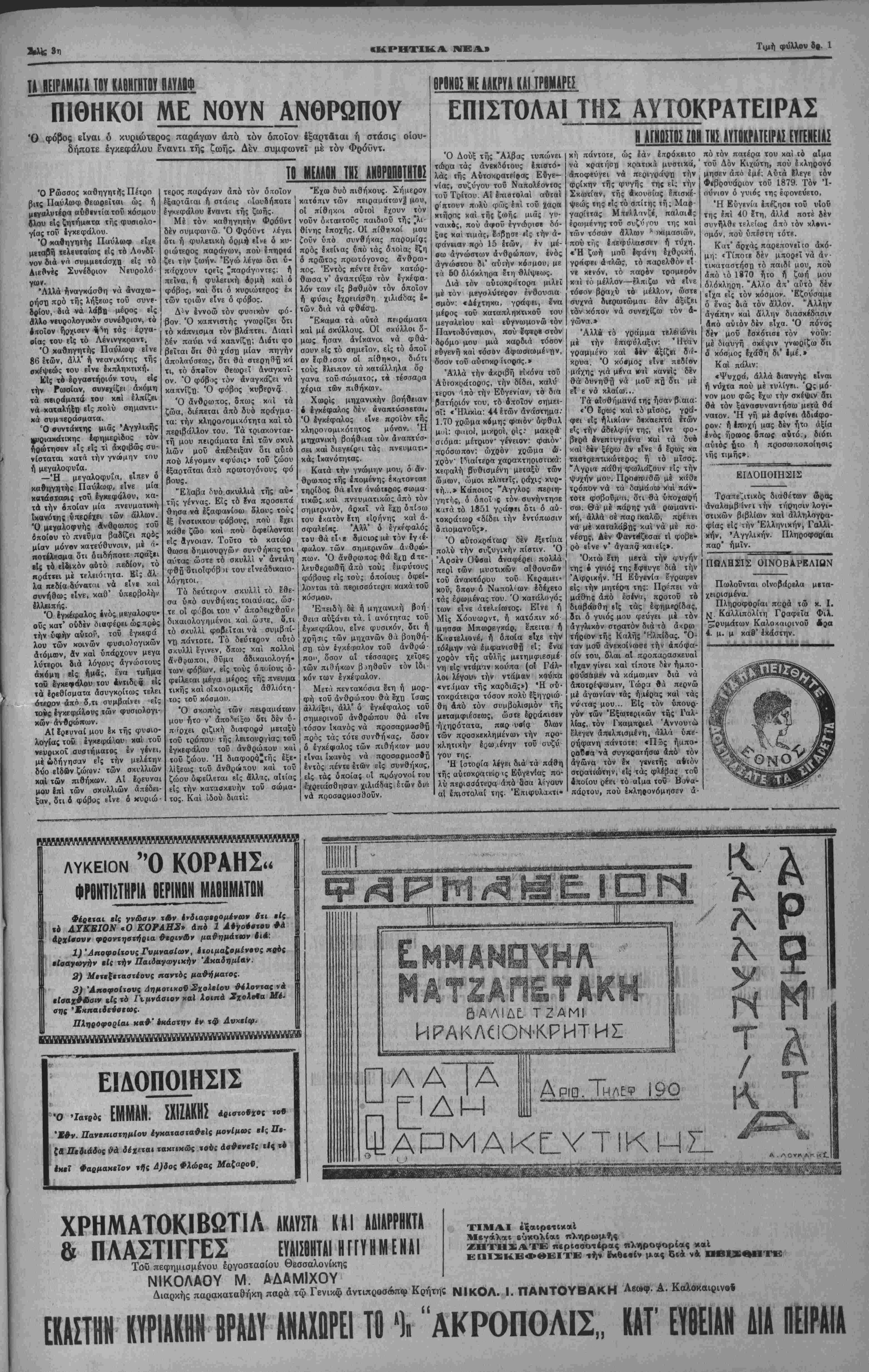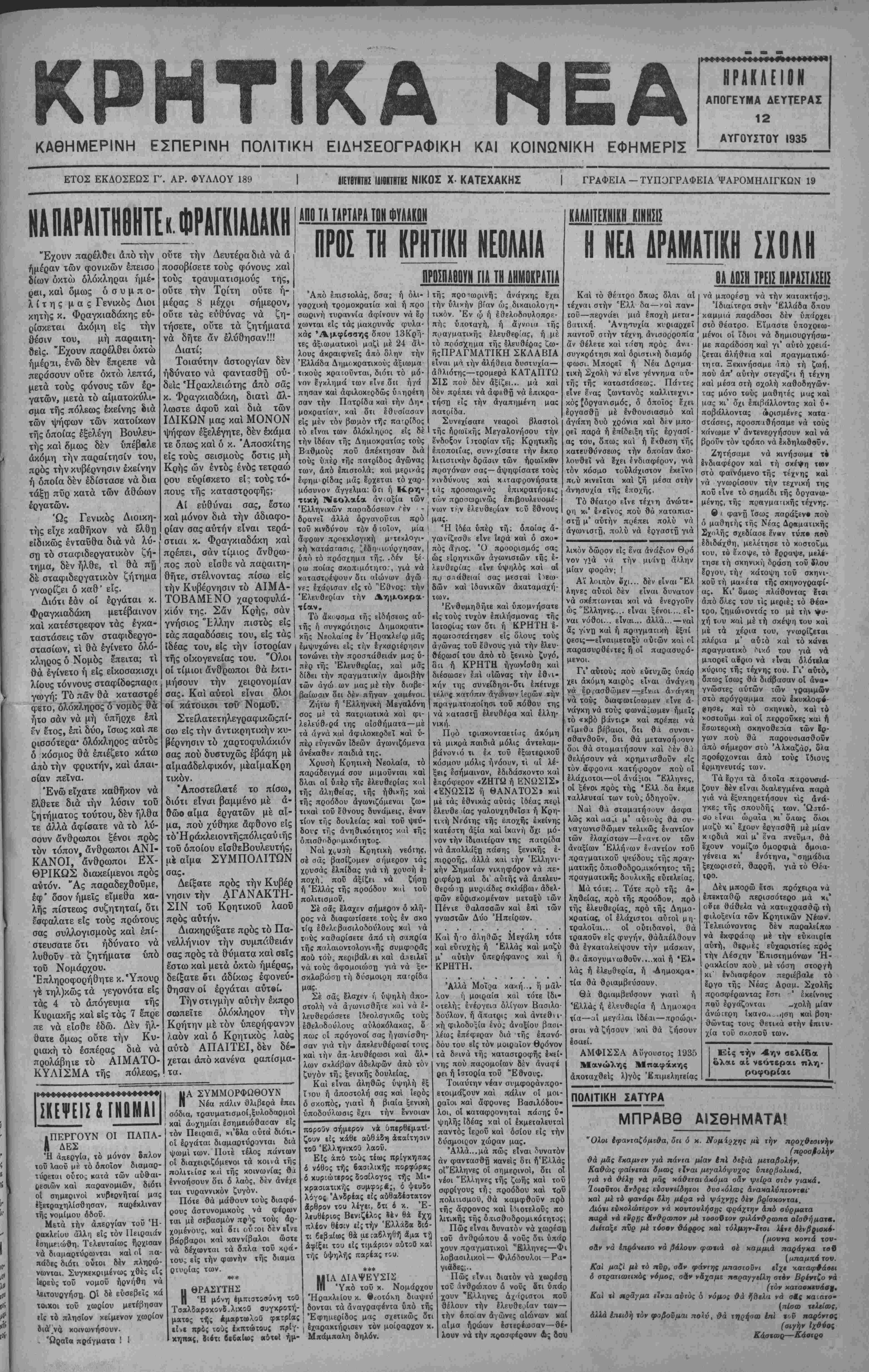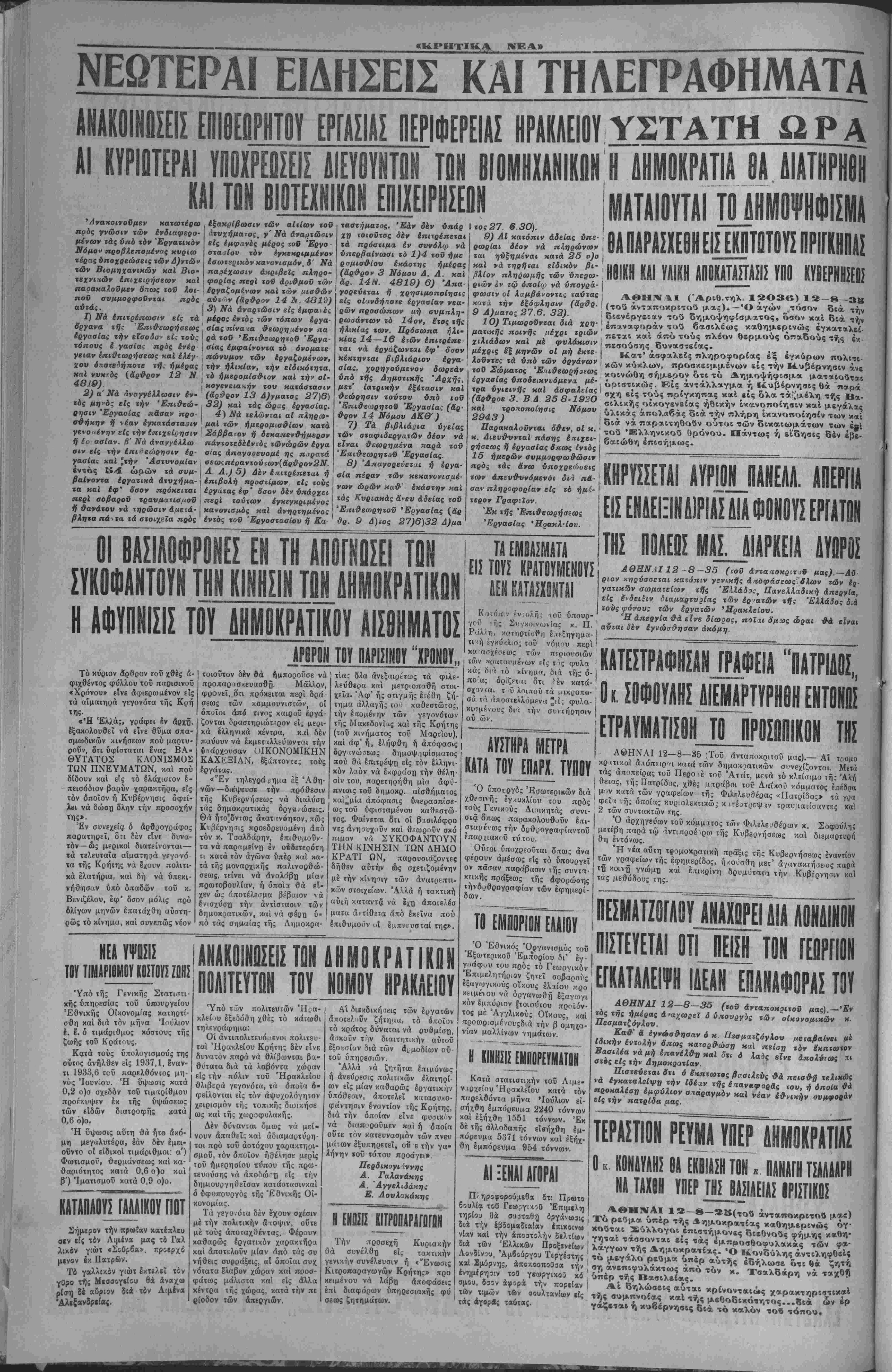 ' διενέργειαν τοΰ δημοψηφίσματος, όσον *<αί βς» χήν ' επαναφοράν τού βασιλέως καθημερινώς έγκατ»λβ£- πεται καί άπό τούς πλέον θερμούς όπαδούς τής ένι- ι πεσούσης δυναστείας. | Κατ' άσφαλεϊς πληροφορίας έξ έγκύρων πολιτι¬ κών κύκλων, προσ*βιμμένων είς την Κυβέρνησιν άνε κοινώθη σήμερον ότι τό Δημοψήφισμα ματαεοΰτ&ι Ι οριστικώς. Είς άντάλλαγμα ή Κυβέρνησις θά "παρά ' σχη είς τούς πρίγκηπας καί είς όλα τά^μέλη τής Β*· σιλικής οικογενείας ηθικήν ικανοποίησιν καί μεγάλας . υλικάς άπολαβάς διά την πλήρη ικανοποίησιν των κ»ί ' διά νά παραιτηθοβν ούτοι των δικαιωμάτων των έΐί ' τοΰ Έλληνικού Ορόνου. Πάντως ή είδησις δέν έβι- βαιώθη επισήμως. ΚΗΡΥΣΣΕΤΑΙ ΑΥΡΙΟΙΠΑΝΕΛΙΊΈγΪΙΪΙ Ε!Σ ΕΗ4ΕΙΞΙΗΔ1ΡΙΛ.Σ ΔΙΑ ΦΟΝΟΥΣ ΕΡΓΑΤΠΗ ΤΗΣ ΠΟΛΕΩΣ ΜΑΣ__ΔΙΑΡΚΕΙΑ ΔΥΟΡΟΣ ΑΘΗΝΑΙ 12 -8- 35 (νοϋ ά ντα ιτοκρ ιτιϋ μας).—Δϋ ριον χηρύασεται κατόπιν γενικάς αποφάσεως.όλον των έρ- γατιχδν αωματείων τής 'ΕΙΙάδπς, ΠανεΙίαδιχή άιτεργία, είς ένδειξιν διαμαρτυρίας των έρ ατών τή"; Ελλάδος διά τούς φόνου; των έρνατών Ηρακλείου. Ή άηεργία ΰ·ά είνε δίωρος, πθΐιι δμοος ώοαι Θά είναι αυται δεν εγνώσθησαν άκόμη. ΚΑΤΕΣΤΡΑΦΗΣΑΝ ΓΡΑΦΕΙΑ ΠΑΤΡΙΔΟΣ, Ο κ. ΣΟΦΟΥΛΗΣ ΜΡΤΥΡΗΟΗ ΕΝΤΟΝΟΣ ΕΤΡΑΥΜΑΤΙΣΘΗ__Τ0_ΠΡ0ΣΟΠΙΚΟΝ ΤΗΣ ΑΘΗΝΑΙ 12—8—85 (Τού άνταποκρϋοϋ μας).— Αί τς,ομο κρηικαί απόπειραι κατά των δημοκρατικήν συνεχίζονται. Μετά τάς αποπείρας τοΰ Περο-.έ τοΰ Άττίτ, μετά τό κλείσιμο τής Άλη θείας, τής Πατρίδος, χθές μπράβοι τον Λαΐκοΰ «όμματος έπέδρα μόν κατά των γραφείων τής Φιλελευθέρας «Πατρίδος» τα γρα φεΐ ι τ,ή; δποί-<ς κυριολεκτικώς κ ιτέατρρψ αν τραυματίσαντες καί 2 των συντακτών της. 'Ο άρχηγίύων τοΰ κόμματος τοίν Φιλ,ελειιθέρων κ. Σοφούλη; μετέβη παρά τώ άντιπροέ ιρω τής Κυβερνήσεως καί διεμαρτυοη ση εντόνως. _ Ή νέα αυτή τβομοκρατική πράξις τής Κυβερνήσεως εναντίον των γραφείων τής εφημερίδος, ιμοιισθη μεΐ' άγανακτήσεως παρά ΤΉ κοινη γνωμη καί έηικρίνη δρυμύτατα την Κυβέρνησιν καί τας μεθόδους της. ΠΕΣΜΑΤΖ6ΓΑ0Υ_ΑΝΑΧΟΡΕΙ ΔΙΑ ΛΟΝΔΙΝΟΝ ,ΠΙΣΤΕΥΕΤΑΙ ΟΤΜ!ΕΙΣ| ΤΟΝ ίΕΟΡίΙ ΕΓΚΑΤΑΛΕΙΨΗ ΙΔΕΑΝ ΕΠΑΝΑΦΟΡΑΣ ΤΟΥ ΑΘΗΝΑΙ 12—8-35 (,ού άνταποκοιτού μας).-'ί?ν τος τής ημέρας ά'αχωρεΐ ά ύπουργύς των οίκονοαικών α. Πεσματζόγλον. Κα& & εγνώσθησαν ό κ Πεαμιτζόγλου μβϊαβαίνει μέ Ιδικήν εντολήν δπως κατορθώση καϊ ηείαΏ τόν Ζχπτωην Βααιλέα νά μή έπανέλθ» καϊ δχι ό λαός είνε απολύτως πι στός είς την Δημοκρατίαν. Πισχεύεται δτι ό έκπτωτος βασιλεύς θά ηειαθϋ τβλικώς νά εγκαταλείψη την Ιδέχν τής έηανιφορ&ς τού, η ΟΛθία θά προκαλέση εμφύλιον στιάραγμόν καί νέαν εθνικήν συμφοβάν είς την πατρίδα μας. ΤΕΡΑΣΤΙΟΝ ΡΕΥΜΑ ΥΠΕΡ ΔΗΜΟΚΡΑΤΙΑΣ ΟκΚΟΝΑΥΑΗΣΟλΕΚΟΙΑΣΗΤΟΝ,ΙΙλΝΑΓΗΤΣΙΑΑΑΡΗ ΝΑ ΤΑΧΘΗ ΥΠΕΡ ΤΗΣ ΟΑΣΙΑΕΙΑΣΙΡΙΣΤΙΚΒΣ ΑΘΜΝΑΙ 1*-β-»Κ(χού άνταποκριτού μαβ) Το ρεΰμα υπέρ τής Δημοκρατίας καθημερινώς ογ¬ κούται Σύλλογοι επιστήμονες διεθνούς φήμης καθη¬ γηταί τασσονται εις τάς εμ«ρΟαθοφυλακας των φ*- λαγγωντής Δημοκρατίας. Ό Κονδύλης άντιληφθείς το μεγαλο ρεύμα υ«έρ αυτής εδήλωσε ότι θα ζητή ση ανεπιφυλάκτως από τόν κ. Τσαλδάρη νά ταχθή υπέρ τής Βασιλείας. ^ 4 Αί δηλώσεις αυται κρίνονταιώς χαρακτηριστικαί τής συμπνοίας καί τής μεθοδικότητος...διά ών έρ γαζεται η κυβέρνησις διά τό καλόν τοβ τόπου.