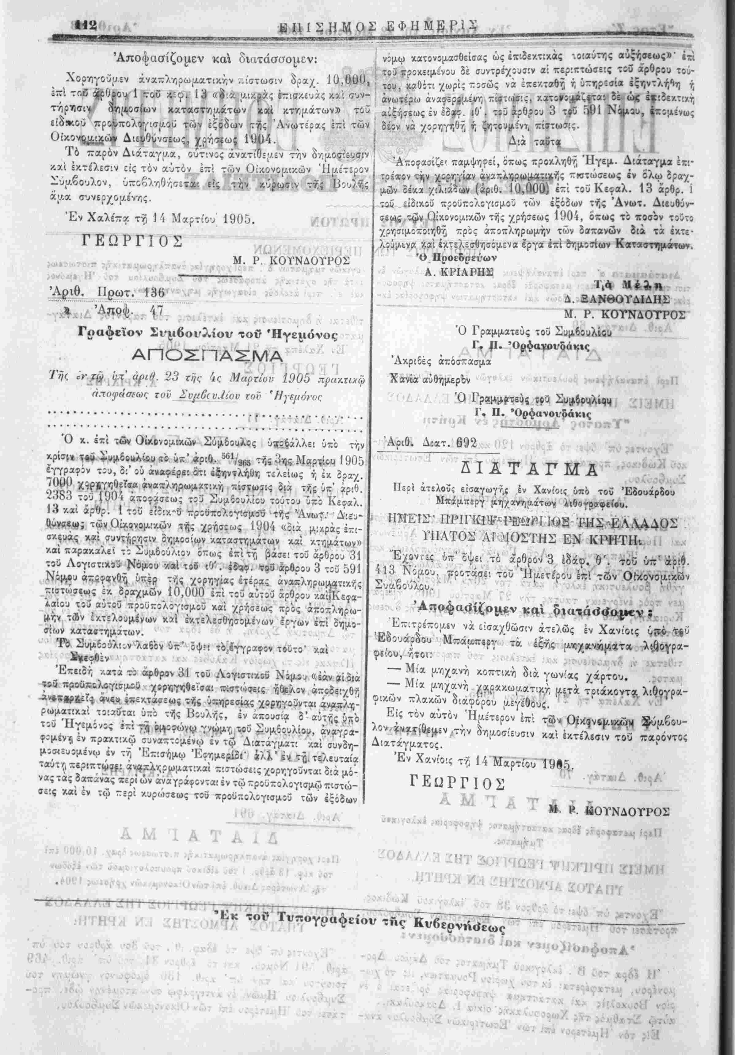λον ^<νι«.ϊ·ίθεμεν την δημοσίευσιν καί εκτέλεσιν τού παρόντος Διατάγματος. Έν Χανίοις τί, 14 Μαρτίου ΓΕϋΡΓΙΟΣ Ρ-. ΚΟΥΝΔΟΥΡΟΣ 7 / ■ .... ' / ι ΫΊ/ΠΠΠ 2Ι3ΜΗ ·;/ 2ΟΤΑΙΙΪ Η1! •Εκ τοϋ Τυπογραφείον της Κν6ερν»ί<ίεως Γ ι ι . • ί <ί ^τ χςδ'Ι Η" . νότ ?·