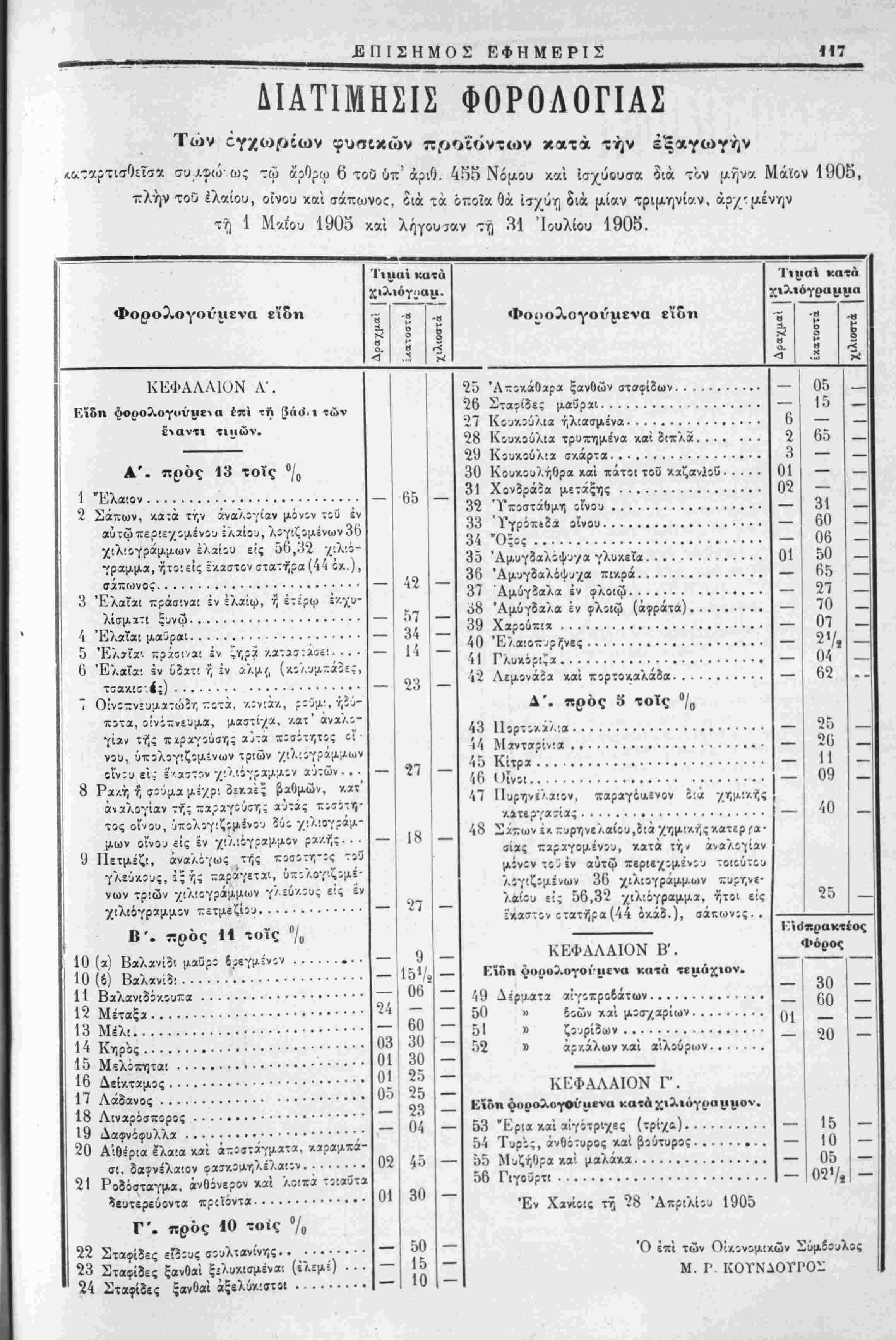< 02 01 65 42 34 Π 23 18 27 _____ ι δ*/Β 06 2 4 60 03 30 ΟΙ 30 ΟΙ 25 05 25 23 04 45 30 50 15 10 Φοηολογούμενα ειδή κατά 25 Άπίκάθαρα ξανθών σταφίδων........... 26 Σταίίδες μαύραι................... 27 Κευκίύλια ήλιασμένα................ 28 Κουκοΰλια τρυχημένα καί διπλά....... 29 Κουκίύλία σκάρτα.................. 30 Κουκΐυλήθρα καί πάτοι τοΰ καζανΐοϋ..... 31 Χονδράΐα μετάξης................. 32 ΥποστάΙιμη οίνου.................. 33 Υγρόπ&δα οίνου................... 34 'ΟΧος........................... 35 Άμυγδαλΐψυ'/α γλυκεΐα.............. 36 Άμυγδαλόψυ'/α ~ικρά............... 37 Άμύγϊαλα έν φλοιώ............... ο8 Άμύγδαλα έν φλοιω (άφράτα)......... 39 Χαροΰπία........................ 40 Έλα:οπυρί|νες..................... Ί1 Γλυκόριζα........................ Ί'2 Λίμονάία καί πορτοκαλάδα........... Α'. πρός ί> τοίς °/0