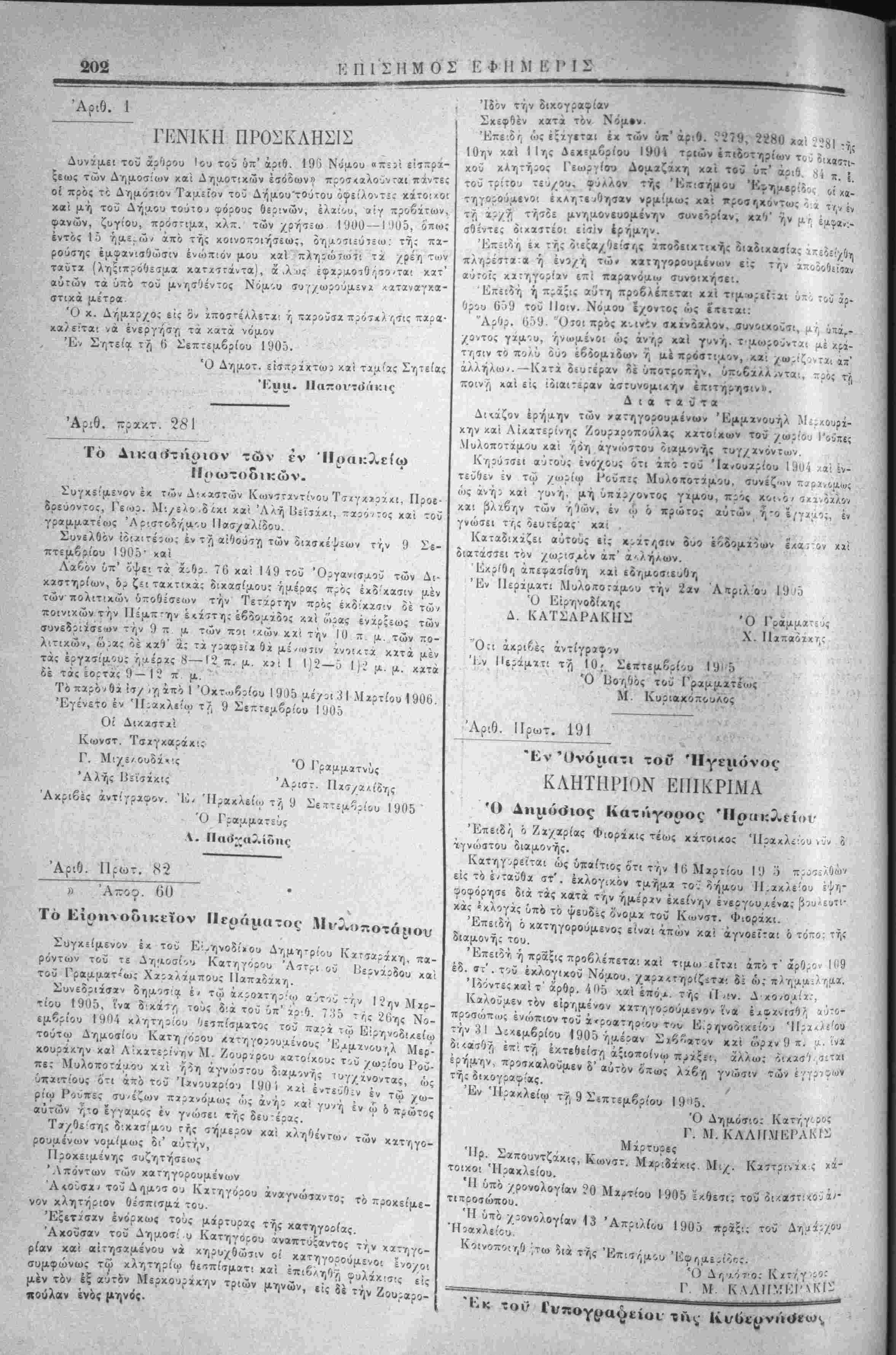 Τόπϊρό/θά 17/ <γιϊπό 1 Όχτ.οβίίου 1905 μβ/^31 .Μζρτίου 1906. Εγένετο έν ΊΙ-αχλϋ'ω τ?, 9 ΣίττΓϊμβρίου 1905 Οί Λικχστ*! Κωνστ. Τσΐγκαράχις Γ. Μιχί/ουδά^'ί Ό Γραμμΐτνϋς Άλής Ιίεϊσάχις Άριστ. ΙΙχσ/α/ι'δτ,ς Άχριβές άντί-,'ρϊβον. Ίΰ< ΊΙραχλεί<ο τ7, 9 ϊεττία' Ό Γραμμβτείις '■ Λ. 11<ιο;;αλίόιι<; 1905 Άρι9. Πρωτ. » Ά-οφ- 60 Τό Εί£>η%οοικεϊον