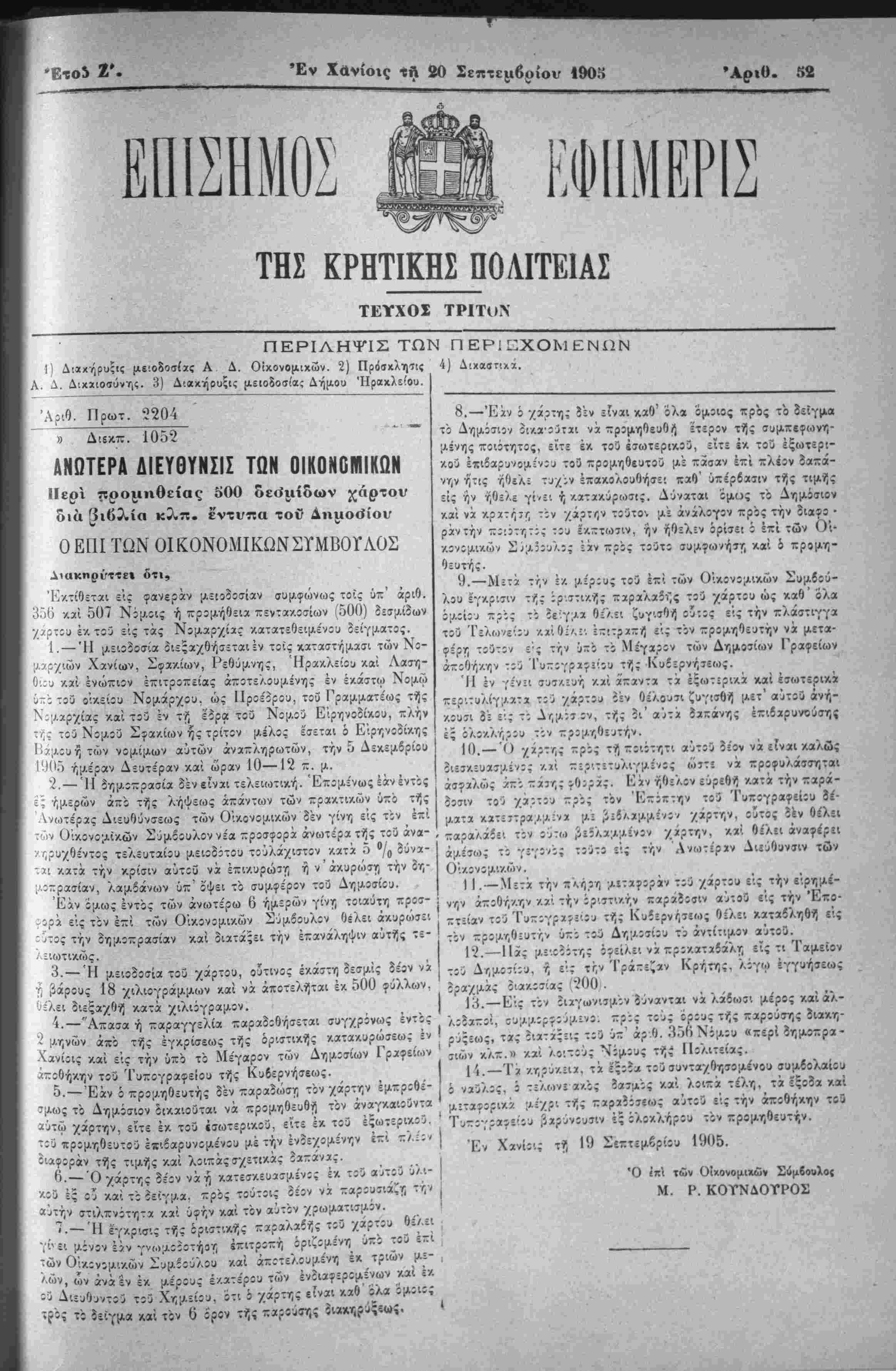 !' Διαχήρυξις μειοδοσίαι; Α Δ. Οικονομικόν 2) Πρόσκλησις 4) Διχαστιχά.