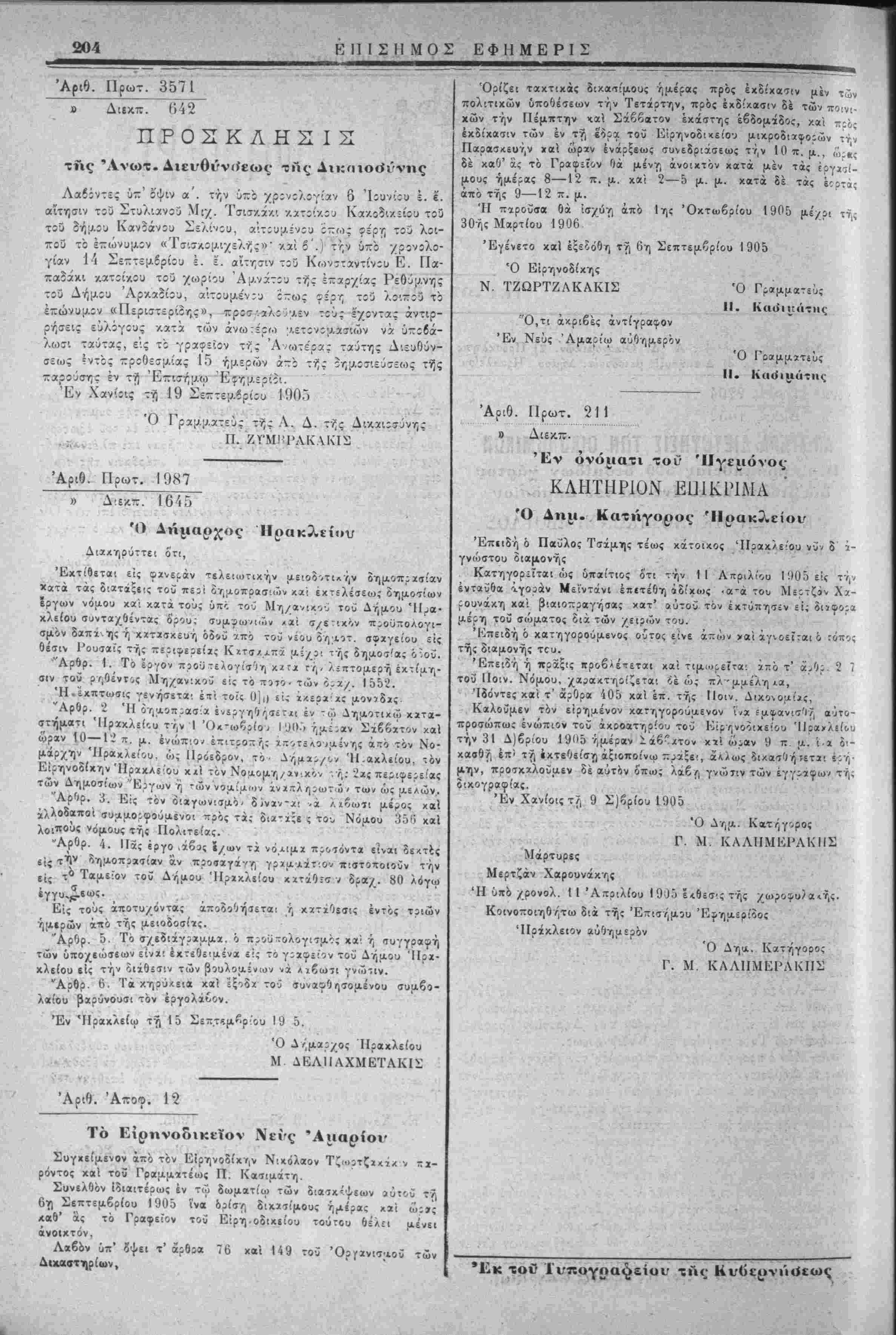 Άρ^ρ. 3. Είς τόν όιΐγων!ΐμό< δ<νχν-ί[ -ά λχβωτι μέρος χαϊ χλλοδα—αί συαμορφούαενοι ττίός τάς διϊ-χςε ς τον, Νόμου 35*5 χαί χοιποΰί ■"όμους τής Πολιτείας. "Αρθρ. 4. Πάς έργο ίάβυς ϊ/ιυν τα νόχιμχ προιόντα είναι 8ε<τ£ς είς τ^ν δημοπρασίαν αν προσαγάνν; γρχμαάτ'.ον πιστοποιοϋν την ει, ι0 Ταμείον τοϋ Δήμου ΊΙρχχλείου χχτάθ:<7 ί δρα/. 80 λ γυ^ Είς τούς άποτυ/όντας άποδοθήσεται 7) χχτχθεσΐς έντός τοιών ημερών άπό τής μειοδοσίχς. "Αρθρ. δ- Τ° σ/εδιάγρααμΐ, ό π^οίιτολογι-ΐμός χα' ή συγγραφή των ΰΛθχιώσβων είναι έχτεθειαέν* ε!ς το γ;α<ρείον τοϋ Λήμου Ηρα¬ κλείου είς την ίιάθίϊ'.ν των βουλοαένιον ^ά Αιβωτι γνώιιν. Άοθρ. 6. Τα χηούλεια χά! εξοδχ τοϋ συνααΌησομένου συμξο- λβίου βαρύνουσι τόν έργολάίον. .....' Έν Ηρακλείω τ^ 15 19 5. Ό Λ/,μαο/ος Ηραχλείου Μ ΔΒΛΙΙΑΧΜΕΤΑΚΙΪ Άριθ. 'Αποβ. 12 κ V Τό Εΐρηνοδικεϊον Νενς 'Αιιαρίον Συγχείμίνον άπό τόν Εϊρηνοδίχγ,ν Ν'.χόλαον Τζιο^τζχχγχ ν πα¬ ρόντος χαϊ τοΰ Γραμματέως Π. Κατ,ιιμάτη. Συνελθόν ιδιαιτέρως έν τώ δωματίω των δ!αιχ='ψεων αύτοϋ τλ 6»ι Σεπτεμβρίου 1905 ϊνα δρίσ'Λ, δίχχιίμους ημέρας χΐ'ι ώ;»ς Λαθ' άς τό Γραφειον τοΰ Είρη.οδιχείου τούτοΐ) θε'λει μένει ανοικτόν, Λ«6όν ύπ' δψει τ' άρθρα 76 χαϊ 149 τού Όρνανισαοϋ των Δικαστηρίων, Όρίζει ταχτιχάς δικααίμους ημέρας πρός έχδίχασιν μέν των πολιτικών ΰποθέτεων την Τετάρτην, πρός έχδίκασιν δέ των πο;νι- κών την Πέμπτην χαί Σάββατον έκάστης εβδομάδος καί ■πζ'ος έχδΐχασιν των έν τϊ| *ίρα τοϋ Είρηνοδιιιείου μιχροδιχφορών ττν Παρασκευήν χαί ώρχν ενάρξεως συνεδριάσεως την 10 π. μ., ώ^«ς δέ καθ" άς τό Γραφεί&ν θά μέν/; ανοικτόν χατά μέν τάς έργχιί- μους ημέρας 8—12 π. μ. χαϊ 2—5 μ. μ. χατά δέ τάς είρτάς άπό τής 9—12 π. μ. Ή παροΰσα θά ίστιΐγι άπό 1ης Όχτωβρίου 1905 μέ/ρι τγς 30ής Μαρτίου 1906 "Εγένετο καΐ εξεδόθη τ7) 6η Σεπτεμβρίου 1905 Ό Είρηνοδίκης Ν. ΤΖΩΡΤΖΛΚΑΚΙΣ Ό,τι άκριβές αντίγραφον Έν Νεύς Άμαρίω αυθημερόν Ό Γραμματεύς II. Καιίικάτιις Ό Γοαμματϊΰς II. Καιίι«ιάτκι; Αριθ. Πρωτ. 211 φβ- Διεκπ. - - (. » Έν ονόματι χον ΊΙγεμόνος ν< . ΚΑΗΤΗΡ1ΟΝ ΕΙΠΚΡΙΜΑ Ό Δημ. Κατήγορος Έπίΐδή δ Παϋλος Τσχμης τέως χάτοιχος ΊΙραχ/ε'Όυ νϋ/ δ ί- γνώστου διαμονής Κατηγορ-Τται ώς ΰπαίτιος ότι την II Λπριλ'Όυ 1005 είς τή/ ενταύθα Ίγουάν Μεϊντάνι επετέθη ϊδίχοις <α'ά τού Μερτζάν Χα- ρουνάχη καί βιαιο-ραγήσας χατ' »ΰτοϋ τον έκτύπηΐίν εί; δυφορα μέρη τοϋ σώματος διά των /ειρών τού. 'Κπειδή ό κατηγορούμενος ούτος είνε ά~ών χά! άγνοεϊται Ό :όπο; τής διαμονής τοιι. 'Επειδή ή πράξις ηροβΑέτεται χαί τιμι,ιρεϊτα; από τ' ά>Ορ 2 7