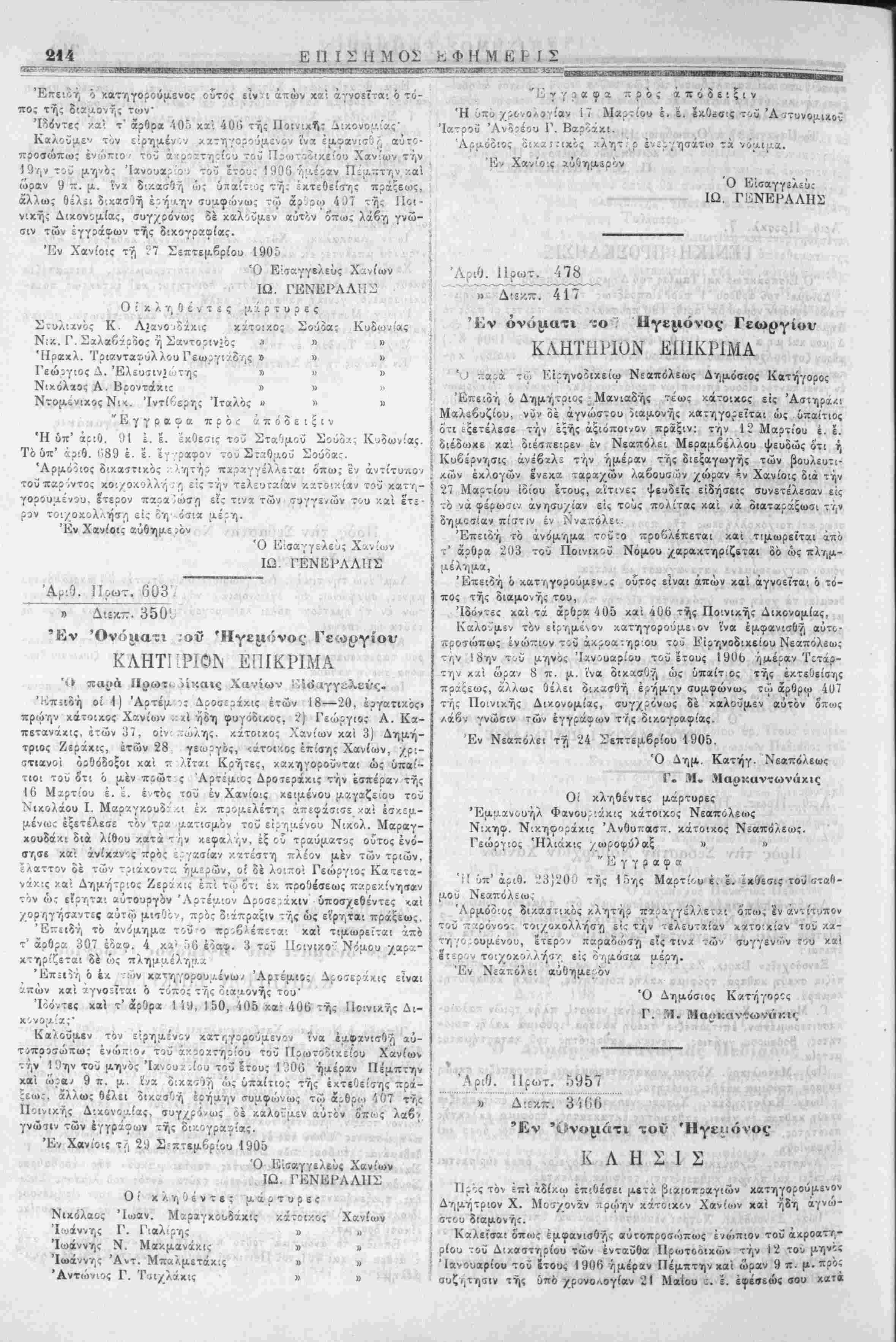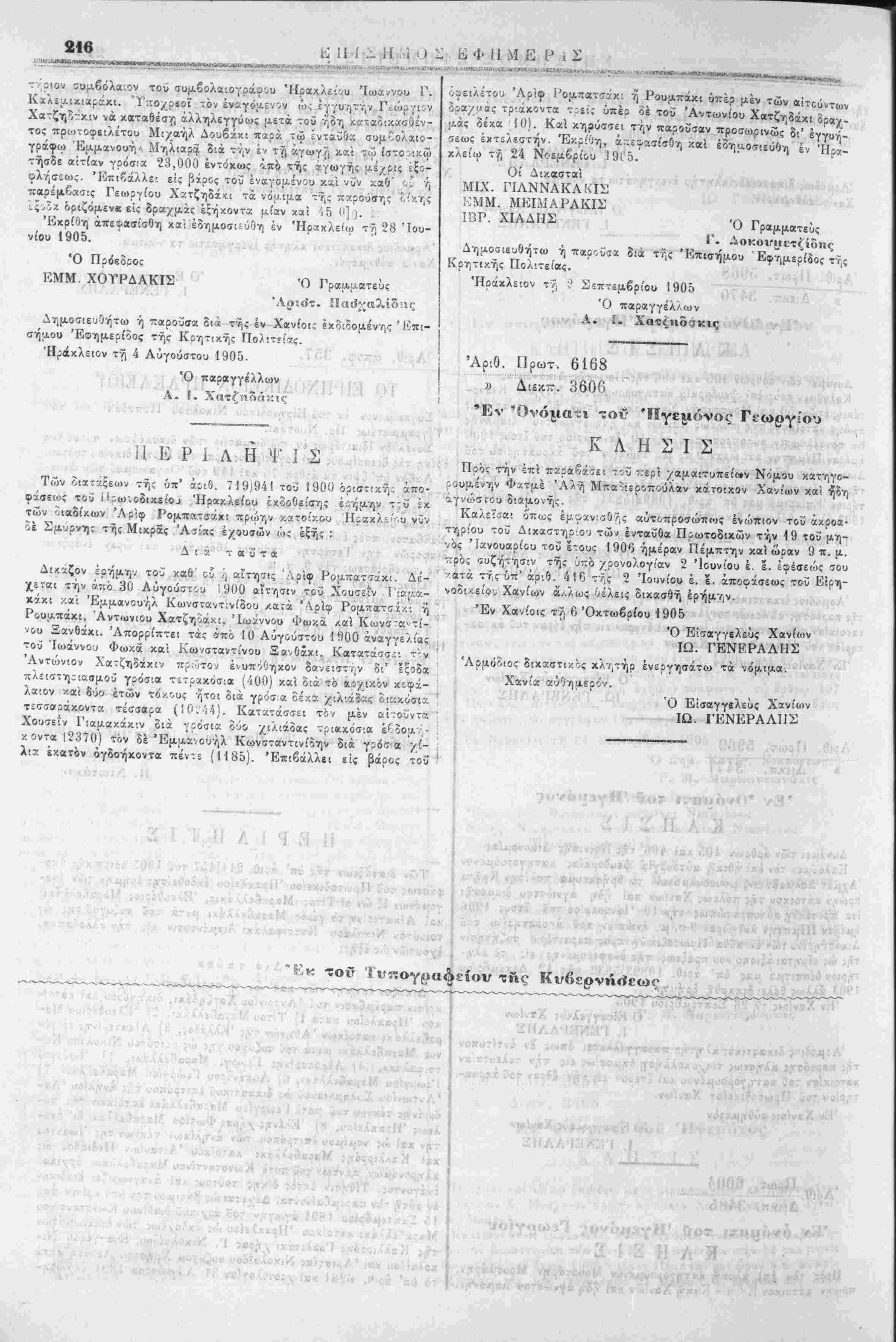 ϋν <ΐ), εγ/υητ.*ν Ι Χα-ζηΐ Χ'.ν νά καταθέση αλληλεγγύως μετα τού ηδη κκ.αί τος ιτριοτοφί'.λέτου Μι/α-ηλ Λ;υβϊχι παοά τώ -νταΐθχ συμίθλχιο- γράφω Εμμανουή Μ.7]λ(3 9φ δια την ί' τί] αγοιγ/, κ»! τω ίατο 'κω τησδε α'τίαν γοόσ'α 2 3,000 έντόχως Ίπό τής »^ωγής υ.έ/2ΐς εζο— ^γ η είς βΐρος τοΰ ένα^ομένου χϊϊ νυ παρεμ£ασ·ς Γεωογίου Χ?τζηδίχι τάνάιιψα τ7(ς — .;^~/ όριζομεν* ε·ς 8ρα/μ?ς έςήχοντΐ ιιίαν χαί ·5 Ι ] ). Εκρίθη άπεΐΌΓ.σ'σθτι χά· έξτ,μοσ' ^5η έν Ήϋχχ/είω ι· 28 Ίου- νίου 1905. Ό Πρόεοοο; ΕΜΜ ΧΟΥΡΔΑΚΙΣ Ό Γρααι.ϋτεός 'Λοκίτ. !Ια<Ι;;αλίδ ις Δτ,ιαοσ!ε^Ο■ήτω ή ταροΰσα δΐΐ της έν Χανίοΐ. ίχο'ξομένΛ;<: Ί^τγι- σήαοο Έοημεείΐος τήί ΚθΓ,τιΐί,τ,ς Πο/'-?'νς. Ηράκλειον τ/; 4 Αύγούίΐτου 1905 Ό παραγγελλων ,^ειΛ^τ&^ Άοιιρ Ρο,υ ί{ Ρουμπαχι ϋπέο μέν των αιτουν έ Ά μ ο δ&α/σας τρ'αχοντα ΐ-ε>: 6πέο οέ τοΰ Άντοινίου Χατζηδαχι δραχ¬