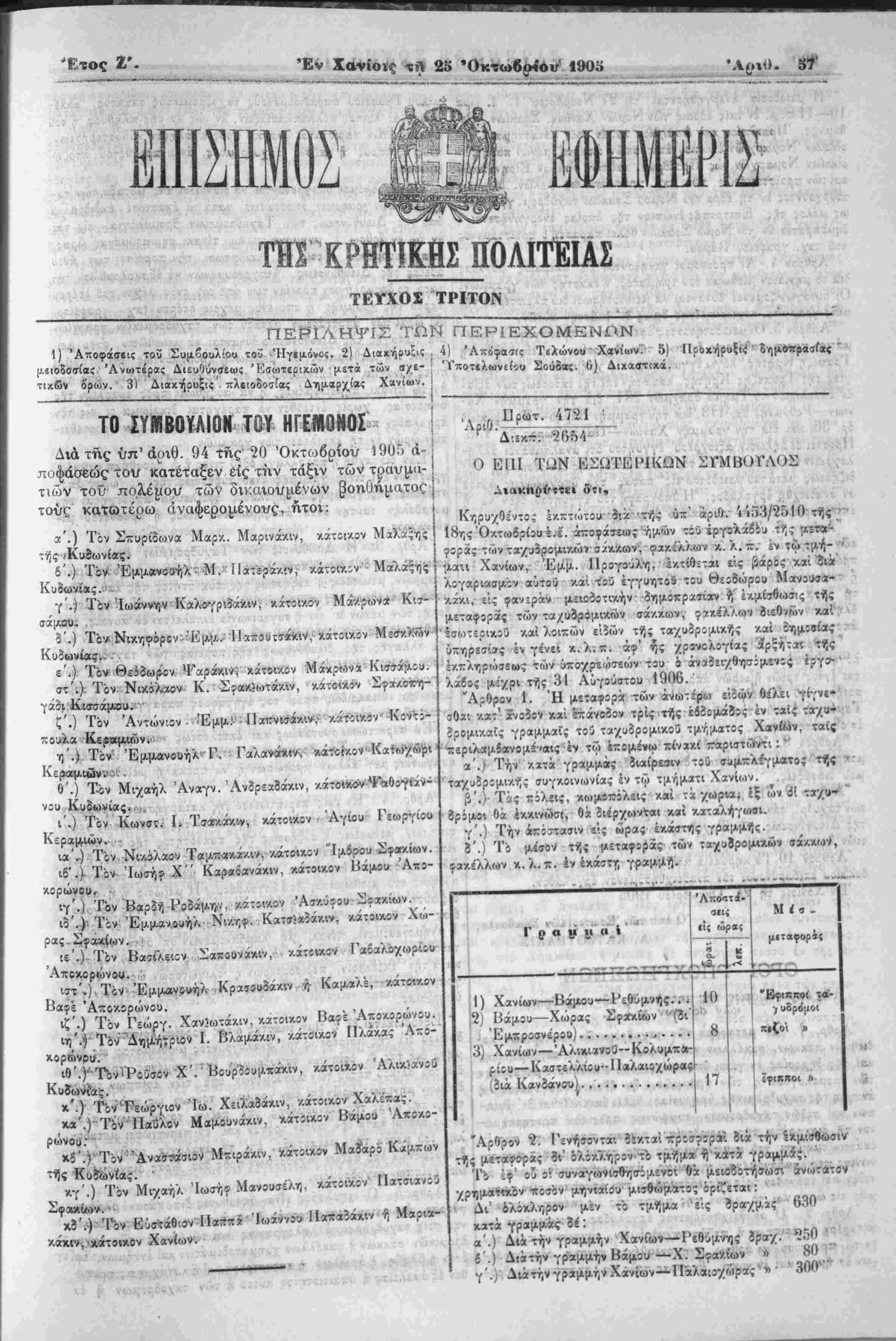 << Γ53 ΤΗΪ ΚΡΗΤΙΚΗΣ ΠθΑΙΐΕΙΑϊ ΤΕΥΧΟΣ ΤΡΙΤΟΝ .^νι,ί ν;1;ί ΠΕΡΊΛΗΨΙΣ ΤΩΝ ΠΕΡΙΕΧΟΜΕΝΟΝ 1) Άποφάσβις τοϋ Συμδουλίου τοΰ Ήγβμόνος. 2) Διακήουξις 4) Απόφασις Τελώνου Χανίων. 5) Προκήρυξιν1 ϊΐοΒσσίας Ανωτέρας Διευθύνσεως Εσωτερικήν μετά των σ/ε- 'Τποτβλωνεί^υ Σούδας. 6) Διχαστιχά. τιχδν ό'ρων. 3) Διβκήρυξι; πλειοδοσίας Δημαρχίας Χανίων. --------------------------------__,----------,------------:----------------------1 ΤΟ ΣΥΜΒΟΥΛΙΟΝ ΤΟΥ ΗΓΕϋΟΚΟΙ Διά της {/π'αριθ. 94 της 20 "Οκτώβριον 1905 α¬ ποφάσεως τον κατέταξεν ε{ς την τάξιν των τρανμα-1 τιών τοϋ πόλεμον των δικαιονμένων (3οη0ήματος Ι τούς κατωτέρω άναφερομένους, ήτοι: ι . ,„ ,,.^,, Χ ν ν Κορυχθέ'τοί Ικπτώτοι» στχ"··τϊ)ς ύχ δρΛ. 'Λ3$βΖ{& τΐ;^ - α'.) Τον Σπυρίδων» Μαρ·/.. Μαρινάκιν, κάτοικον Μαλάςης 18ης Όκτίοδρίου έ.ε. αποφάσεως ημών τϊΟ έργϊΐλάίίυ τί;; ;λίτα^ της/Κυδωνίας. Ι φοράς των ταχυορομικώ» σνίκΛων, φακϊλ'/.ων κ. λ.ζ. έν τω τμή- ''">■