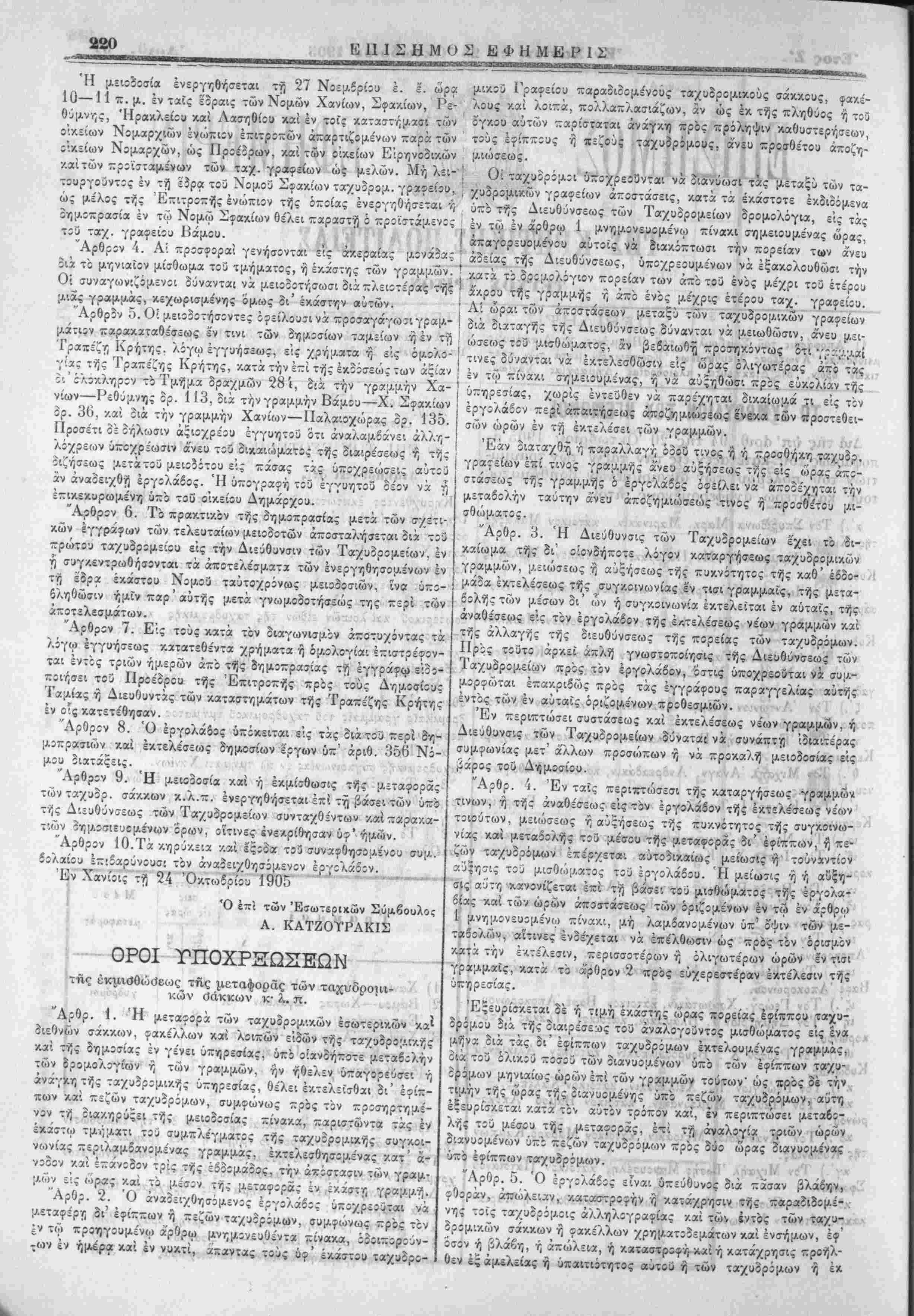 ταχυδρ:μικής συγκοινωνίας έν τω τμήματι Χανίων.