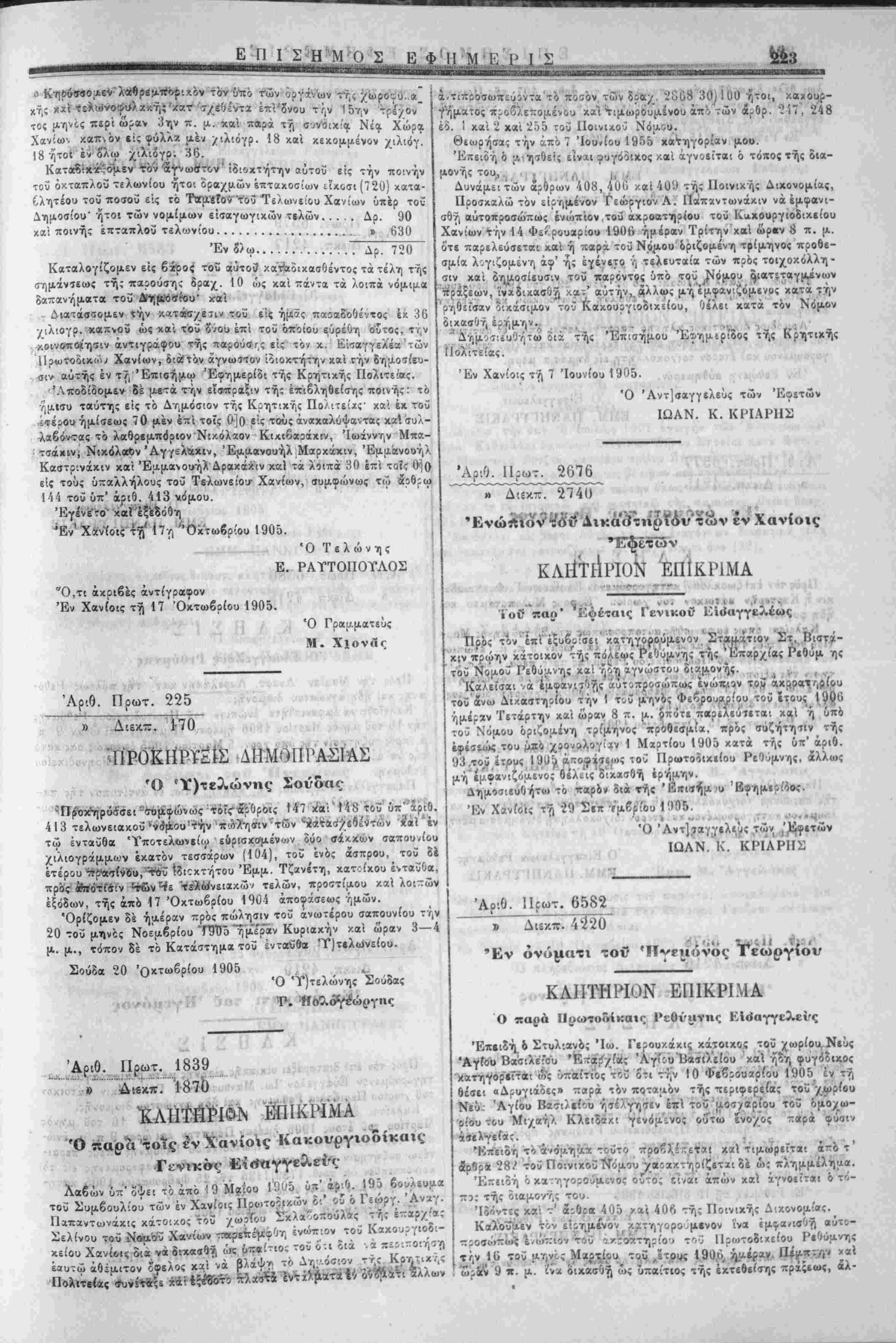 Μήνυσκ Μιχαήλ Κλειδάκ:, τό ΰπ' αριθ. 291 τοΰ 1905 βούλευμα
