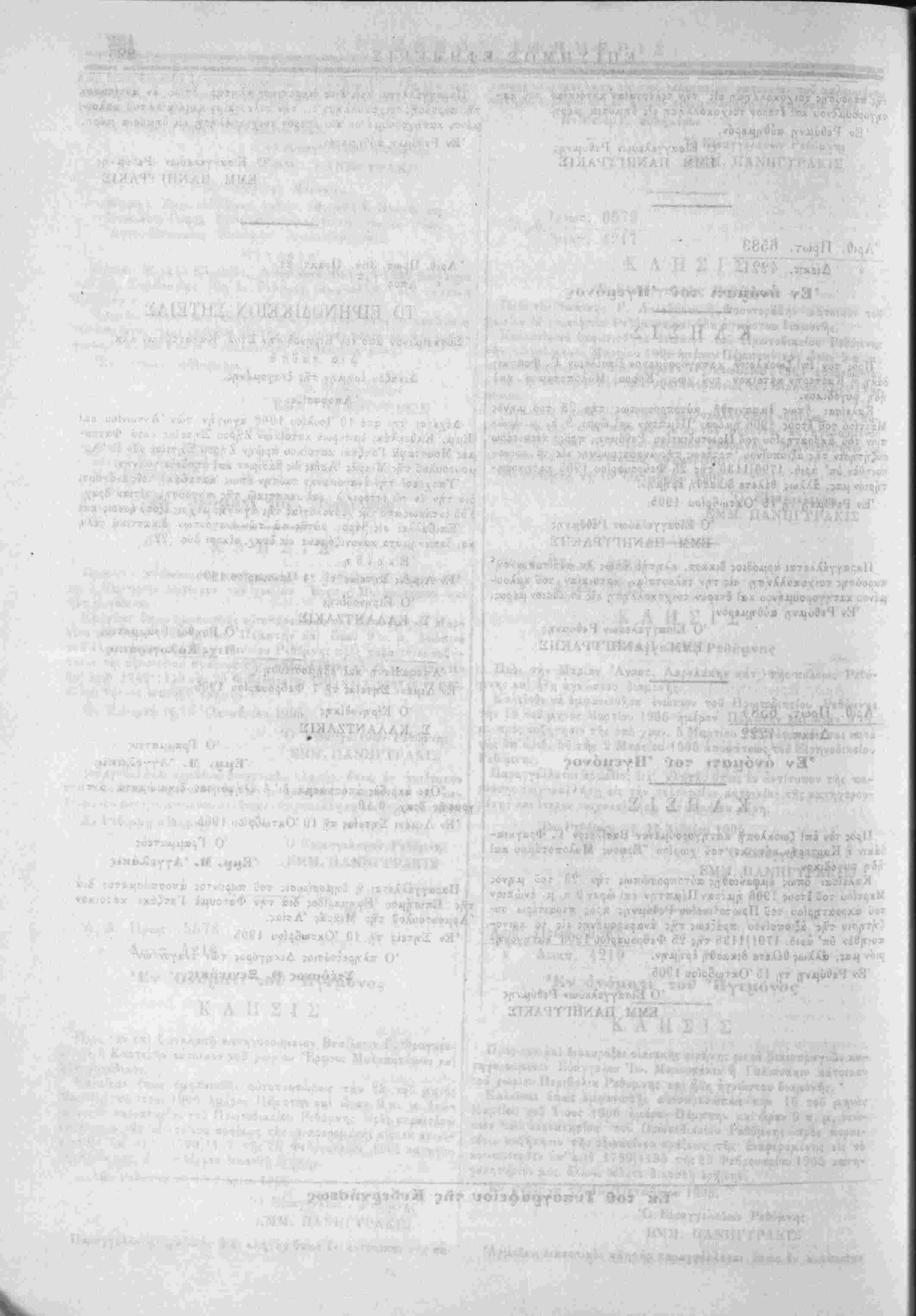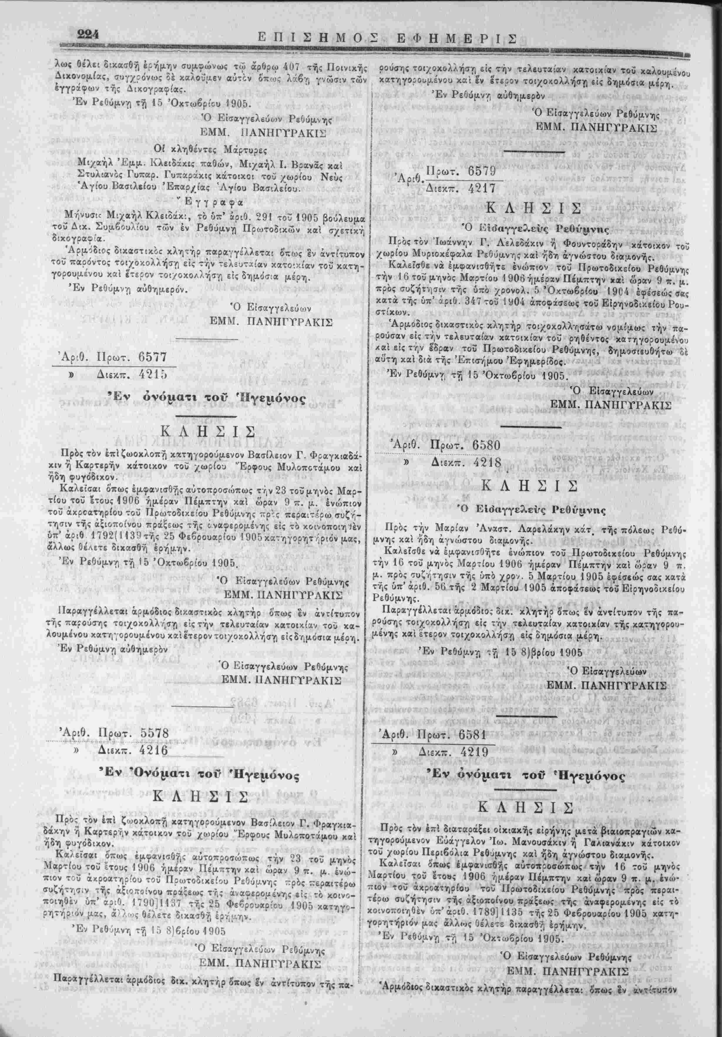 Έν Ρεθ^Λνη τη 15 8)βρίου<905 Ό Εισαγγελεύς Ρεθύμνης ΕΜΜ. ΠΑΝΗΓΤΡΑΚΙΣ Παραγγέλλεται άρμόδιο; διχ. κλ-ητήρ 5πως εν αντίτυπον τής πά- Ό Είσαγγελεύων Ρ ΕΜΜ. ΠΑΝΗΓΥΡΑΚΙΣ ' Τ7 ο-Θ ———————— '" 'Διεκττ. 4217 *„*■■ :;·.-..*.* Κ Λ Η Σ Ι Σ Ό Εΐ<$αγγε3.εΐ/ς Ρεθύμνης -ί Πρό; τόν Ιωάννην Γ. Λελεοάκιν ή Φουντοράδην κάτοικον τοϋ '/ωρΙοα Μυριοκέφαλα Ρεθύμνης καί ήδτι αγνώστου διαμονής. Καλεϊσθε νά έμβανισθήτε ενώπιον τοΰ Πρωτοδικείου Ρεθύμνης την 1 6 τοΰ μηνός Μαρτίου 1906 ημέραν Πέμπτην χαϊ ωίαν 9 π. μ. πρό; συζήτησιν τή; υπό χρονολ. 5 Όκτωβοίου 19ϋ4 έφέσεώ; σ«ς χατα τής ίιπ' όριθ 347 τοΰ 1904 αποφάσεως τοΰ Εΐρηνοδικείου Ρου- στίκων. Άρμοδιος δικαστικός κλητήρ τοιχοκολλησάτω νομίμως την πα¬ ρούσαν είς την τελευταίαν κατοικίαν τοΰ ρηθέντο; χατηγορουμενοο καί είς την έδραν τοΰ Ποωτοδικείου Ρεθύμνης, δημοσιευθήτω δέ αυτή χαί διά τή; Επισήμου Εφημερίδος. "■>■■.*>,■*' 'χχ <Ίχι·ν:^ίτ>ϊ