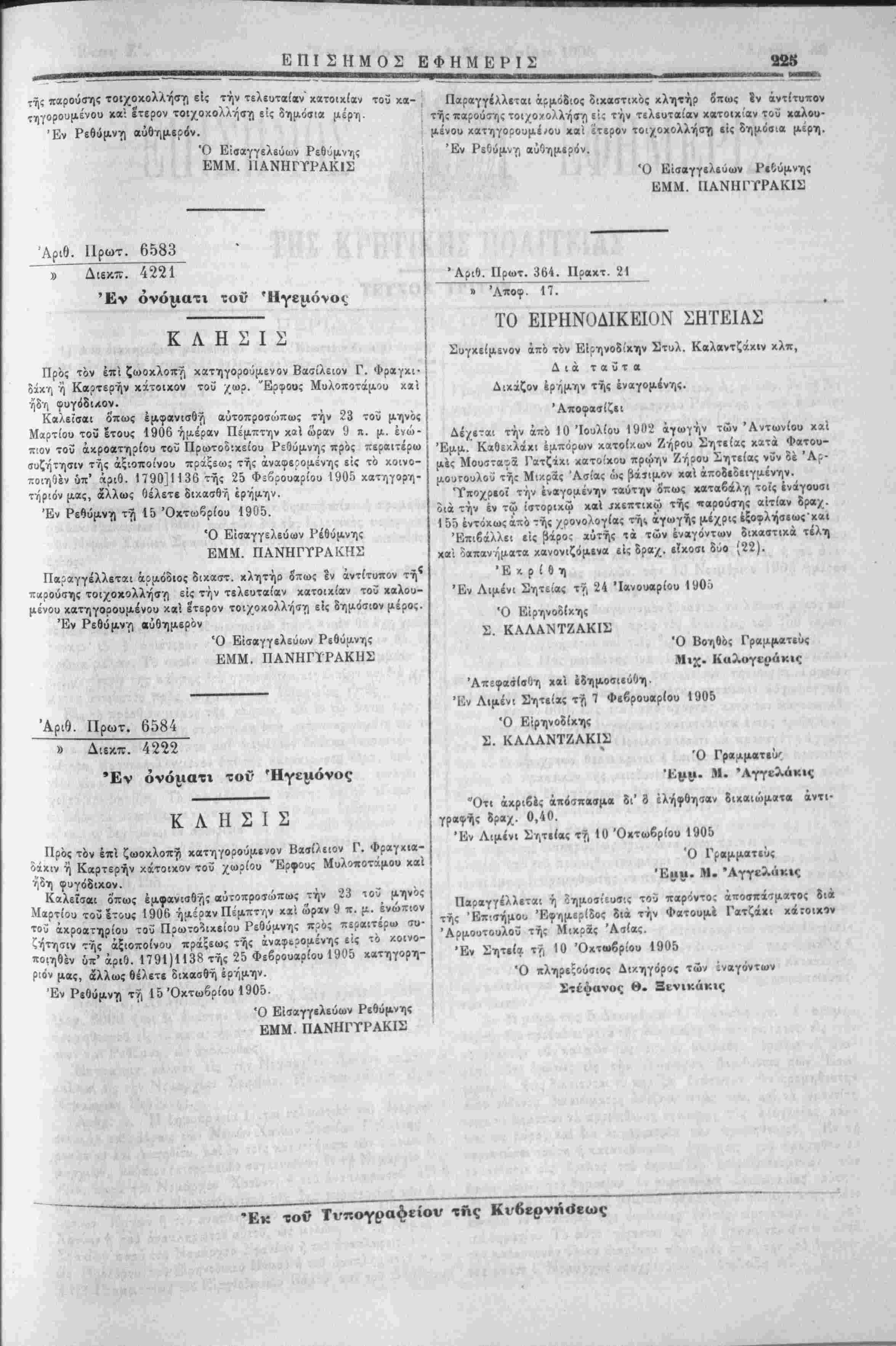 Έν Ρεθύμνγι αύθημ«ρ<5ν, ? » Αριθ. Πρωτ. 6583 4221 Έν ονόματι τοΰ Ίϊγεμό-νοι, Κ Λ Η Σ Ι Σ Πρός τόν έπϊ ζωοκλοπή κατηγοροαμενον Βασίλειον Γ. Φραγχι· «τη <ΐ Καρτερήν κίτοιχον τοϋ χωρ. Έρφους Μυλοποτάμου καΐ θ Εισαγγίλίυων ΡίΛύμνης ΕΜΜ. ΙΙΑΝΗΓΓΡΑΚΙΣ ]ι φγ Κα/εϊσαι όπως εμφανισθή αυτοπροσώπως την 23 τού μηνός Μαίτίου τοϋ ετους 1906 ημέραν Πεμπτην χαί ώραν 1) π. μ ένώ- π'ον τοΰ άχροατηρίου τοϋ Πρωτοδ:χείου Ρεθύμνης πρός περαιτέρω ΐυζιίτησιν της άξιοποίνου πραξϊω; τής άναφε'ομενης είς το χοινο- ποιηθέν ΰπ' όιριθ. 1790] 1136 τής 25 Φ-δρουαρίου 1905 χατηγορη- τηριόν μας, άλλως Οέλετε δικασθίι έρ-ημην. Έν Ρε9ύμντ) τϊ) 15 Όκτωξρίου 1905. Ό Είσαγγελεύων Ρεθύμνης ΕΜΜ. ΠΑΝΗΓΥΡΑΚΗΣ Παραγγέλλεται άοΐΑΟδιο; διχαστ. χλητήο όπως εν αντίτυπον τή* παοούσης τοιχοκολλήση είς την τελευταίαν χατοιχίαν τοϋ καλου- μένου χατηγορουμένου αλ έτερον τοι/οχολλήσϊ) είς δημόσιον μέρος. Έν Ρεθύμννι «ύβημερον Ό Είσαγγελευο,ν Ρεθύμνης ', ΕΜΜ. ΠΑΝΗΓΙΡΑΚΙΙΣ Αριθ. Πρωτ. 6584 » Διεκ-. 4222 Έν ονόματι τοΐ; Ήγεμόνος Κ Λ Η Σ Ι Σ Πρός τόν επί ζωοκλοπϊ) κατηγοροΰμενον Βασίλειον Γ. Φραγχια- οαχιν ή Καρτερήν κάτοικον τοΰ χωοίου Έοφους Μυλοποτάμου χαί ηδη φυγόδικον. Καλεϊσαΐ όπως εμφανισθή αύτοπροΐώπως την 23 ιοΖ μηνός Μαρτίου τοϋ ετους 1906 μ.ζοχι Πεμπτην χχι ώραν 9 π. μ. ενώπιον τοϋ άχροατηρίου τοΰ Πρωτοδιχβίου Ρεθύμνης π^ο; περαιτέρω συ¬ ζητησιν τής άξιοποίνου πράξεως τής άναφ&2ομ.ενης εις "Ο /.οινο- ποιηθέν ΰπ' αριθ. 1791)1138 τής 25 Φεβρουαρίου 1905 χατηγορη- 0 °* μας, άλλως θέλετε δικασθή έρημην. Εν Ρεθιίμν·}) τ/| 15'Οχτωβρίου 1905. , ^,,ν ι ; Ό Είσαγγβλεύων Ρεθύμνηί »' ... , ΕΜΜ ΠΑΝΗΓΤΡΑΚΙΣ •Αριθ. Πρωτ. 364. Πραχτ. 21 » 'Λποφ 17. ΤΟ ΕΙΡΗΝΟΔΙΚΕΙϋΝ ΣΗΤΕΙΑΣ Συγχείμενον άπ'ο τόν Εΐρηνοδ'χην Στυλ. Καλαντζάχιν χλπ, Διά ταυτα Διχάζον έρημην τής έναγομίντ,ς. Άποφασίζιι Δέ/ε-α' την άπο 10 Ιουλίου 1902 άγωγήν των Άντωνίου χαί Έμμ. Καθεχλάχι έμπορων χατοίχων Ζήρου ϊητιίας χατά Φατου- μβς Μουσταφά Γατζϊχι χατο'χου πρωην Ζήοου Σητείας νυν δέ Άρ- μθΛΓθυλου τή; Μικράς Άσίας ώς βάτιμον χαί άπο8»διιγαένην. 'Τποχρΐοϊ την έναγομενην ταύτην όπως χαταβάλη τοίς ένάγουσι διά την εν τω ίστοριχω χαι ίχεπτιχω τής παρούσης αιτίαν δραχ. 1 55 έντοκωςά-τό -ής /οονολογίας τή;, άγωγής μέχρις ίςΌφλήαιως'χαΙ Επιβάλλει είς βάρος αυτής χά των έναγόντων διχαστιχά τέλη χαι οαπαν ηματα χανονιζόμινα είς δραχ. ίΤχοσι δυο (22). Εκρίθη Έν Λιμένι Σητείας τή 24 Ίανουαρίου 190ό Ό Ειρ-ηνοδίχης Σ. ΚΑΛΑΝΤΖΑΚΙΣ Ό Βοηθός Γραμματιΰς Μιχ. Καλογιι»άκις Απεφασίσθη χαί εδημοσιεύθη Έν Λιμένι Σητείας τή 7 Φίβρουαρίου 1905 Ό Είρηνοδίχης Σ. ΚΑΛΑΝΤΖΑΚΙΣ Ό Γραιΐματιΰ' Ήμ·;»· Μ. 'Λγγιιλάκκ; Ότι άχριβές άποσπασμα δι' ο ελήφθησαν διχαιώματα άντι- γραφής δρα/. 0,40. Έν Λιμένι ^ί,τιίας τή 10 Όχτωβρίου 1905 Ό Γραμμβτιύς Έιιμ. Μ. Άγγελάκις Παραγγέλλίται ή δημοσίευσις τοϋ παρόνο; άποσϊτά'ίματος ίιά τής 'Επ·σήμου Εφημερίδος δια την ΦατουμΙ Γατζάχι χάτοιχίν Άρμουτουλοϋ τής Μιχοδς Άϊίας. Έν Σητ*(α τ?, 10 Όχτβ>6ρίου 1905