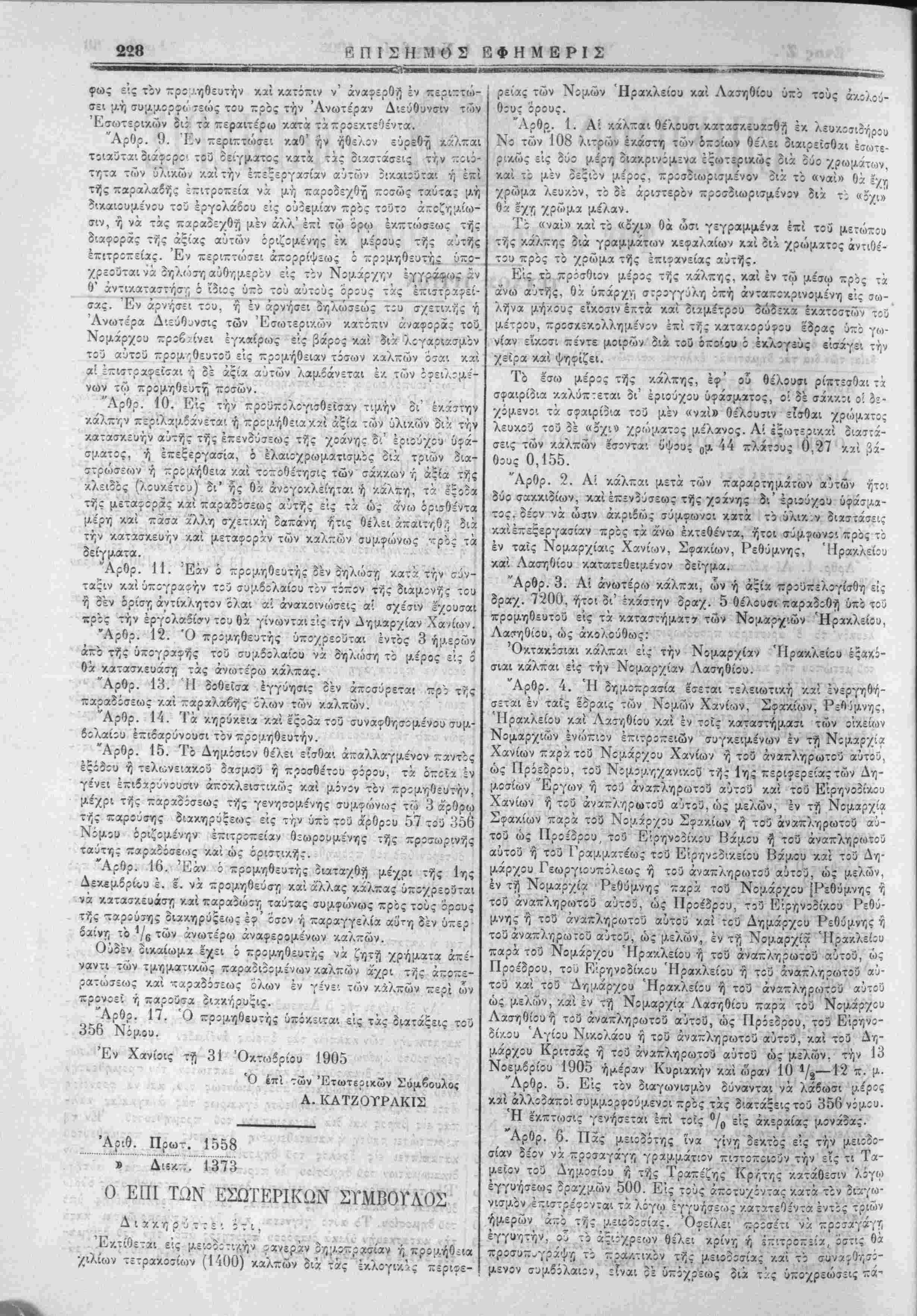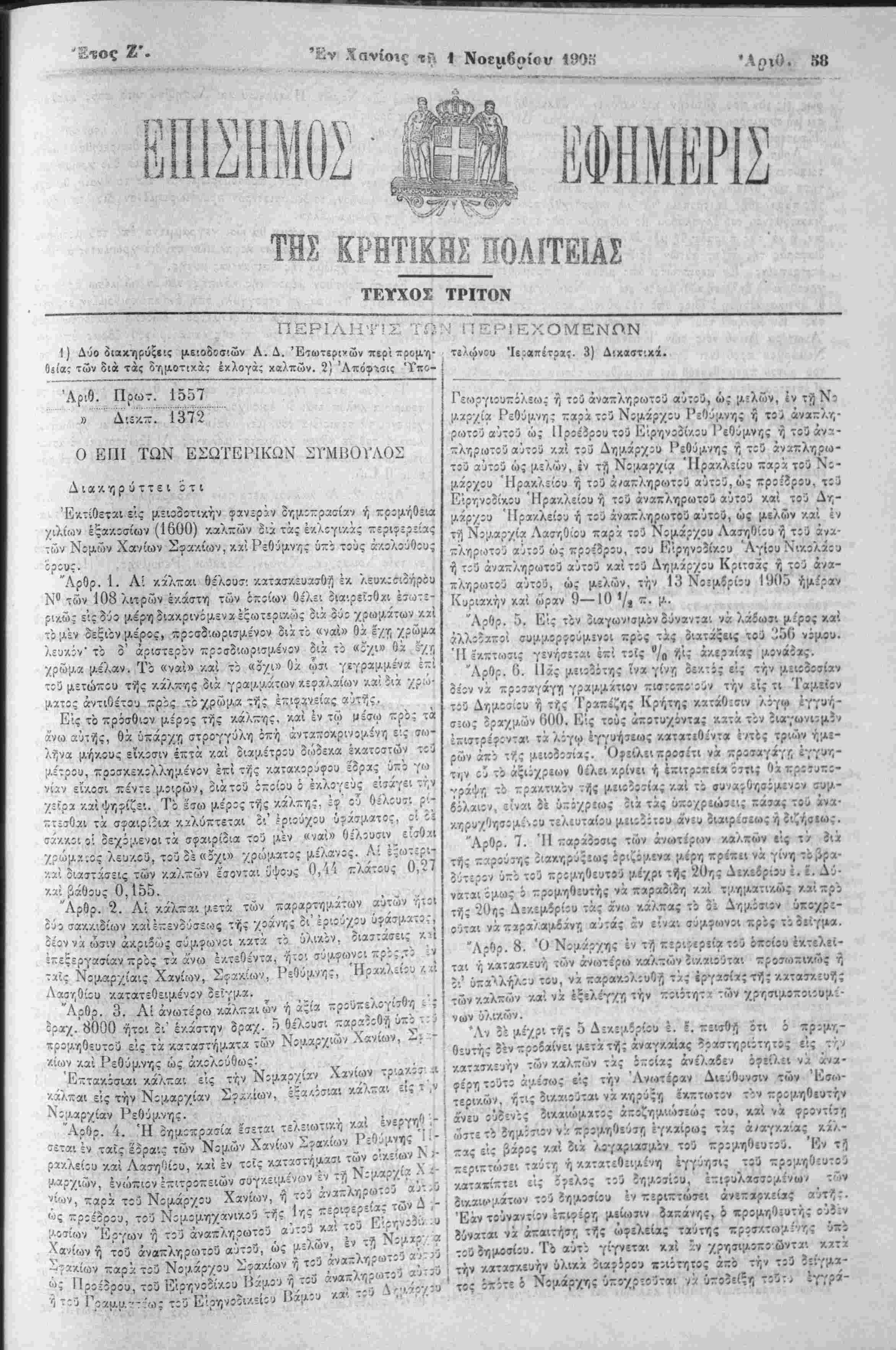 -"Βτι*<ιηίι*«Ηι.ιι.. ι. .. , V ^ 'Λη.Ο. 88 Π ίΤΙΚΗΣ ΠΟΑΠΈΙΑΣ ι ι *ι * ■" V1 ΤΈΥΧΟΣ ΤΡΙΤΟΝ ΠΕΡΙΛΗΠΣ Τίϊ !) Δύο διακτιρϋςε'.ς με-.οδοσ'.ών Α. Δ. Εξωτερικών περ'ι ζρομη- Οόία: των διά τα; δημοτικάς έχλογά; χαλπών. 2) Απόφασις 'Υπο- ΆριΟ. Πρωτ. 1557 » Διεχ-.' 1372 '" ' ' Ο ΕΠΙ ΤΩΝ ΕΣΩΤΕΡΙΚΌΝ ΣΎΜΒΟΥΛΟΝ Δ ι α χ η ρ ύ τ τ ε ι ότι Έκτίθεται εις μειοδοτικήν Φαν;ιοί·ν οϊϋο.ΐττρασίαν ή ττρΐμήθεια χιλίων έξακ:σίων (1600) καλπων ςιά τάς έκλίγιν.άς περιφερείας των Νομών Χανίων Σφακίων, -/.ν. Ρεθύμνης υπο τοίις ά-ΛολούΟους Ίρίυς. "Λρθρ. Ι. Αί κάλ-αι θέλουσι κατασκευασθή έ·/, λευκςσιοήρέυ Ν" των 108 λιτρών εκάστη των ότ:ΐίων θέλει διαιρεϊσθαι έΐιθ.:- ρΐν.ώς ε'ιςδύο μέρηδιακρινίμ-εναέςωτίριν.ώς οιά ού: χρωμάτων κ α ι τόμέν δεξιονμέρος, πρ:σδιωρισμ.ένον δάτϊ «ναί» θά εχτ, "/ρώμα λευκίν' το δ' άριστερον τ:ρ;σ2'.ωρισμένον διά ~.Ό «ϊ'χι» θά ς'-χτ, ■/ρίομα μέλαν. Τό «ναί» ■/.αί τι «5'χι» Οά ωσι γεγραμμένα επί "3 μετώπου τής κάλπης 3ιά γρα;Λαάτων "/.ί^αλαίων ■,'.αίοΐϊ '/£'·»■ ματος άντιθέτου πρϊς τόχρώμα τής επιφανείας αότής. Είς τό πρόσΘυν μέρος τής χάλκης, καί έν τω μέσω πρός τα «ώ αΐιτής, θά υπάρχη στρογγύλη ίπή άνταποκρινομίνη εις αω- λί;να μ.ήν.ους ε'ί/.ΐσιν έ~τά /.αί οιαμέτρίυ διόϊεκα έκατίστών τ;3 /ίτρου, προσκίκΐλλημένον επί τής ν.αταχ.ορύφου έορας υπο ·;<.>