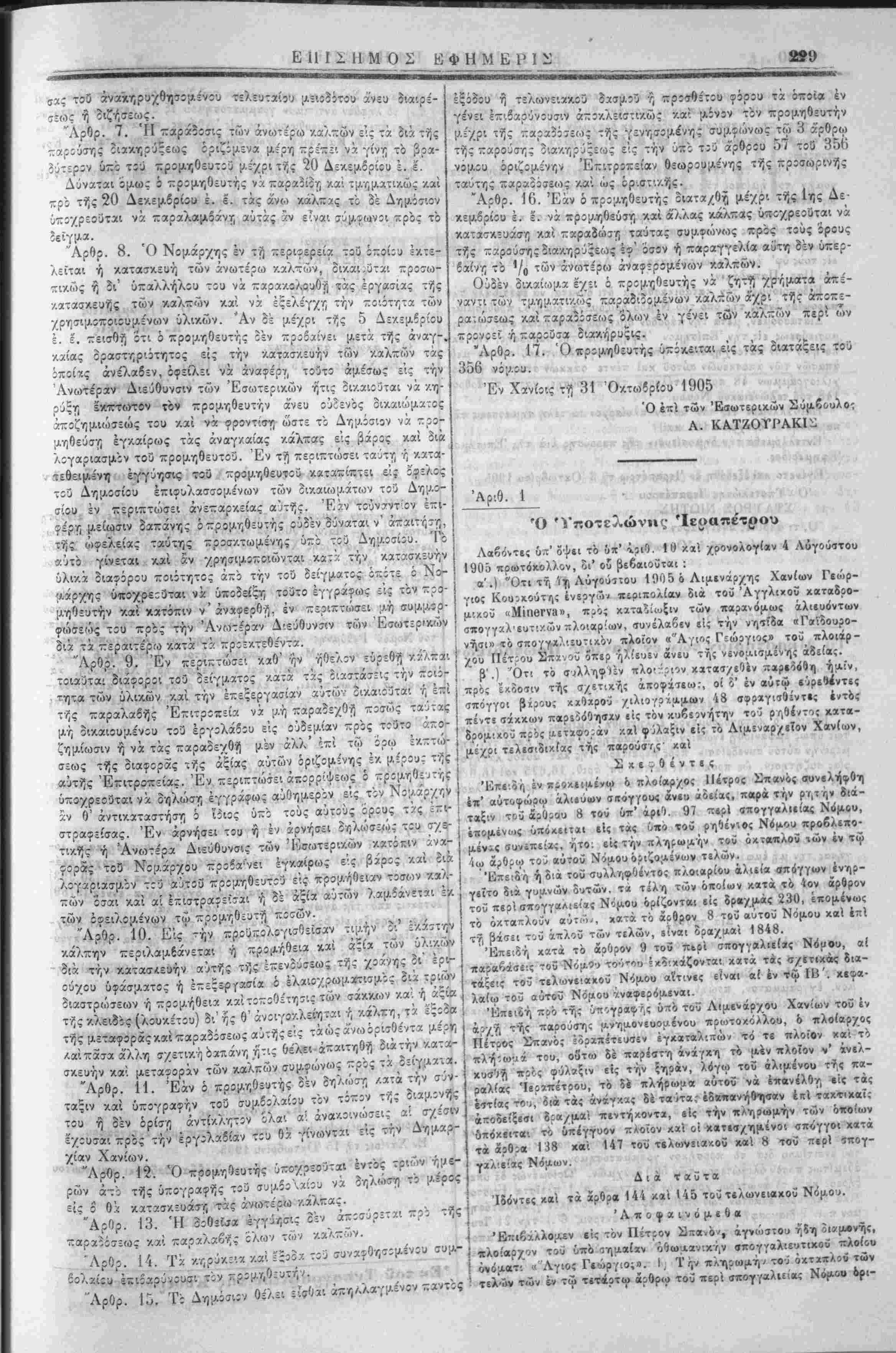 τϊίς Νδμαρχίαις Χανίων, Σφακίων, Ρεθύμν/;-:, Η?χ/.λει:υ /. <·. Μϊ,Οίου κατατεθειμένον δεϊγμ». χίω·/ καί Ρεθύμνης ώς ακολούθως: Έπτακίσιαι κάλπαι εις την Νομαρχίαν Χανίων τ?αν.~~ .ι ν-.ίλ-αι εις την Νίμαρχίαν Σ?7./.ίων, έςα/.όσιαι χ»/.παι εις τ .ν Λ:;λαρχίαν Ρεθύ[Λνγ·^. , . "Αρβρ. 4. Ή 2ημςπρα3ία Ιϊεται τελειωτική και ενεργη-) .- :■! ΠΕΡΙΕΧΟΜΕΝΠΝ τελώνου Ίε:απέτρϊ;. 3) Δικοιστ'.κά. ι/Γ Ρεωργιουπόλεω: ή τού άναπληρωτοθ αύτίϋ, ώ; μ?λών, 1ν τί) Ν5 Ιλϊρχία Ρεθύμνης παρά τί3 Νομάρχΐυ Ρεθύμνης ή τοί άνα-λη· ρ(.)τ;ύ αΐιτΐύ ώς Προε'ίρου το5 Είρηνοοί/.;υ Ρεθύμνης ή το3 άνα- πληρωτοΟα!ιτ;0 /.αί τ;3 Δημάρχ:υ Ρεθύμνης ή τ:0 άναπληρω- τ;3 α!)τ:ύ ώς μελών, έν τή Νϊμαρχία ΊΙρ3/.λ;ί:υ παρά τού Νί- μ.άρ'/ου ΙΙραχλείίυ ή τοθ ά/απληρωτ;3 α!>τ:ύ',ώς προίϊρίυ, τ:3