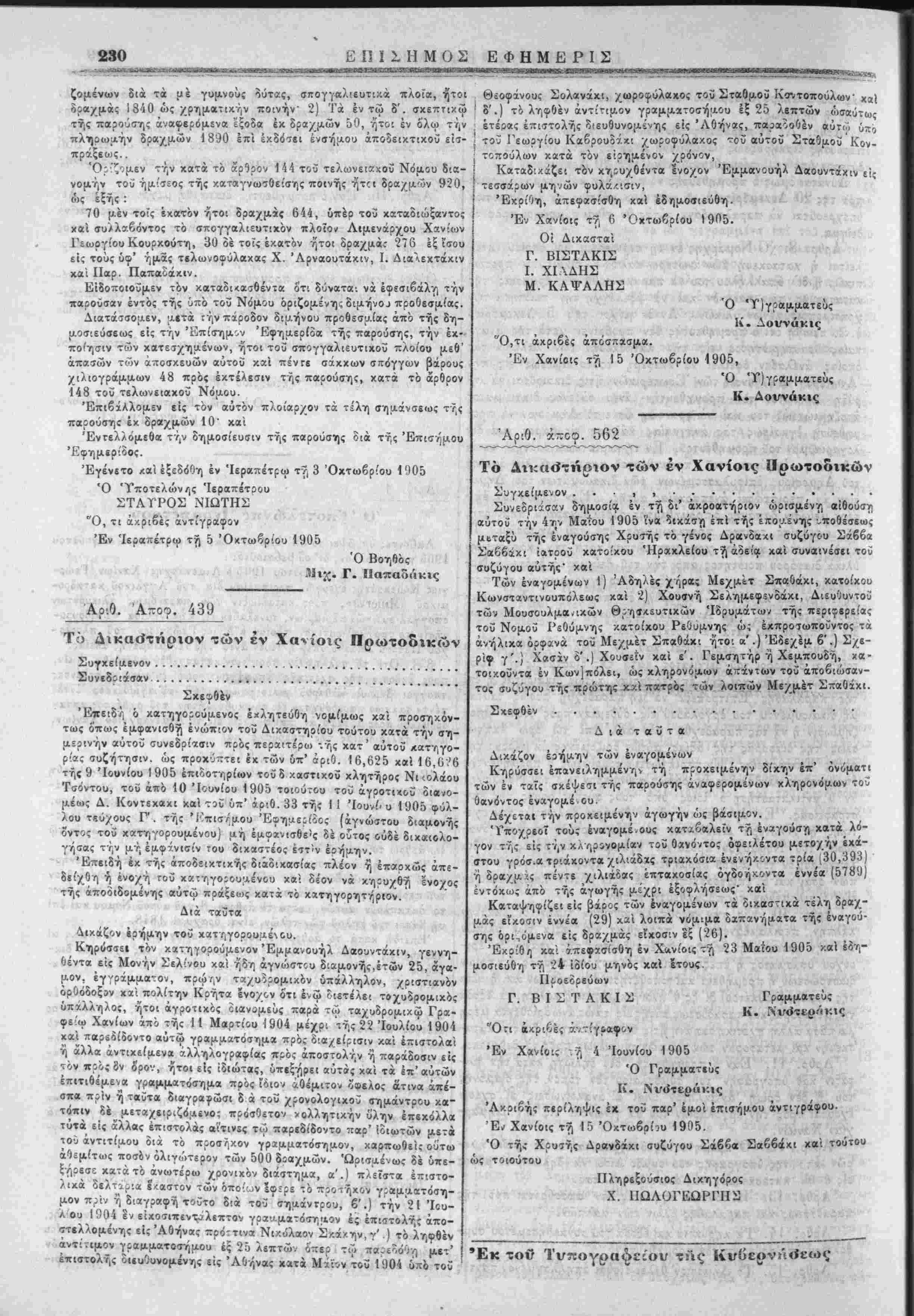 'Β/(ρ;θη κα'· ίπεφασισθη έν Χανίοις-τή 23 Μαιου 1905 ΐ'αί εό·η-