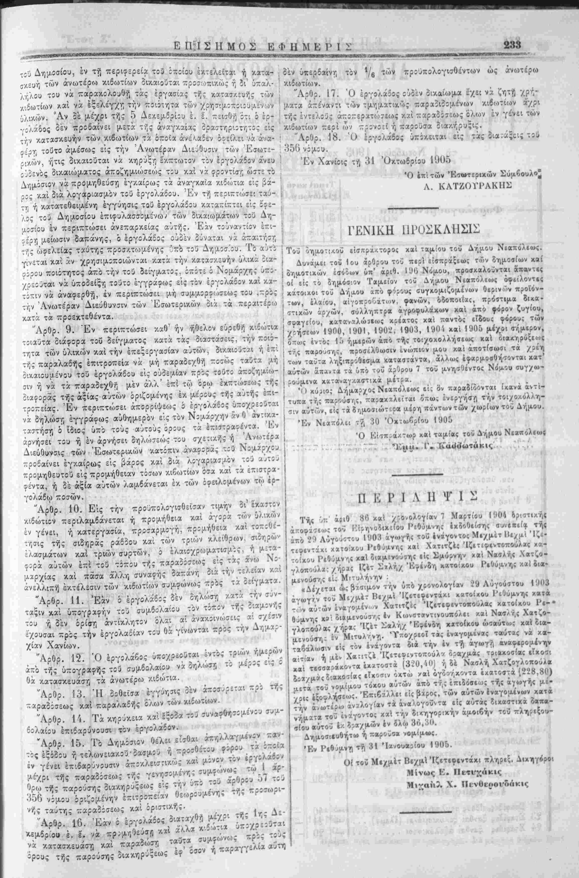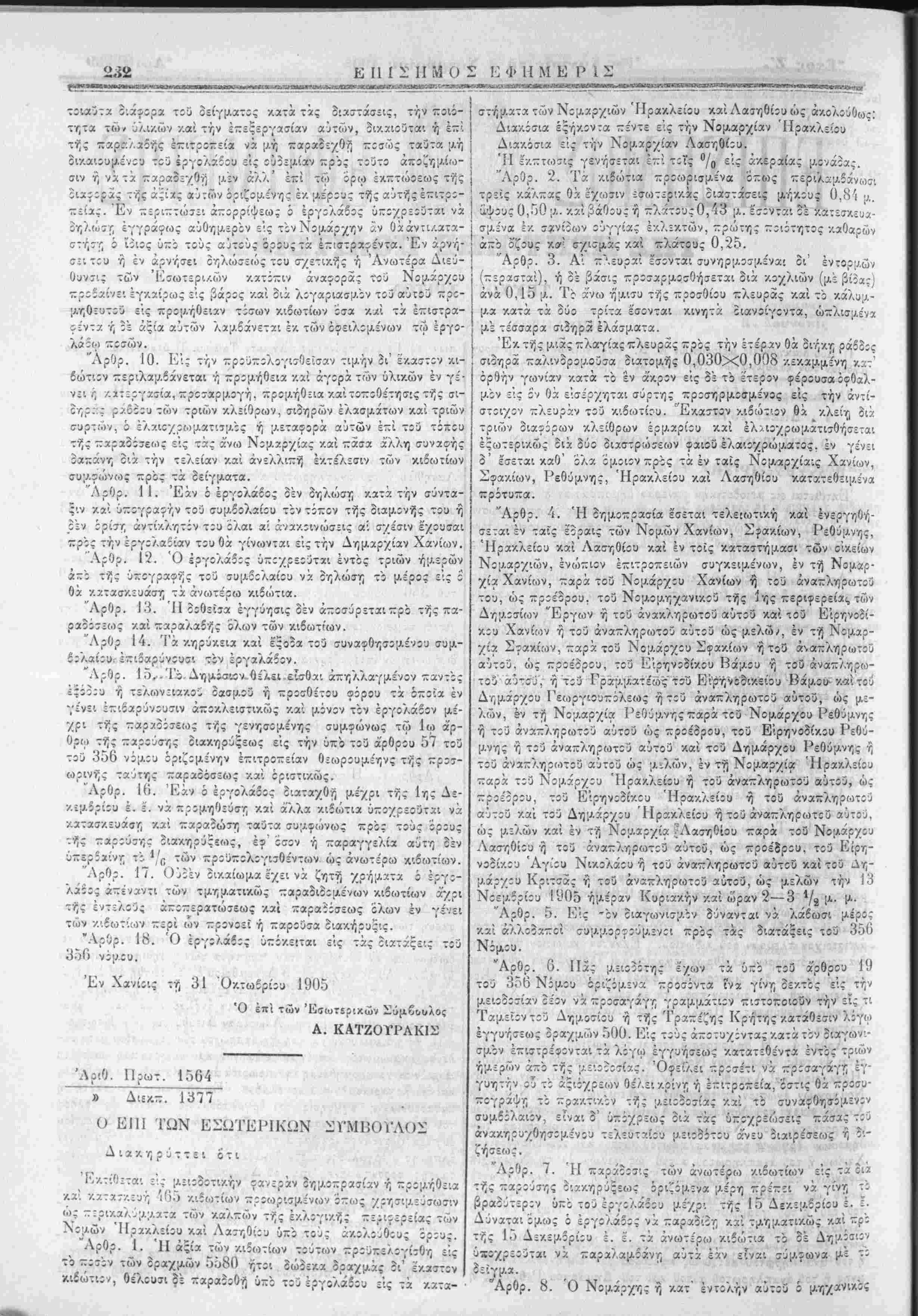 μ,ήθειαν των καλυμμάτων των 8ί7. τάς Λ7)ΐ<.οτΐλ.ά: :χλογά; κΐλ- Άριθ. Πρωτ. 1563 » . Διεκπ. 1^76 Ο ΕΠΙ ΤΩΝ ΕΣΩΤΕΡΙΚΩΝ ΣΥΜΒΟ1ΆΟΣ Διακηρύττει Ότι Έκτίθίται εις μαοδίτι/,ήν ΐχνεράν δημοπρασίαν ή —ρομήθειχ 535 κιοωτιων ϊτροίύρϋμ,ενων οτ:ως χρησιμϊυσωσιν ως περικαλ,ιμματα των /.α<πών τής έ/.Λογικής περιφερείας των Νομών Χανίων Σφακίων /.αί Ρεθύμνης υπο τού; άλολούθους όρους: "Αρθρ. 1. Ή άςία των κιβώτιων τούτων προύπελογίσθη είς τό ποσόν των δραχμήν 64'20 ήτοι δώδεκα δραχμάς δ'.' έκαστον κιβώτιον θέλουσι δέ παραοοθή υπό τού έργολάδου είς τα κατα¬ στήματι των Νου.ζρχιών Χανίων. Σφακίων καί Ρεθήμνης ώ; ακολούθως : διαδοσίαι τρ'.ά/.οντα πέντε είς την Νομαρχίαν Χα¬ νίων, εκατόν είς την Νομαρχίαν Σφακίων, δια/.^ίΐα ϊ ς την Νομαρχίαν Ρεθύμνης. Ή 2κ~τωσις γενησεται επί τής °/0 είς άκεραίας μονάοας. Άρθρ. 2. Τα κιβώτιαπροωρισμενα όπως περ'.λαμβάνωσι τρείς κάλχας θά έχωσιν εσωτερικάς διάστασις μήκος 0,μ 84 ύ'ψος ο.μ 50 καί βάθος ή πλάτος 0,μ 43 έσονται δέ κατεσχ,ευχσμίνχ έν. σανίδων οΰγγίας έκλεκτών, πρώττ,ς ποιότητος, καθαρών α-'; ο'ζους καί σχισμάς καί πλάτους ο.μ?5. Άρθρ. 3. Αί Έλευραί έσονται συνηρμ;σμένα·. 3'. ϊντορμών (ττερασταί) ή δέ βάσις προσαρμοσθήΐεται δι': κΐχλιώ; (μέ βιϊας) άνά ο.μ 15. Τό ά'νω ήμισυ τής ~ΐθσθέ:ου ~~Κϊ<ιρχς και :ο κα- λυμμα κατά τα δύο τρίτα εσοντα'. κινητά διανοίγοντα ώπλισμίνα με τέσσαρα σιδηρζ έλάσματα. Έκ τής μιας πλαγίας πλευρας πρός την έτέραν Οά ίιήκη αντίστοιχον πλευράν τού κιδοηίου. "Εκα-τον κιβώτιον Οά /.λε·.τ, διά τριών διαφόρων /,λείθρων έρμαρίου καί έλαιοχρωμα-ισθή-εται έξωτερ'.-ώς δι/ούο δΐϊττρωσεων φχιοΰ ελχιοχρω/ατίς εν γένει ο έσεται καθ Όλα όμοιον πρός τα εν ταίς ΐΝομαρχιαις λχψ.όι. Σφακίων, Ρεθύμνης, Ήρακλ:ίου καί Λασηθιου /.ατατϊθειμίνα Άρθρ. 4. Ή ίημοπρασία έσεται τελειωτι/.ή /.αί ενεργηθή- Χανίων τ.Λ?'Λ τού Νομάρχου Χανίων ή τού α^.π/.ηρωτού τού ώς ττροέίρου, τού Νομομηχχν.κοΰ τής 1ης περιφερείας των καί τού Είρν,νοδίΛθυ τ·»1, Νομαρχία οημοσί'ον έργων ή τ;ύ «ναττληρωτοΰ χ Χανίων ή τού άναπΛτ,ρωτου αυτού ώς μελών. εν Σφακίων παο>. τού Νομάρχου Σφα>ίων ή τού άναπληρωτού