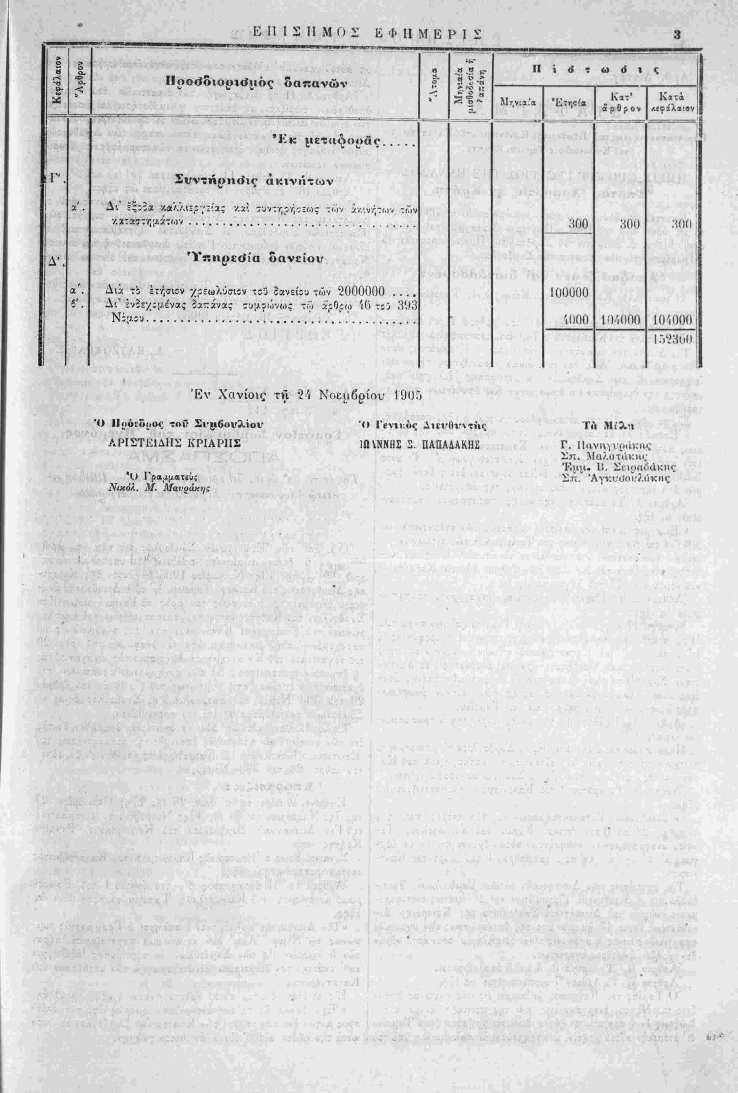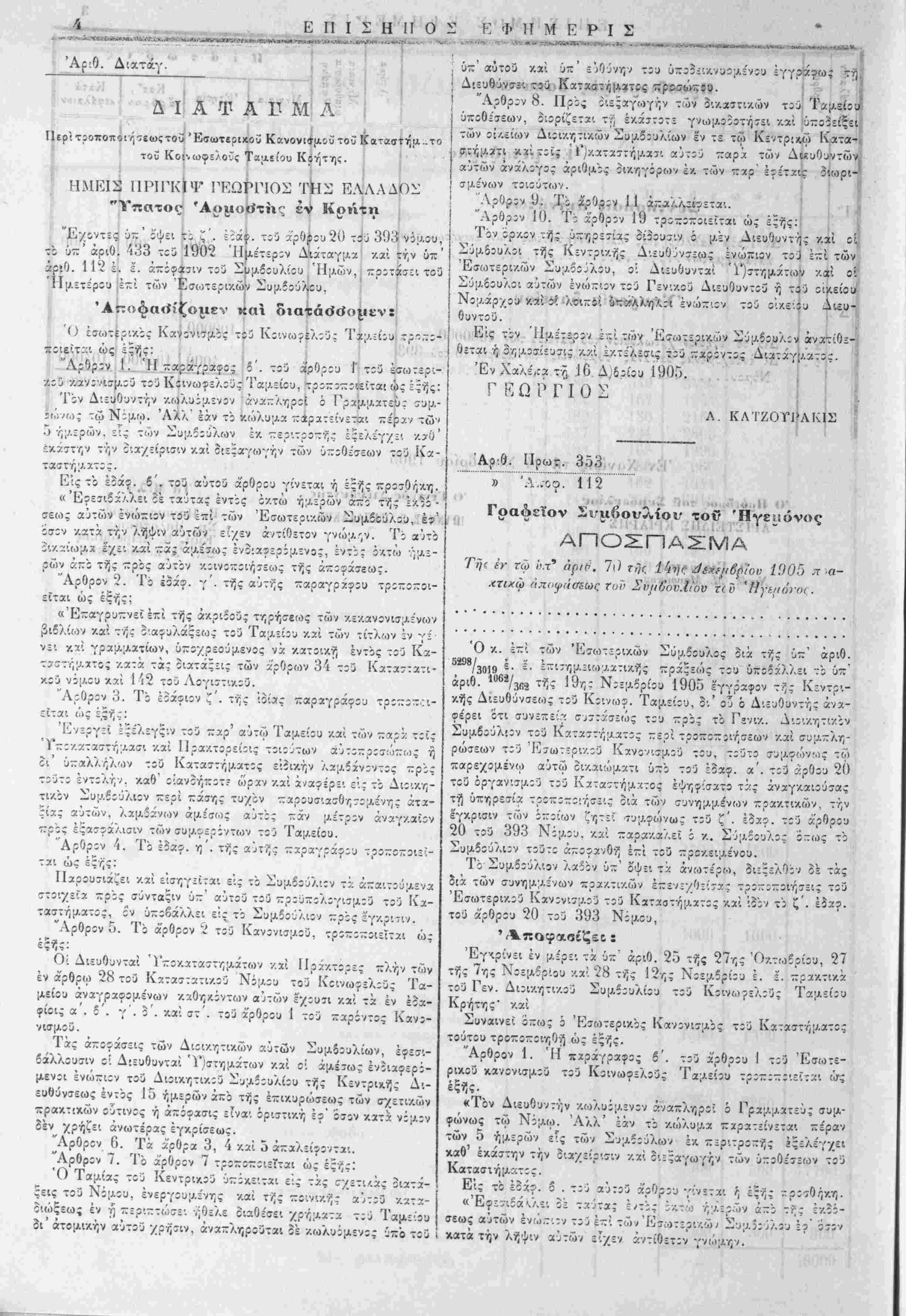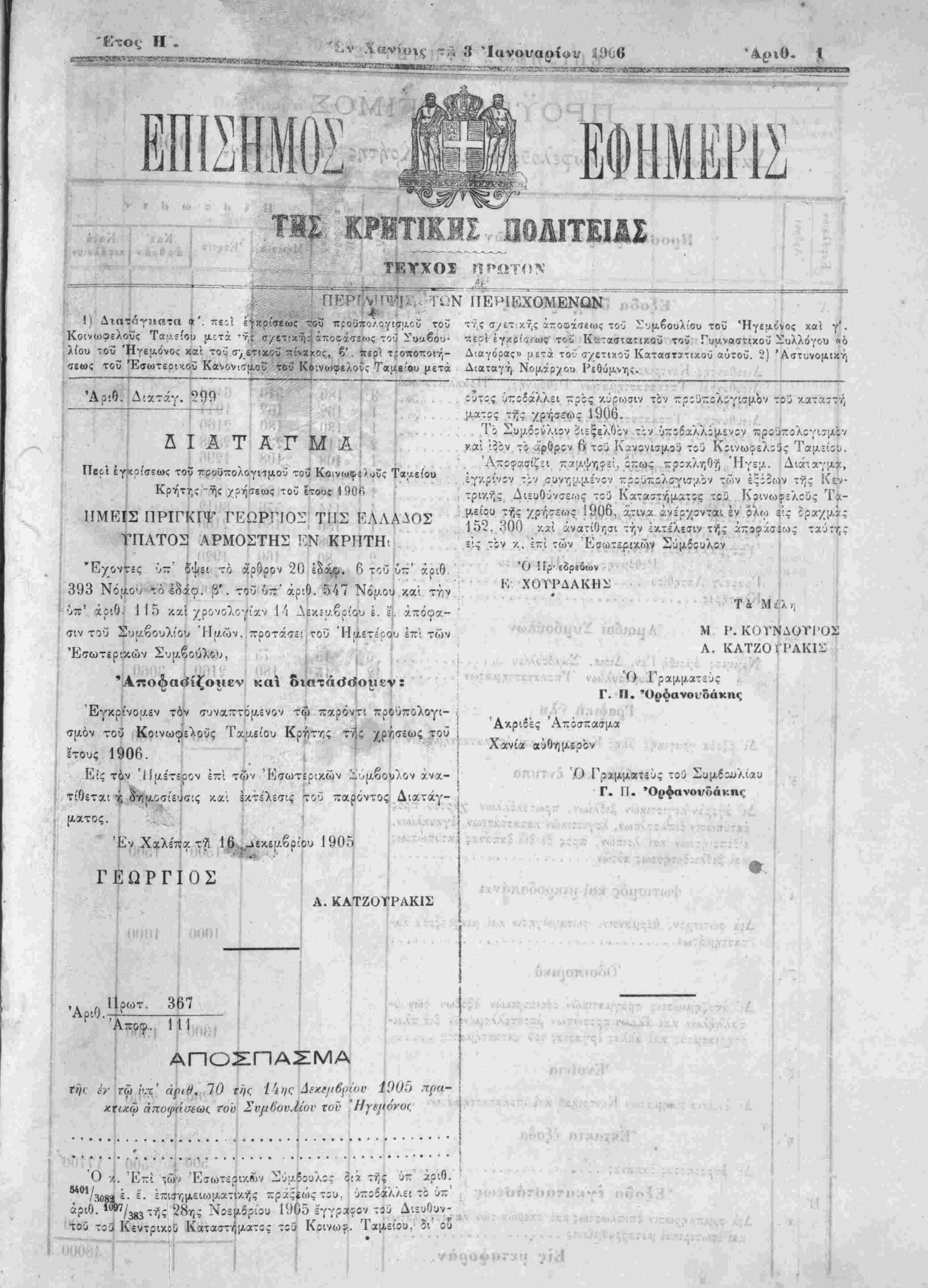 *Αηοφα<ίίζο«εν κα οι«τά«ί<<ο^ιι;ν: Ένκρ·'νο7.εν τόν συνα-τομενον τω παρόντι προυπολογι- | σμόν τοΰ Κοινωφελούς Ταμείου Κρήτης τής χρ/]σεως τοΰ ι , ϊτο,ς 1906. ί ΧανίΛ 1 Είς τδν Ί ίι/,έτεοον έ—1· των Έ(7ωτερι/.ών Συμβον^ον άνα.- [ '·' τίθεται χ. δτ,α.οο-ίε'οσις λχι 1/.τ%ια·ς, τοΰ παρόντος Διαταγ- | ΈνΧχλέ7ϊατ·λ 1^, αεκεμβρ'Όυ 1905 ΓΕΩΡΓΙΟΣ ; | ' ε'ς τϊν /. έττί των Εσωτςρικών Σύμβουλον Ό ! ρ εδρε&ων κ χοτρδακη>;