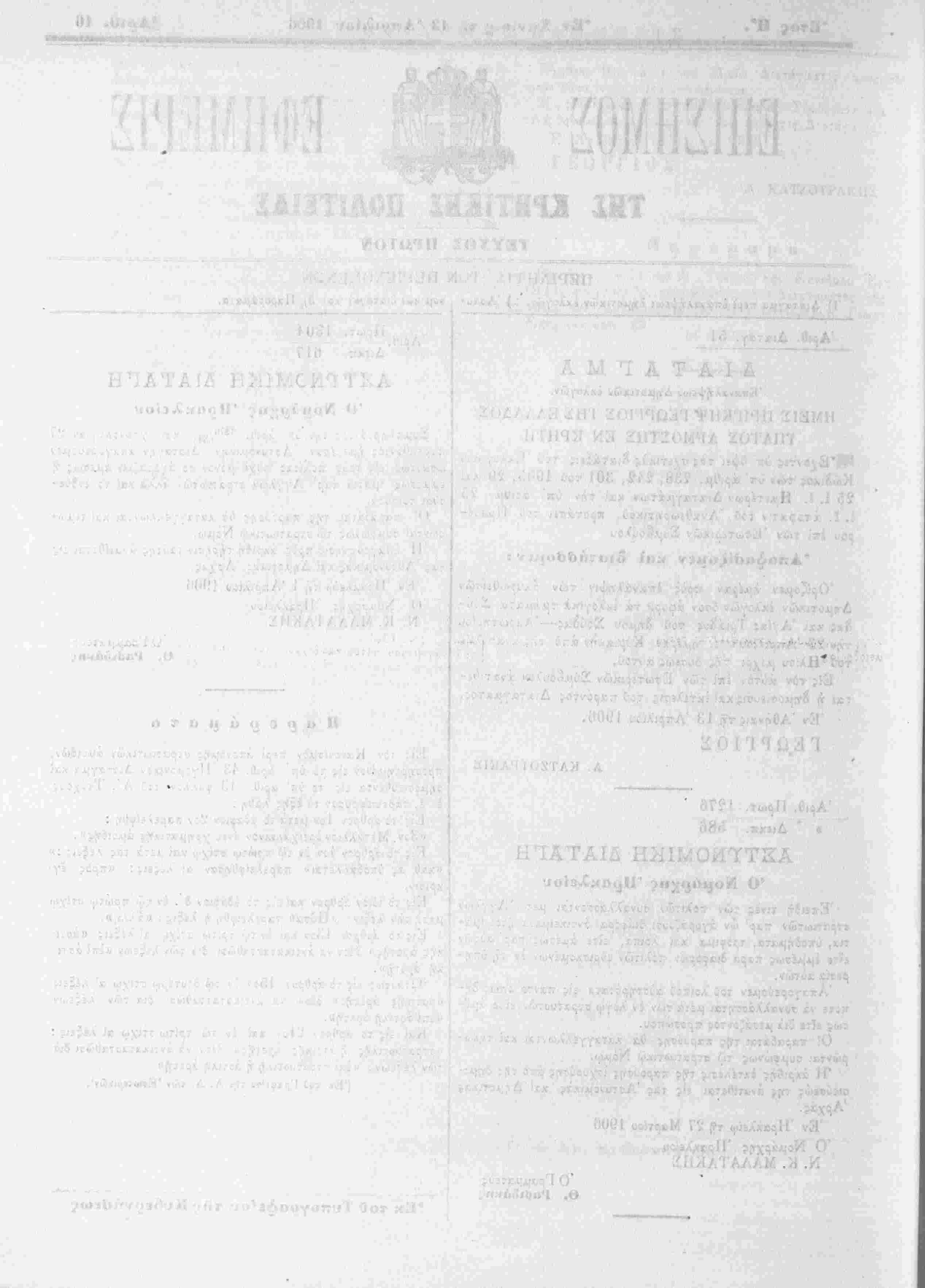 Όρίζομεν ημέραν πρός επανάληψιν των ά,ορωΟ=!<7ών Δημοτικ,ών έκλογών όσον άφορα τα έκλογικχ τμήμχτα Σού- δας καί Άγίας ΤριάοΌς τοΰ δήμου Σούο'ας—Άκρωττιρίου την 23 Απριλίου έ. ε. ημέραν Κυριακην άπό της ανατολή; τοΰ Ηλίου μέχρι της όύσεως αϋτοΰ. Είς τόν αυτόν επι των Έσωτερικών Σύμβουλον άνχτίθε- ται ή δημοσίευσις κχί εκτέλεσις τοΰ παρόντος Διχτάγμχτος. Έν Αθήναις τί) 13 Απριλίου 1906. Γ Ε β Ρ Γ ΙΟ Σ Α. ΚΑΤΖΟΤΡΛΚΙΣ Αριθ. Πρωτ. 1276 » * Διεκ-. 586 ΑΧΤΓΗΟΜΙΚΗ ΔΙΑΤΑΓΗ Ό Νομάρ^ης Ηρακλείου Έπειδή τινές των πολιτών συναλλάσσονται μετ" "Αγγλων στρατιωτών παρ' ών άγοράζουσι διάφΐρα άντιχείμενχ ήτοι ίμ.α- τια, υποδήματα, τρίφιμα χαί λοιπά, είτε άμέσως ~αρ αυτών είτε έμμέσως παρά διαφόρων πολιτών εύρυκομε'νων έν τ·γ, ύτςη- ρεσία αυτών. Άπαγορεύομεν τοΰ λοιπού αύστηρότατα εις πάντα όττως δτ,- ποτε νά συναλλάσσηται μετά των έν λίγω στρατιωτών είτε »μέ- σως εΓτε διά μεσάζοντος προσώπου. Οί παραβάται τής παρίύσης θά καταγγέλλωνται καί τιμω- ρώνται συμφώνως τω στρατιωτικω Νομώ. Ή άκριβής εκτέλεσις τής παρούσης Ίσχυούσης ά~ϊ τής ΐΓ,ΐ-ΐ.ί- σιεύσεώς της άνατίθεται είς τάς Αστυνομικάς καί Λτ,μ—ικά< "Αρχάς. Έν Ηρακλείω τί) 27 Μαρτίου 1906 Ο Νομάρχης Ηρακλείου Ν. Κ. ΜΑΛΑΤΑΚΗΣ Ό Γραμματεύς θ. Ραόιδάκης νομικα! διαταγαί χαί 3) Παροράματα. ,. , Πρωτ. 1304 Αριθ. —5------------------ * Διεκ-. 617 ΑΧΤΓΝΟΜΙΚΕ ΔΙΑΤΑΓΗ Ό Νομάρ^ιις Ήοακλείου Σιΐί-'κΓ,ροϊιτιι την ύπ' αριθ. 1276/ϋ)(6 *<*' χρονολογίαν 27 παρίλθόντος ήμ-τε'ραν ΆστυνομΐΛήν Διαταγήν άχαγορεύβμεν ώταύτως είς τούς πολίτας ούχι μίν;ν τό άγοράζειν άμέσως ή έμμέσως ίμάτια παρ' Άγγλων στρατιωτών άλλά καί τϊ ένδύε- σθαι τοιαύτη. Οί -αραβάται τής παρούσης θά καταγγέλλωνται καί τιμω- ρώνται συμφώνως τω στραπωτικω Νομώ. II έπαγρύπνηαις πρϊς άκριδή τήρησιν ταύτας άνατίθεται είς τάς Αστυνομικάς καί Δημοτικάς Αρχάς. Έν Ηρακλείω τη 1 Απριλίου 1906 Ο Νομάρχης Ηρακλείου Ν. Κ. ΜΑΛΑΤΑΚΗΣ Ό Γραμματεύς β. Ρασιδάκης Εις τόν Κανονισμόν περί άπονομής στρατιωτικών άμοιδών, -ρυηρτημένον είς τϊ άπ' αριθ. Ί3 ΊΙγεμονικόν Διάταγμα καί ίημοσιευθεντα εις τό ύπ' αριθ. 13 φύλλον τού Α . Τεύχους έ. έ'. παρεισέφρυσαν τα έςής λάθη : Εις τό αρθρον 1 όν μετά τό έϊάφιον 2ον παρελείφθη : «3ον Μϊτάλλιον όρειχάλκινον άν ε ι; χρηματικής άμοιίής». Είς το άρθρίν 'ίον έν τώ πρώτω στίχω καί μετά τάς λέξεις :» «καθ άς ϋποδάλλεται» παρελείφθησαν αί λέςεις: «πρός έγ¬ κρισιν. Εις τό ϊίιον άρθρον καί εις το έϊάφιον ϊ'. έν τω πρώτω στίχΐι) μετά -ήν λεςιν : <(Πάσα» παρελείφθη ή λέξις : «ά'Χλη». Εί ά 13 ί Είς τ; άρθρον ρφη η καί έν τω τρίτω στίχο· αί λέξεις «άστι- θ ά ξ ί ά ρρ ρ χ κής άρετής» δέον νά άνακατατταθώτι διά των λέξεων «επί άστι- ν.ί) άρετή». Ώτχότως ί'ις το χρΰρον 15ον έν τώ δευτέρω στίχω αί λέξεις «άστικής άρετής» δέον νά άντιχαΓατταθώτι διά των λίξεων «επί άστική άρετή». Καί εις τϊ άρθρον 21 όν καί έν τώ τρίτω στίχω αί λέξεις: «στρατιωτικής ή άσπκής άρετής» δέον νά άντικατασταθώσι διά των λέςεων : «επί στρατιωτική ή άστικί) άρετί)» (Έχ τοϋ Γραφιίου τής Α. Δ. των Έσωτιριχων'. Έκ τοϋ Τυ-πογοαφείον τής Κυβερνήόεως
