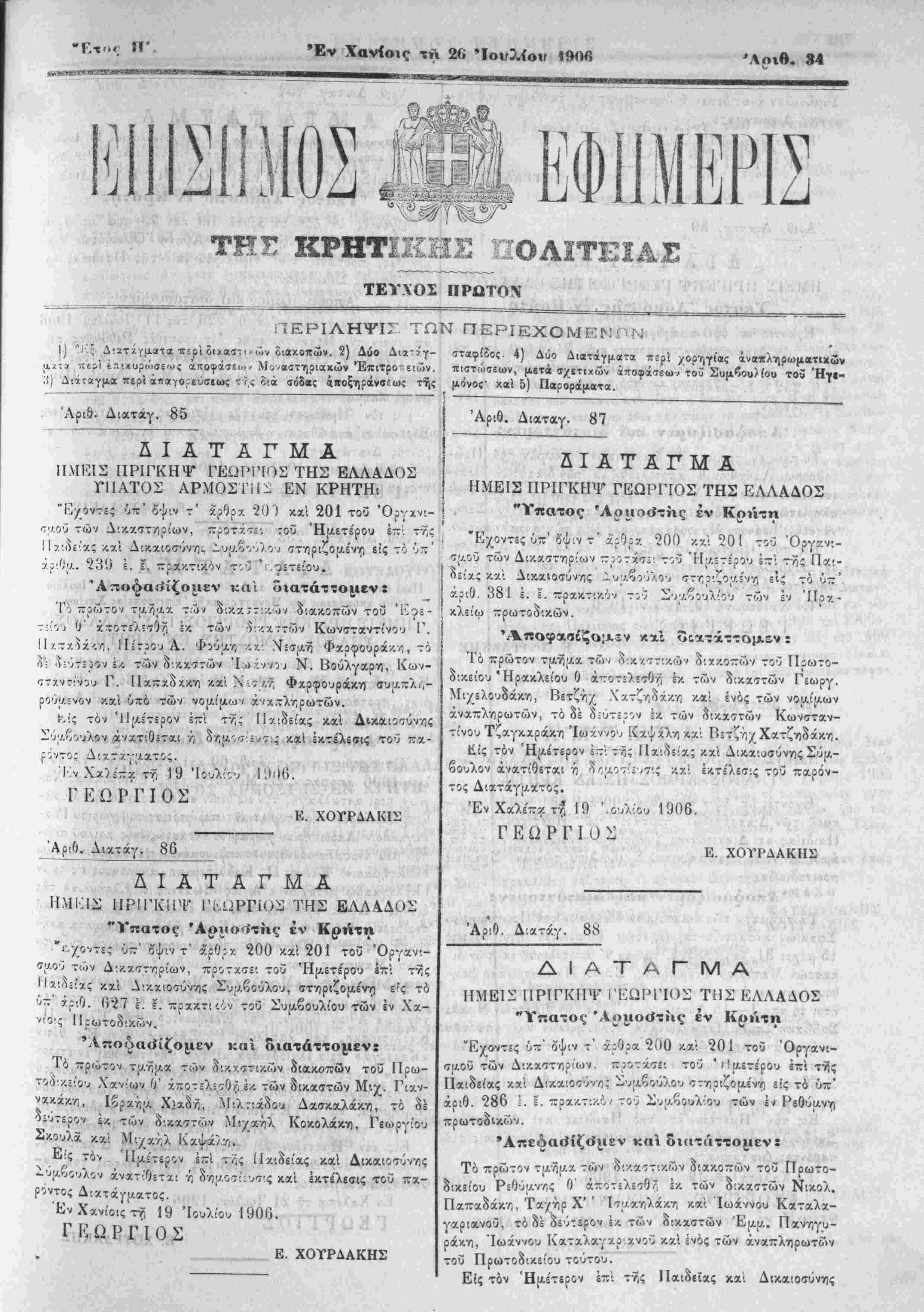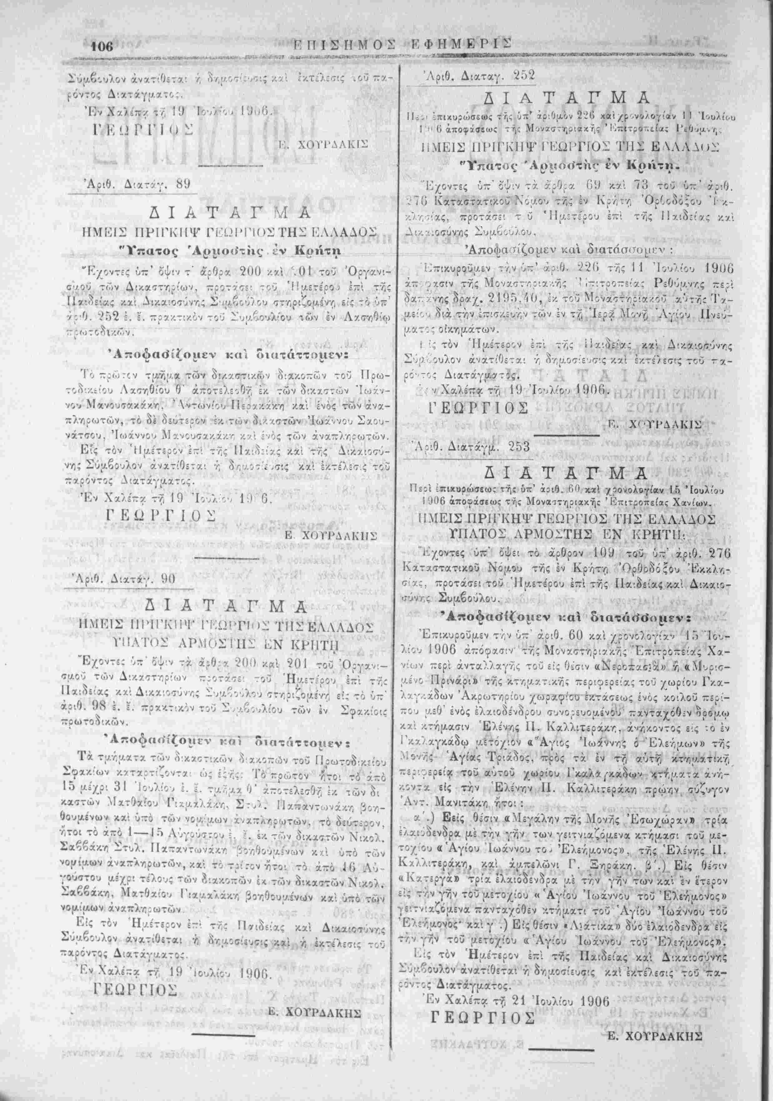 Τό —ρώτον τι«ί[Αχ τ<Τ); ^ λ/τ:·/Λ ι διχ/.οττών τοΰ Πρωτο- οικ,είου Ηρακλείου θ ά-τοτθί^θτί έκ των δΐκαττών Γδωργ. Μιχελουοάκϊΐ, Βετζη/ Χατζιδάκη καί ενός των νου,ίμων άναπληρωτών, τό δέ δ.υτίρον :κ των ο'ικ,Χ'ϊτών Κωνσταν¬ τίνου Τζαγχ.αράκη Ίωχν;ο^ Ινχψίλη λχ' ΒίτζοχΧατζηδάκη. ϋίς τόν Ήαέτερον έ-·, τος Παι^ίίας κχί Λικαιυσύνης Σύμ¬ βουλον άνατίθετχι ή %γ,ί.^",1 ζ /7·ς κχ'ι ΐ/.τίίη:ς τοΰ παρόν¬ τος Διατάγμχτος. ΈνΧαλέ-χτν· 19 '.ουλ'Όυ 1906. ΓΕΩΡΓΙΟΣ Ε. ΧΟΤΡΔΑΚΗΣ . « ο» ί "Αριθ. Διατάγ. 88 Α Ι Α Τ Α Γ Μ Α ΗΜΕΙΣ ΠΡΙΓΚΗΨ ΓΕΩΡΓΙΟΣ ΤΗΣ ΕΛΛΑΔΟΣ "Υπατος Άοιιο<ίτίις έν Κρήτη Ένοντ=ς ΰ·χ όψιν τ' χρθρχ 200 κχί 201 τοΰ Όργανι- ταοΰ των Λ'.κχιττ,ρ'ων. -ρο-τκ'τει τοΰ 'ι'μετέρου επί της Παιδείας κχί Δ'κχιθκτΰνης Συμβούλου στηριζομένη 6·ς τό ύπ' αριθ. 286 !. ϊ. πρχ/.τι/.ό / τοΰ Συαβουλ'Όυ των Ι-ι Ρεθύμνη —ρωτοδικών. 'Απεόαο'ίζ<ίιιεν και διατάττομεν» Τό πρώτον τμημχ των δ·.·/.αστιχ.ων διακοττών τοΰ Πρωτο- δ-.κείου Ρεθύμνης 0' άποτΑεσθί, έκ των δικχστών Νικολ. Παπαδάκη, Τα/ήρ Χ' ' Ιτ;-/χηλάκη καί Ιωάννου Καταλα¬ γαριανου, τό δέ δεύτερον Ι/, των δικχστών Έμμ. Πα,νηγυ- ράκη, "Ιωάννου Καταλαγαριανου κχί ενός των άναπληρωτών τοΰ Πρωτοδικείου τούτου. Είς τόν Ημέτερον επί της ΙΙοαδεϊας κχι Δικαιοσΰνης