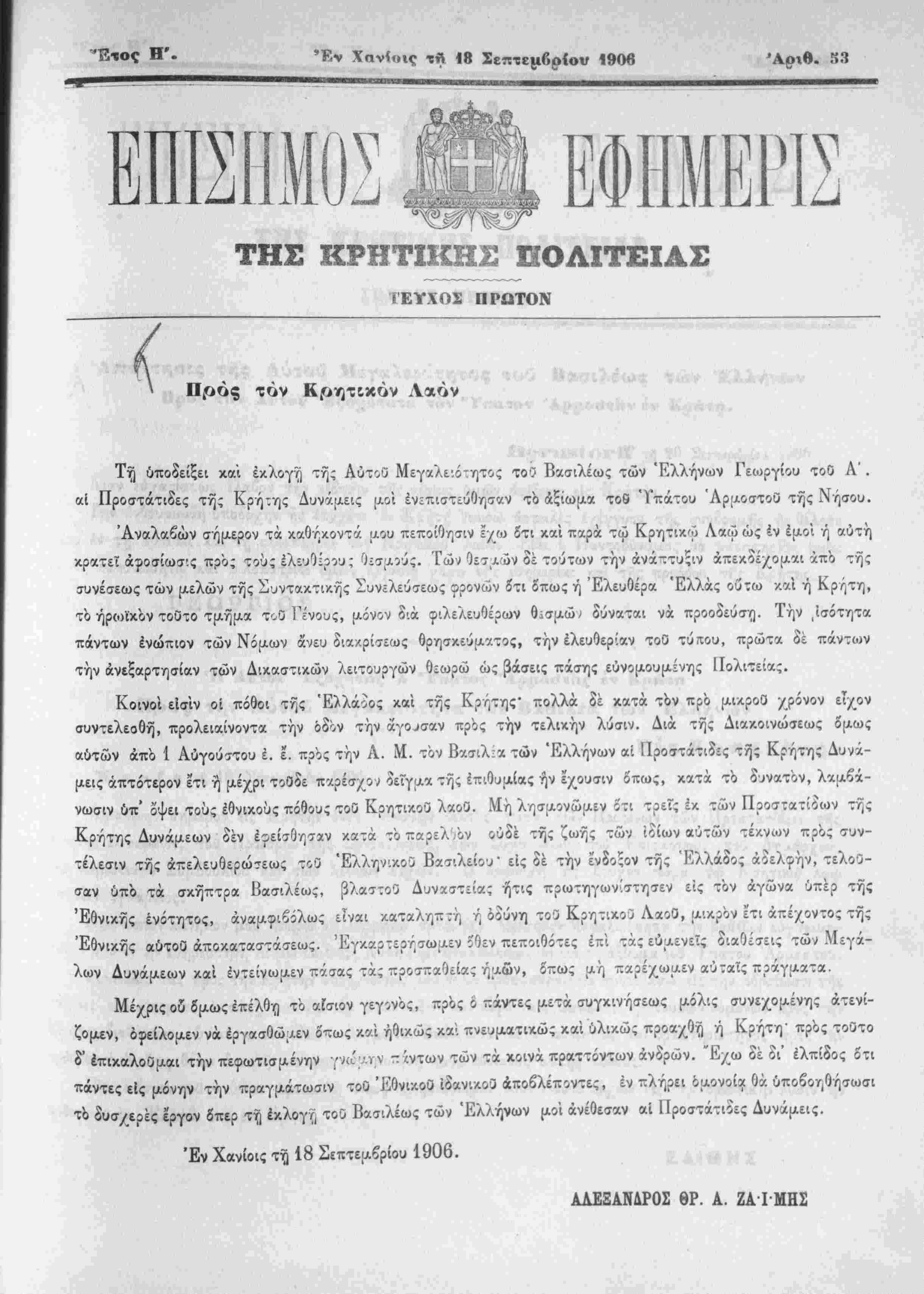 Έν Χανίοις τϊ) 18 Σεπτεμβρίου 1906.