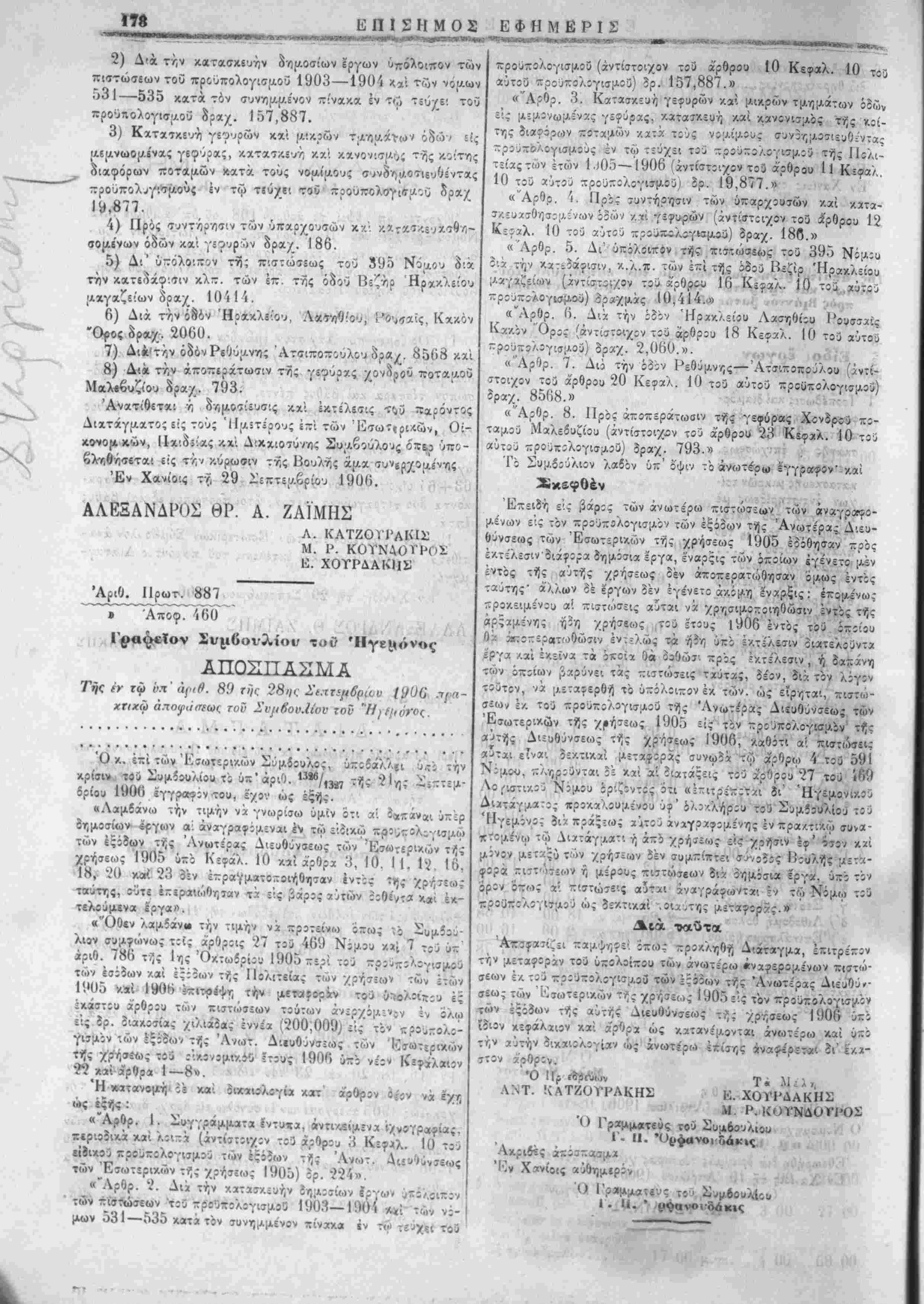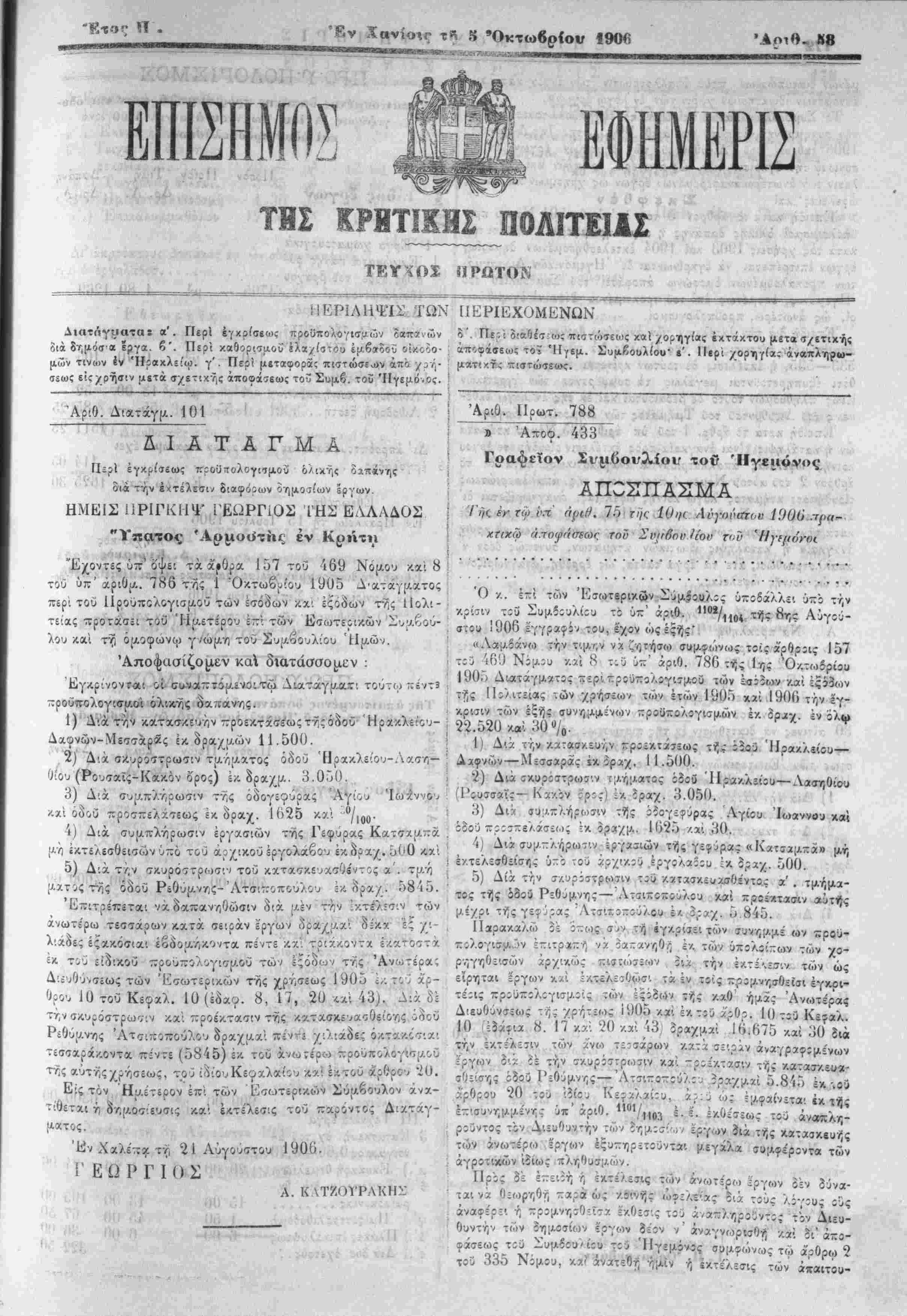 Έν Χ«νί<η? τ* Κ «Οκτώβριον 1906 Άηιβ-, «8 ΤΙΣ ΚΡΗΤΙΚΗ! ΗΜΕΡΙ2 ,.η ι ί,·-ΐ ι ι ' ' ΤΕ1ΓΧΟΧ ΠΕΡΙΛΗΨΙΣ ΤΩΝ ΠΕΡΙΕΧΟΜΕΝΩΝ Λιατάγ^ατα: α'. Περΐ έγχρίσεωί προϋπολογισαών 6απ?ών διά 8'Γ,μόσ α Ιογα. β'. Περΐ καθορισμόν ϊλα/ί'ΐτου έΐλβαοοΰ οίκοϊο- μων τινοιν έν Ηρακλείω, γ'. Περί μβταφορας πιστώσεα>ν άπό /^/,·