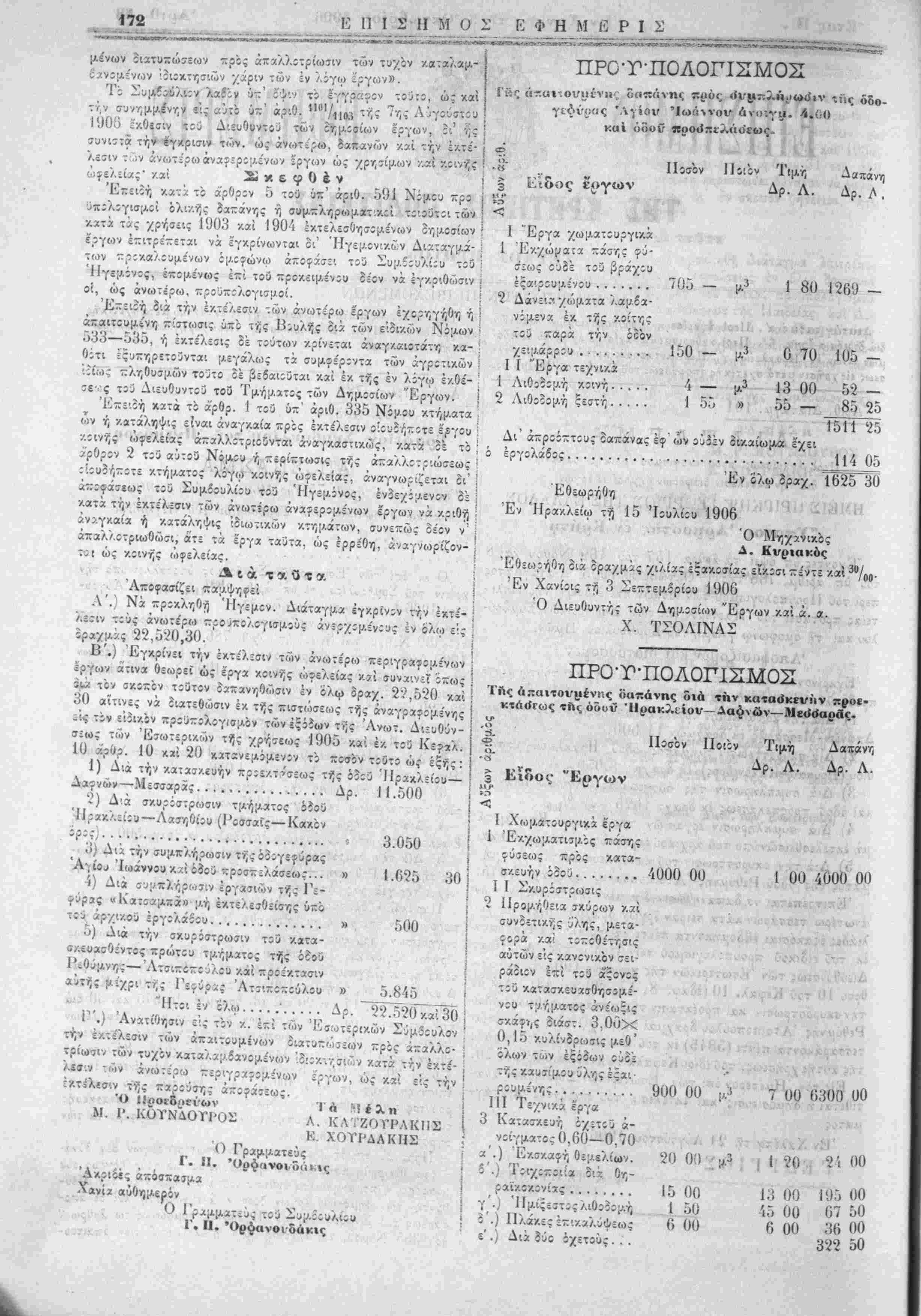 «Λαμίάνω -ήν τιμήν νά γνωρίσω υμιν ι τ1, αί £*ι:άνο<ι. Οτ:';ρ δημοσίων «ργων αί άναγραφΐμ,ίναι έν τώ είίίκώ πρί^ττίλίνισμώ των ές:ίων τής Άνωτί'ρας Διευθύνσεως των Έσωτερικών τί|ς χρήσεως 1905 υ-; Κεφάλ. 10 καί άρθρα ■"), 10. II. 1?. 1ΰ, 18, 20 κοκ" 23 δέν έ-ραγματο-οιήθησαν έντ':ς ι»}; χρήτίω; τβϋτης, ο-υτε έχχρ&Μι'ιθηταν τ): ϊ'ις βχρ;ς αΐύτών ίϊβί'νίϊ Χ*ϊ έκ- τελΐύμενα εργα». «"Οθεν λαμίαν» την τιμήν νί προτείνω ;^ως ·;ο ~υμίΐύ- λιον συμφώνως τ:ϊς αρθροις 27 τού 469 Νόμ.ου κί( 7 τΐό υ" αριθ. 786 τζί 1ης Όκτωβρίςυ 1905 ττερί τού ^οι^πϊλίγίσμοϋ των έσ;?ων /.αί ές:3ων τής Πολιτείας των -/ρήτίΐαν των έτών 11Ό5 ν.αί 19ΟΒ 5-χιτ^Ιψη την μεταφοράν τοΰ Ο^ολίίκςυ έ; ίκάστΐυ άρθρίυ τΐ,ι/ -υτΐι'ισϊων τούτων άνίρχόμι'^ν έν όλω είς δρ. διακοσίας χιλιάίας έννέα (200,009,) ί'ις -ςν ι;ρ5^-ολί- γισμϊν -.ών έςϊδων τής Ανωτ. Διευθύνσεως των Ί τΐ? χρήσίως τού ς··/.ϊνομν/.*Ο ?τ;υς 1906 υπο νε'ΐ *?? καίαρθρα 1—8». *Η «ατανομή. ί3 καί διχαιολογία κατ' άρθρον ό|ίν νά έχη ώς ίί*1ί ·" «Άρθρ. 1. Συγγράμματα Ιντυ«α, άντι«ιμ·να Ίννίγραφίας, Βερ'.οϊικά καί λ:ι-ά (άντίσ;;ιχ:ν τίύ ϋρθρ:^ ,"} ΚεφΛλ. 10 τού εΐϊικού ζρούπίλογισμού των έίόίων τής Ανωτ. Δΐ£'./>ύν;ε<ος των Έσωτΐρικών τής -/ρήσίως 190ο) :ρ. '2'2/ι». «"Λρθρ. 2. Δια την κατασκίυήν δη;χ:σίων Ιργα» ύί:/.5ΐ7::ν ' των ττίστωσεων τ:ϋ πρβ'ΛίλίγισμοΟ 1903—1004 χ*ί- των νί- μων 531—535 κατά τόν συνημμένον πίνακα έν τόι τϊ'^χίΐ τοΰ χρουπολογισμοϋ (αντίστοιχον τού αρθρου 10 Κεφαλ. 10 τού αύτοθ προυχολίγισμοΰ) 3ρ. 157,887.» «Άρ$ρ. 3. Κατασκευή γεφυρών κα'- μικρών τμημάτων άδων εις μεμϊνωμίνας γεφύρας, κατασκίυή /.αί κανονιτμός τής ν.οί- της ίιαβόρίον πβταμών κατά τίος νομίμου; συν2ί;;Α37ΐευ()-'ντα; "ρουτολογισμοΰς έν τω τεύχει τού -ρ5'ο-5Αογισμΐύ τής ΙΙΐλι- τΐίαςτών έτών 1.)05—1906 (αντίστοιχον το3 άρθρου 1ΐ Κ$<ρο:λ. 10 τοΰ Λύτίύ τροΰπολογισμθϋ] δρ. 19,877.» «."Αρβρ. . Πρϊς συντήρησιν των ύπαρχίυσών /.αί -/ατα- σ/.5υα3·0ϊϊσ;;;.ε'ν;,)ν 53ών/.κί γεφυ-ρών (αντίστοιχον τού ίρθρου 12 Κίΐαλ. 10 τού αύτβυ προ^ΐΜ/^γιαμοδ) δραχ. 186.» «Άρδρ. 5. Δι' ύπόλίΐπον τ^ς πισ-τώσίως τού 395 Νί;.ι;υ ί'.ά την κατϊϊά^ισιν, κ.λ.π. των επί τής 5δί3 Βεζίρ Ηρακλείου μαγαζείον (ίντίστίΐ/ον χΛ «ρβρ«ι 16 Κίφαλ»· ίΡ^το^χϋτο^ ττρου-ίλογισμοο) δραχμάς 10,414.-» . 'ήΐίί ■><*■ «Άρθρ. (). Διά την οδόν Ηρακλείου Λασηθίςυ Ρουσσαϊς Κακόν Όρος (άντιστοιχβν τού αρθρΐυ 18 Κεφαλ. 10 τού αυτού -ρουίΐολογισμού) 8ραχ. 2,060.». ,,, . . . ο1^(·'λ «Άρθρ. 7. Διβ την ό3ον Ρεθύμνης—Άτσιποπούλοι» (αντί¬ στοιχον τού ά'ρθρου 20 Κεφαλ. 10 τού αυτού ~ρ«ϋπίλογισμ5ύ) δραχ'. 8508.» «Άρθρ. 8. Πρός αποπεράτωσιν τής γεφΰρας Χονδρ-ο·} πο- ταμού Μαλεβυζίου (αντίστοιχον τού χρβρον 23 Κεφαλ. 10 τ:^ αυτού προυπ;λογισμοθ) 3ραχ· 793.» . ■ Τό Συμδούλιον λαβΐν ώ—' όψιν τό ανωτέρω Έπειδή είς βάρςς των ανωτέρω πιστωσεων των γρφ μένων εις τόν προυπολογισμόν των έξόοων τής Ανωτέρας Διευ¬ θύνσεως των Εσωτερικόν τής χρήσεως 1905 εδόθησαν πρός έχτϊ'λεσιν'Βιάΐΐρα δημοσία έ'ργα, έναρξις των οποίων εγένετο μέν έντός τής οώτής χρήσεως δέν άττοπερατώθησαν όμως έντός ταύτης" ά'λλων δέ ?ργων δέν εγένετο άκόμη έναρξις: ώ υ η ρ γ ρ ρμ "ροκειμένου αί πιστώσεις αυται να χρησιμοποιηθώσι1/χέντ,ός τής άρςαμένης ή;η χρήσεως ,τοδ ετους ΐ906 έντός τόϋ όπΐίου Οά ίκΐττΐρατίοθώσιν Ιν.ϊλώς τ« ήϊη υπό εκτέλεσιν διατελούντα Ιργα *αί έκεϊνα τα 'οκοϊ-χ θά οοθώσ'. πρός εκτέλεσιν , ή δαϊάνη των οποίων βαρύνει τάς -ιστώσεις ταύτας, δέον, 5ιά τόν λόγον τούτον, νά μίτα^ρερθή τό υπόλοιπον έκ των. ώς είρηται, πιστώ- σίων ι/, τού προυπςλογισμοΰ τή; Ανωτέρας Δΐϊυθύνσεως των Εσωτερικήν τής χρήσεως 1905 είς τόν προυπολογισμόν1 τής αότής Διευθύνσεως τή
