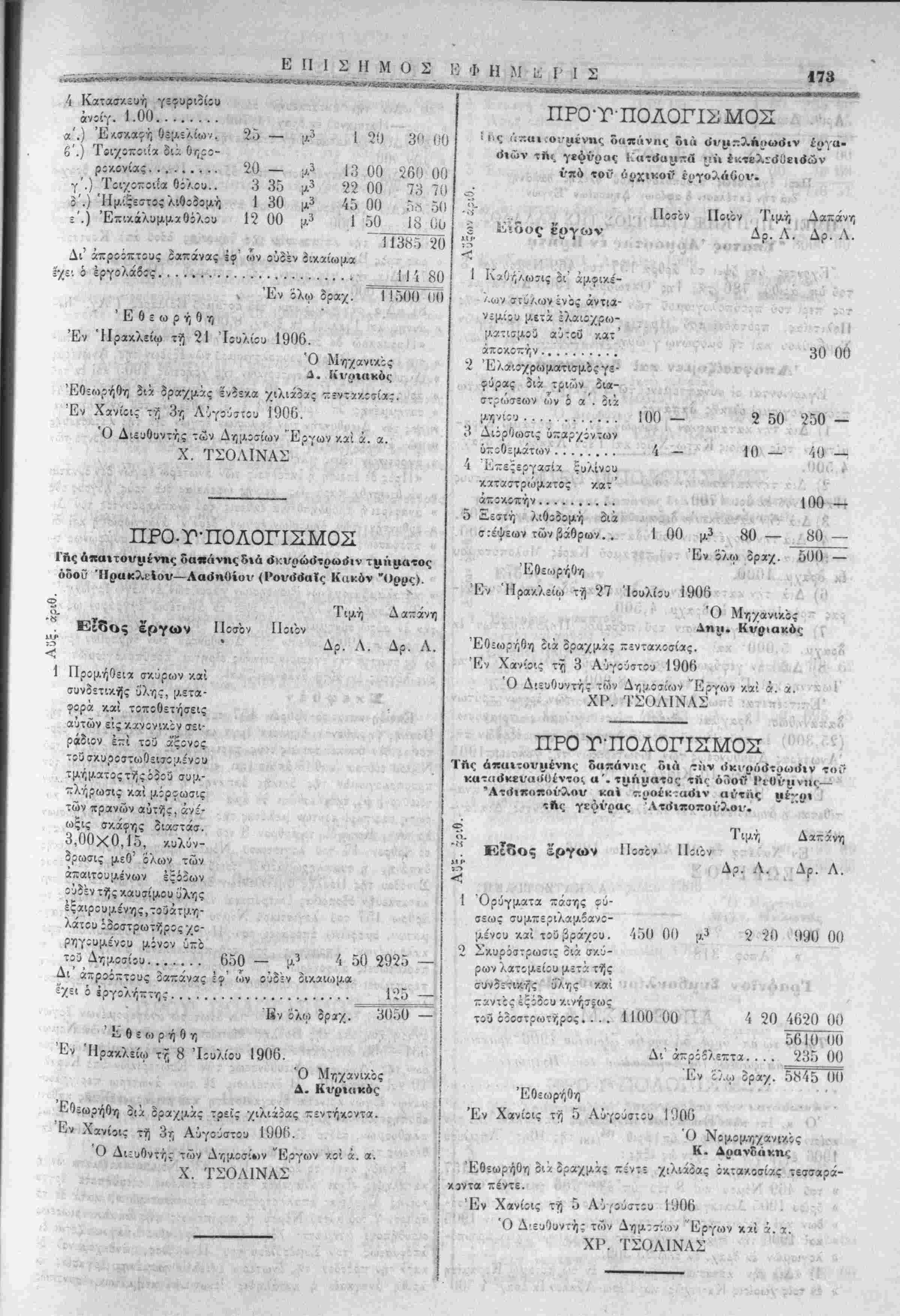 Τή*, έτ τω ΐ'.τ' αριθ. 75< τής Ι9ιμ Λΰγοναχοο 1006 π χΐιχφ αποφάσεως τοϊ) Σιψβο» Ηον τού ΐί "·' Ό ν., επί των Έσωτβρικ&ν ΣύμΙοολος ύ-οδάλλει ύπϊ την κρίσιν τ:ΰ Συμβουλιου το ύπ' αριθ. 1Ι0*/ι104 τής 8ης Αύγού- στου ι906 ϊγγραφί; τού, έχον ώςέςής' «Ααμβάνω την τιμΓ,ν νά ζτ,τήσω συμφο'ινως τοις ά'ρθοΐις 157 τί3 46!) Νίμου /.αί 8 τςί Οπ' αριθ. 786 τής 1ης 'Ο/.τωδρίου 1905 Διατάγματος περιπρϊυπολβγΐϊμοϋ των έοϊϊον /.αί έξΜων τής Πο/ιτειας -.ών χρήσεων των έτών 1905 χαί 1906 τί-,ν έγ¬ κρισιν των εξής συνημμένων ττροί»πώλογισμο")ν έ/, ϊραν έν ό)ω 22.520 καί 30%. Η Λ V 1) Δ·.ά την κατασκευήν προτάσεως τ<«; ;50^ Ήραχλίίου—- Δαφνών—Μεσσαράς ίκίραχ. 11.500. 2) Διά σκυρέστρωσ-ν :;λήματος όδοΰ Ίίρα/.λείου— Λασηθίου (Ρουσσαΐς— Κακόν ΐ'ρ:ς) έκ ?ραχ. 3.050. 3) Διά βυμπλήρωσιν τής όίογεφύρας Άγίου Ιωάννου καί όδού προσπελάσίΜ; :κ οραχμ. 1625 /.αί 30. 4) Διά συ[θ-λήρω7ΐν έργαζιών τής γεφύρας «Κατσαμττά» μή έκτελεσθείσης ά-ι τού άρχικου έργολαΐϊυ έκ 24ς-αχ. 500. 5) Δία τί;ν τ/^ρίΐτρωτιν τ;υ ■/.ατασκεκασθϊ'ντοί α' . τμήμα- τος τής όδοΰ Ρεθήμνης— Λτΐιιΐοπουλίυ καί -ρβέ*τβοΊν αυτής ιί·/θί τήςγεφύίας Άτσΐϊθ-ίύλου ϊ*. 3;αχ. 5 845. Παρακαλώ δέ 'ό-ως α^ι τή ·γκρί«ει χών συνημμε ων -ρου- ιτολογισμ^ν έζιτρ»-^ νά ΐα-ανΓ,θ/; έ·/, των ϋπίλβί^ων των χο- ρηγηθεισών αρχικώς πισκόσεΜν οά την έκτέ',εσιν των ώς είρηται έργων %Λ ί/.τελεοθώσι -ά |ν τοίς ττρίμνησθείσι έγκρι- τε'ιις πρίυπίλίγισμίΐς των ^έςίδ^ν τής καθ' ημάς Ανωτέρας Δ 10 ■ίΐς πρ;υπΐΛ:γισμ;ις των ες3ο»ν της %χ) ήμ2[; Ανωτέρας ;ευθύνσ;ως τής "/ρήτεως 1905 /αί έκτίύ α'ρθρ. 1()τ;ϋ Κε?αλ. Ο ',έίάφια 8. 17 κα· 20 /.αί 43; δραχμαί 16.675 -/.αί 30 διά '« ι4* ι:ι ί>0 ό»