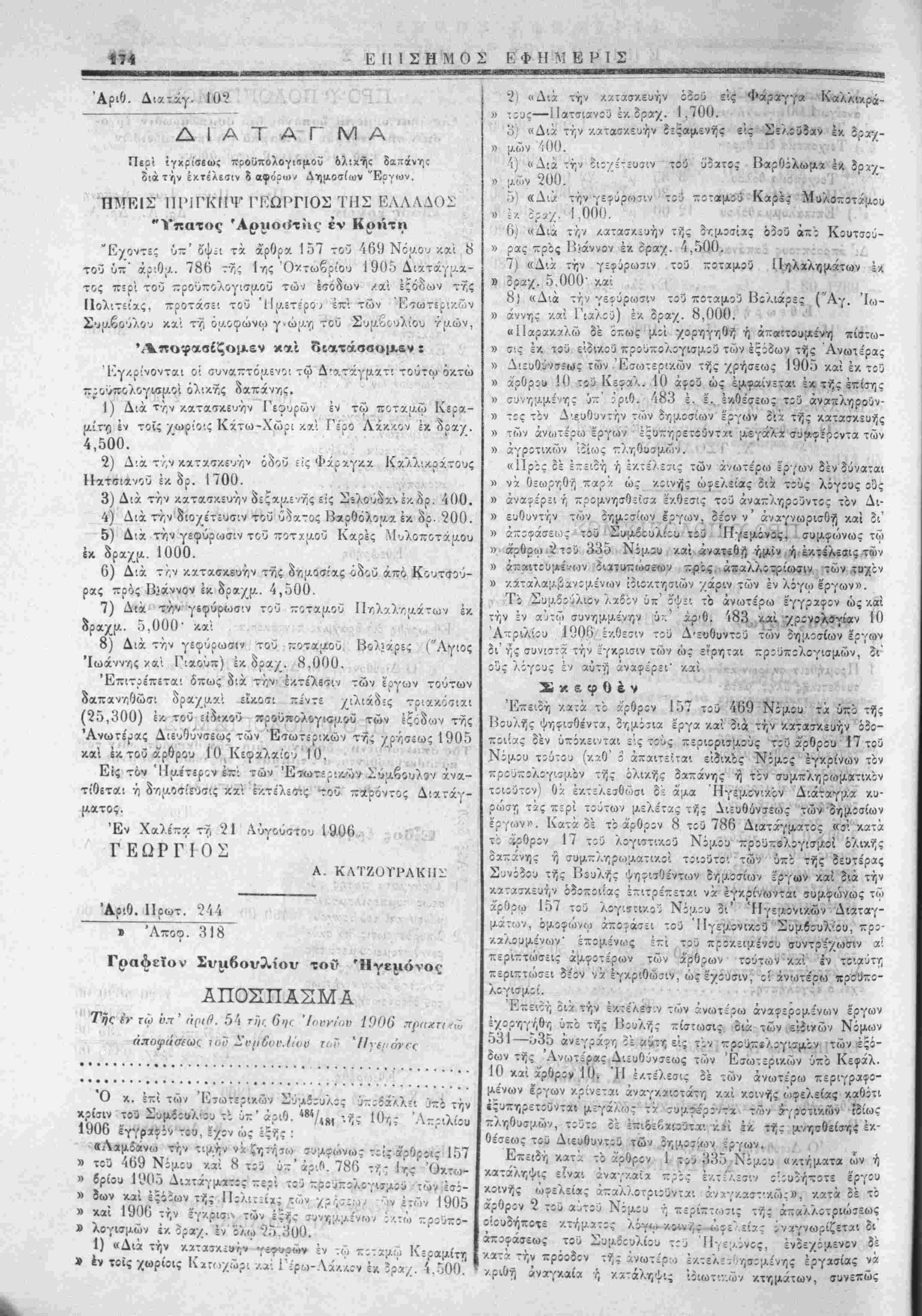 λον ΛβΧ τή όμο<ρωνω γ/ωμη τού Σν[/.βουλ·ου Ημών. Αποφασίζομεν καί διατάσσομιτν : Εγ/,ρινοντΛΐ οί σο-νΛπτό^νο'τ<)ί Δω,τάγμΛΛΊ τούτω «εντ3 ~ροϋίτολογΕσ(Λθ·Ί όλικής δα,,τανης. 1) Διά την κατα,σκευήν—ροεκτάσεωςτήςόδοΰ Ήρακλείον- Δαφνών-Μεσσαράς έκ δραχμών 11.500. 2) Διά σ/νροστρωσιν τμήαατος οδόν Ήρχ/.λείον-Λαση— Ο'θν (Ρονσαϊς-Κακόν όρος) Ι. δραχμ. 3.050. 3) Διά συμπλήρωσιν τής οδονόγΐ'-ίρας Άγιον Ιωάννου Λωί ο6&υ προσπελάσεως έκ δραχ. 1625 κα.ί °/|00· Ί) Διά συμπλήρωσιν εργασιών τής Γεφνρας Κατσκ[Λ~δι > 4 «ΛτίΛεσθεισών υπο τοϋ άοχικοΰ εργολάβον έκδρχν. 5(Ό κ,χί