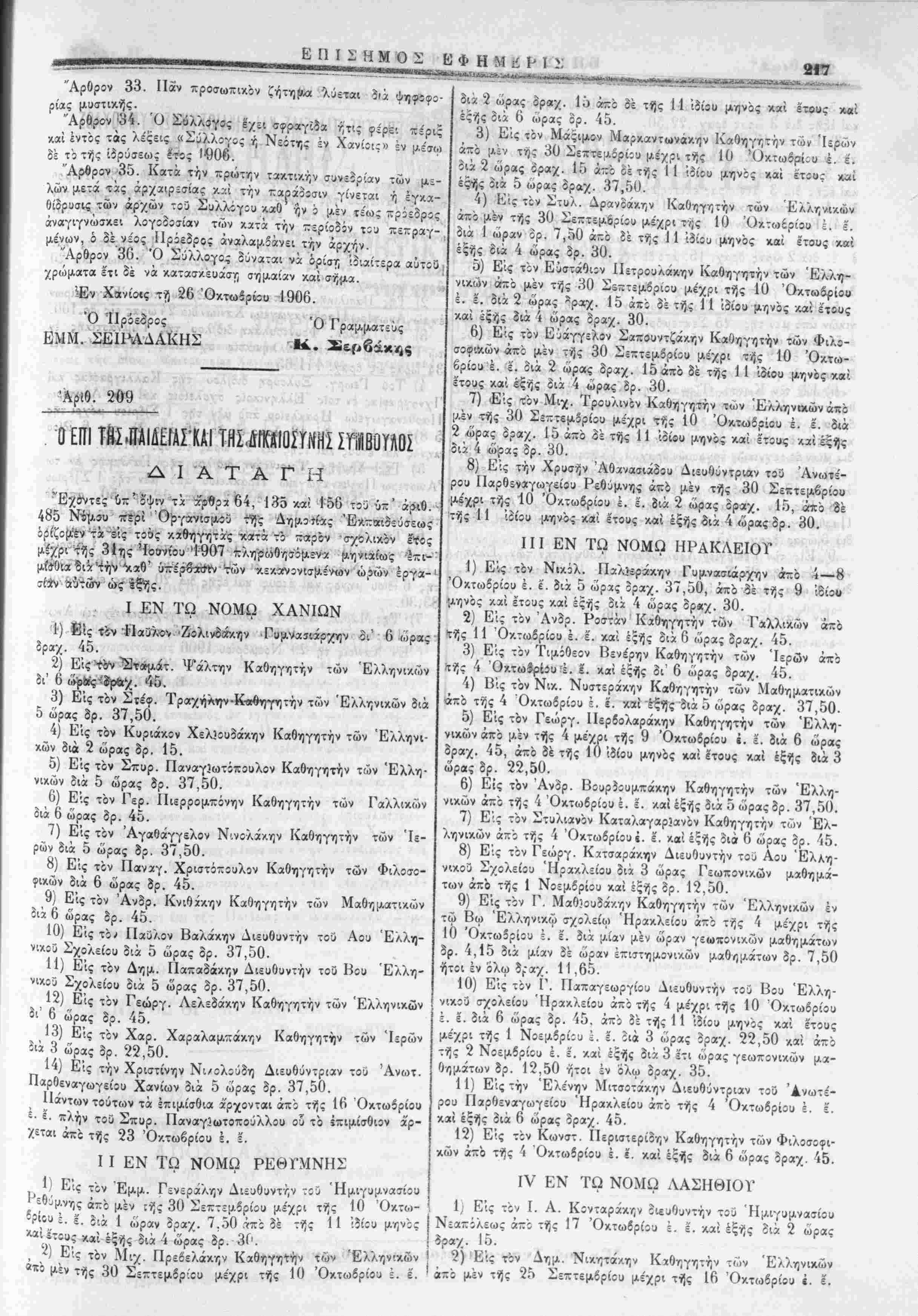 Άρθρον 33. Παν προσωπικόν ζήτηβ,α 'λύεται διά ψη"<ρ5- ρίας μυστικάς. Άρθρον ^34. Ο Σόλλογος εχει σφραγΐία ήτις φίρε-, πέριξ •λαΐ έντός τάς λε'ςεις «Σύλλογος ή Νεότης έν Χανίοις» έν μέσω δέ τό τής ιδρύσεως ίτΌς Ι'ΘΟδ. "Αρβρον 35. Κατά την πρώτην τακτικήν συνεδρίαν των μ=- λών μετά τάς αρχαιρεσίαι -/..-.ι την παράδίσιν γίνεται ή εγκα¬ θίδρυσις των άρχών τού Σύλλογον καθ ήν ο μέν τέως -ρίίζρος άναγιγνώσκει λογοοΐσίαν των κατά την περίοδον τ:υ πεπραγ- μένων, ό δένί'ος Ηρόεδρβς άναλαμβάνει την αρχήν. Άρθρίν 36. Ό Σύλλογον δύναται νά ορίση ιδιαιτέρα αυτού χρώματα έ'τι δέ νά κατασκειιάσι; σημαίαν καί σήμα. ι£ν Χανίοις τί) 26 Όκτωβρκυ 1906. Ό Ίΐρόεδρος Ό Γραμματεύς ΕΜΜ. ΣΕΙΡΛΔΑΚΗΣ Κ. Αριθ. 209 •ί ΕΙίΙ ΤΜΙΑΕίΑΠΑΙ ΤΗΣΛΜΥΙΜΙΣ ΣΥΙΒΟΥλΟΣ :" * Α Ι Α Τ Α Γ Η Έχοντες"υπ^δψϋν τα *άρτ)ρα 64, 135 κ·α' 156 τού ύπ' αριθ. 485 Ν^μου πΐρί "Οργανισμόν Γϊ}ς Δημοτί-ας Έκπαιδ-ύσεως ό^ίζομ'εν τα "είς τοός καθηγητάς -κατά τό παρόν -σχίλικόν ετος μένρι τής 3ίης Ίοσνίου Ί'907 πλη"ρωθϊ;σ·όμδν.χ μηνιαίως ίπι- μίσΐια διά'τήν ναθ' υπέρβασιν των •/.εκοτνονισμένων ώρών έργα-' ΐία αύΐών ώζνζής. . Ι £Ν ΤΩ ΝΟΜΩ ΧΑΝΙΩΝ Ι1) $3ίς τόν ·ί1αΰλ·ον 'Ζολινδάκην Γυμνασιάρχην -δι" 6 ώρας δραχ. 45. 2) Ε'ιςτ>όν ^Ιτ<»μάτ. Ψάλτην Καθηγητήν των Έλληνικών δι' 6 ώ^δίς-φρΐ'χ. 45. 3) Είς τόν Στέφ. Τρ<αχήλην·Κ«θηγητήν των Έλληνικών διά 5 ώρας δρ. 37,50. 4) Είς τόν Κυριάκον Χελ3ονδάκην Καθηγητήν των Έλληνι¬ κών διά 2 ώρας δρ. 15. δ) Είς τόν Σπύρ. Παναγ'ωτόπονλον Καθηγητήν των Έλλη- νίκων διά 5 ώρας δρ. 37,50. 6) Είς τόν Γερ. ΙΙιερρομπόνην Καθηγητήν των Γαλλικήν διά 6 ώρας δρ. 45. 7) Είς τόν Άγα&άγγελον Νινολάκην Καθηγητήν των Ίε¬ ρών διά 5 ώρας δρ. 37,50. 8) Είς τόν Παναγ. Χριστόπουλον Καθηγητήν των Φιλοσο- Φΐκών διά 6 ώρας δρ. 45. 9) Είς τόν Ανδρ. Κνιθάχην Καθηγητήν των Μαθηματικών διά 6 ώρας δρ. 45. 10) Είς τό; ΙΙαΰλον Βαλάκην Διευθυντήν τού Αου Ελλη- νιχοΰ Σχολείου διά 5 ώρας δρ. 37,50. 11) Είς τόν Δημ. Παπαδάκην Διευθυντήν τού Βου Ελλη¬ νικόν Σχολείου διά 5 ώρας δρ. 37,50. 12) Είς τόν Γεώργ. Λελεδάκην Καθηγητήν των Έλληνικών δι 6 ώρας δρ. 45. 13) Είς τόν Χαρ. Χαραλαμπάκην Καθηγητήν των Ίερών ϊ« 3 ώρας δρ. 22,50. 14) Είς την Χριστίνην Νι/ολούδη Διευθύντριαν τού Ανωτ. Παρθεναγωγείου Χανίων διά 5 ώρας δρ. 37,50. Πάντων τούτων τα έπιμίσθια ά'ρχονται άπό τής 16 Όκτωβρίου = ■ έ'. πλήν τού Σπύρ. Παναγ'ωτοπούλλου ου τό ίπιμίσθιον ά'ρ- 7.£ται άπό τής 23 Όκτωβρίου έ. ϊ. Ι Ι ΕΝ ΤΩ ΝΟΜΩ ΡΕΘΓΜΝΗΣ ) 1) Είς τόν Έμμ. Γενεράλην Διευθυντήν τί υ Ημιγυμνάσιον Ρεθύμνης άπό μέν :ής 30 Σεπτέμβριον μέχρι τής 10 Οκτω- '?ί^:. 'έ. διά 1 ώραν δραχ. 7.50 7πό δέ τής 11 ·Βί=υ μηνός **ι ίτους καί εξής διά 4 ώρας δρ. 3('. '-) Είς τόν Μιχ. Πρεβελάκην Καθηγητήν των Έλληνικών «πό μέν τής 30 Σεπτεμβρίου μέχρι τής 10 Όκτωβρίου έ. ε. διά 2 ώρας δραχ. 1ό άπό δέ τί)ς 11 Ίδίου μηνός καί έ'τους κ«ί έςής διά 6 ώρας δρ. 45. 3) Είς τόν Μ-άςιμον Μαρκαντωνακην Καθηγητήν των Ίερών άπό μέν της 30 Σεπτέμβριον μέχρι τής 10 Όκτωδρίΐυ έ. έ. διά 2 ώρας οροιχ. 15 άπό έέ τής Ι 1 ίδίου μηνός καί έτουί καί εξής διά 5 ώρας δραχ. 37,50. 4) Εις τόν Στυλ. Δρανοάκην Καθηγητήν των Ελληνικών άπό μέν τής 30 Σεπτέμβριον με'χρι της 10 'Οκτωέριου ;. έ'. διά 1 ώρχν δρ. 7,50 άπό δέ τής 11 ίδίου μηνός καί έ'τους καί εξής διά 4 ώρας δρ. 30. 5) Είς τόν Εύστάθιον ΠετρουΛακην Καθηγητήν των Έλλη¬ νικών άπό μέν τής 30 Σεπτέμβριον μέχρι τής 10 Όκτωβρίον έ. 'έ. διά 2 ώρας "ραχ. 15 άπό δέ τής 11 Ίδιον μ^νός καί έ'τονς καί ίξής διά ί ώρας δραχ. 30. 6) Είς τόν Εύάγγελον Σαπουντζάκην Καθηγητήν των Φιλο- σοφι'/ών άπό μέν τής 30 Σεπτέμβριον με'χρι της 10 "Οκτώ¬ βριον έ. έ. διά 2 ώρας δραχ. 15 «πό δέ τής