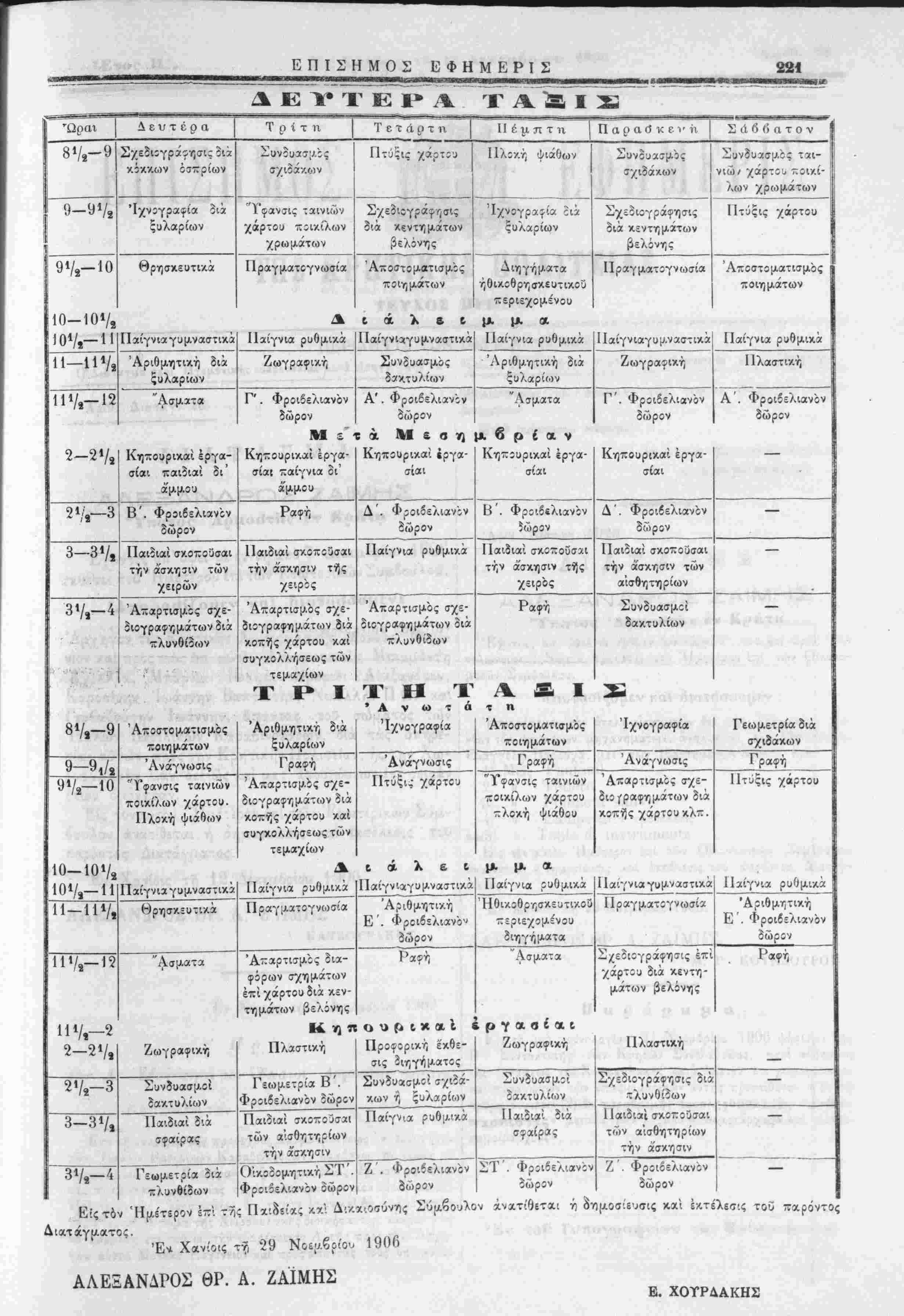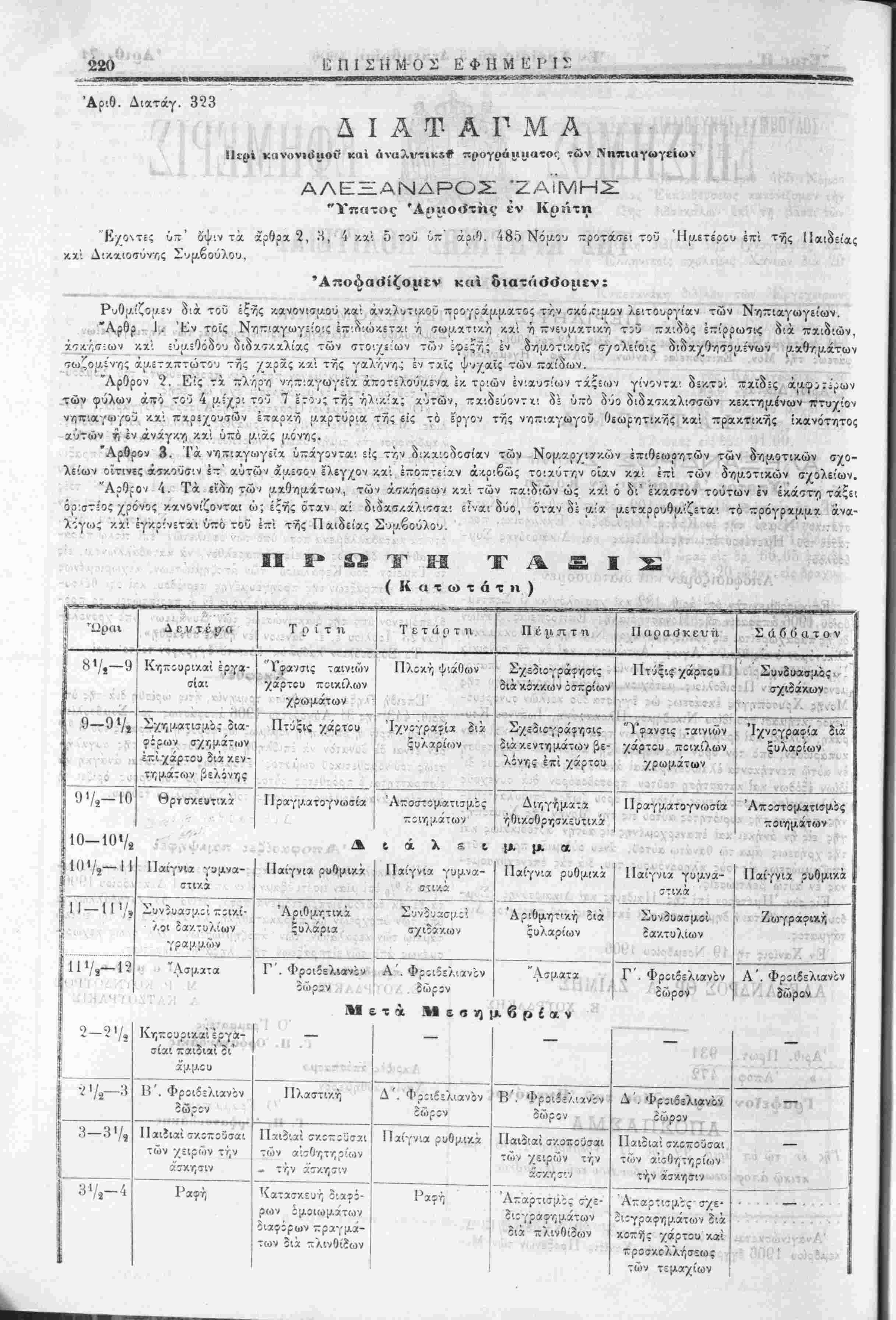δακτυλί<ον Φροιβελιανόν δώρον κων ή ιςυλαρίων θακτυλίων τλυνδιθων 3—31/, ΙΙαιδιαί διά Παιδιαί σκοττούσαι Παίγνια ροθμιχά Παιδιαί διά Παιδιαί σκοττούσιχι — σφαιρας των αίσθητηρίων σφαίρΛς των αίσθητηρίων την ά'σκησιν την ασκή σιν 3*/,—4 Γεωμετρία διά ΟίκοδομητικήΣΤ'. Ζ . Φροιβελιανόν ΣΤ'. Φρΐιβελιανον Ζ Φροιβελιανΐν — πλυνθίδων Φροιβελ'.ανον δώρον δώρον οώρΐν δώρον Είςτδν Ημέτερον 1~ τος Παι^ίχς λχ; Δι/.α-.νσύνης Σύμβουλον άνχτίθεται ή δΥΐμ,οσίευβις καί έ/.τέλεσις τού παρόντος Διατάγμ,ατος. Έμ Χανίοις ττ, 29 Νοέμβριον 190η ΑΛΕΞΑΝΔΡΟΣ ΘΡ. Α. ΖΑΙΜΗΣ Ε. ΧΟΤΡΔΑΚΗΣ