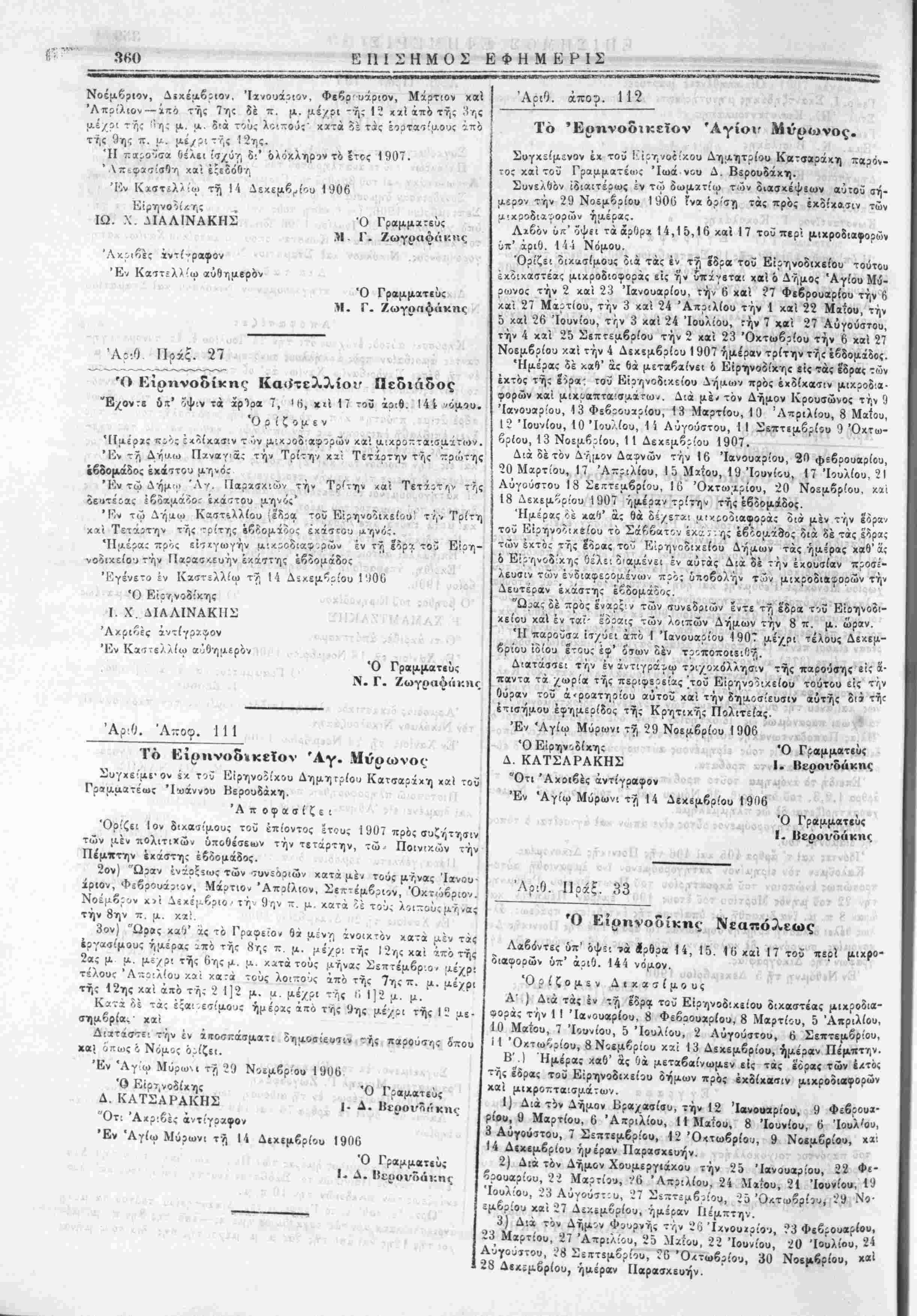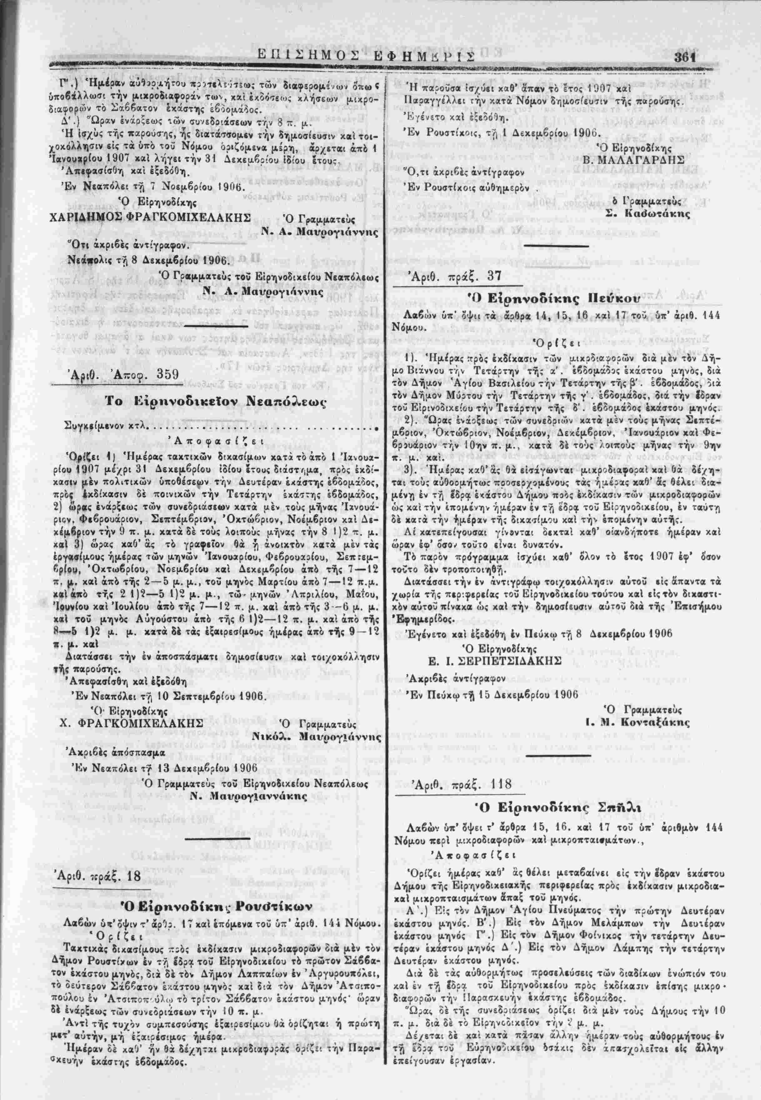 Ρ'.) Ημέραν αύ93θ;χήτου πρ^ιιλϊί-ΐϊω; των διαφερομ* .χον δπω < υποβάλλωσι την μικρο&ι«φοράν των, χαί έχοότεω.; χλήσεων μιχρο- διαφορών τό Σάββατον έχάστης εβδομάδος. Λ'.) "Ωραν ένάοξεως αών συνεδοιάσεων την 3 π. μ. Ή ίσχΰς τής παρούσης, ής διατάσσομεν την δημοσίευσιν καϊ τοι- χοκόλλησιν είς τα υπό τοϋ Νόμου οριζόμενα μίρη, άρχεται άπό 1 Ίανουίρίου 1907 καϊ λήγει την 31 Δεκεμβριού ϊδίου ϊτους Απεφασίσθη καϊ εξεδόθη. Έν Νεαπόλει τή 7 Νοεμβριού 191)6. ' - ν ■ Ό Εΐρηνοδίχης ' ' ΧΑΡΙΑΗΜΟΣ ΦΡΑΓΚΟΜΙΧΕΛΑΚΗΣ Ό Γραμμαίς Λ. Α. Μανρογιάννης Ότι άχριβές αντίγραφον. Νεάπολις τ7, 8 Δεκεμβριού 1906. Ό Γραμματεύς τοϋ Είρηνοδικείου Νεαπόλεως ■ι οί ,Ν- ;·■ ,,;' Ν. Α. ΜανρογιΛννης Ά?<6. 'Α-οφ. 359 Τ ο Κιρηνοδτκεΐον Νεαπόλεως- Συγχείμενον κτλ.................................. 'Αποφασίζει Όρίζει 1) Ημέρας τακτικών διχασίμων χ»τ*τόάπό 1 Ίανουα- ρίοο 1907 μέχρι 31 Δεχεμβρίου ίδίου ϊτους διάστί,μα, πρός έκδί- χασίν μέν πολιτικών 6ποθέσερ>ν την Δευτέραν έχάβτης εβδομάδος,