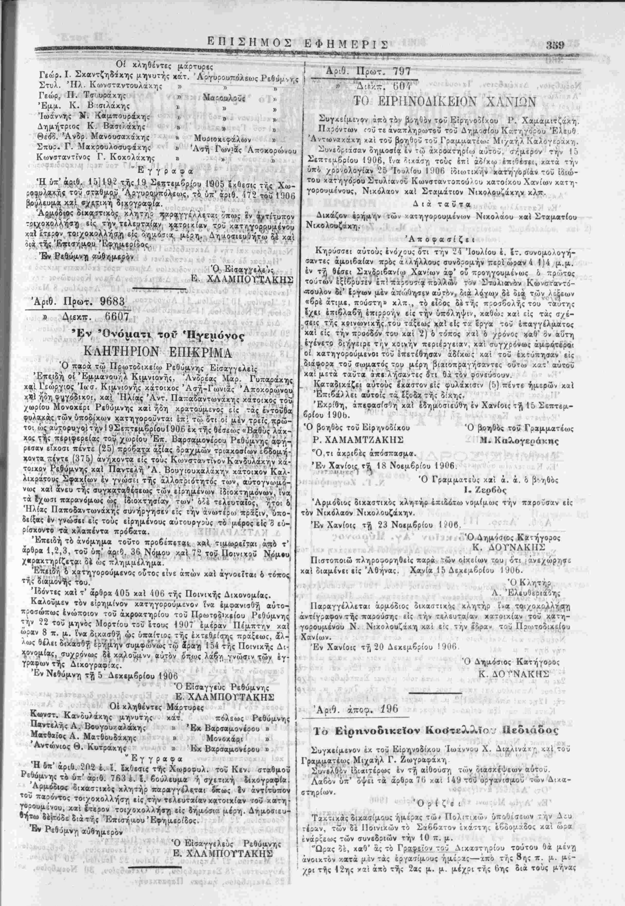 Έν Σηήλι τγί 6 Λε<6μβ=Όυ 1906. Ό Γραμματεύς Λ. Α. Παπαγιαννάκης Αριθ. . 59, Τό ΕϊρηνοδικεΙον Ι*οι;ο5τίΐίων Συγχε'μενον Συνελθόν . . Άποοασίζί ι ρίζίΐ—Α' τακτικάς δικασιμο^ προ; ;χδ/χοι<ΐιν πολιτικών μέν τής συν^Οους διαδίκαα^ς τ^ν Τρ'-ην έκίσττ,ς εβδομάδος ποΐνιχών δέύχο^εσεων την Πέμπτην εκάστη, εβδομάδος—Β' Όοαν ένχρξίω; των συνεδριάσει»)·/ δια μέν γο άπό Ιη>, Απριλίου μεχρΐ Ιης