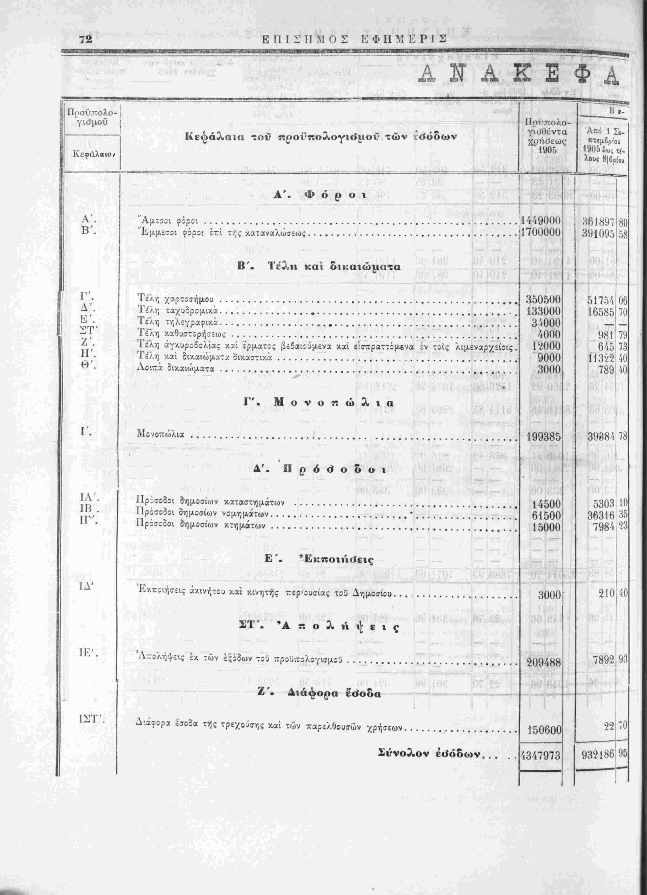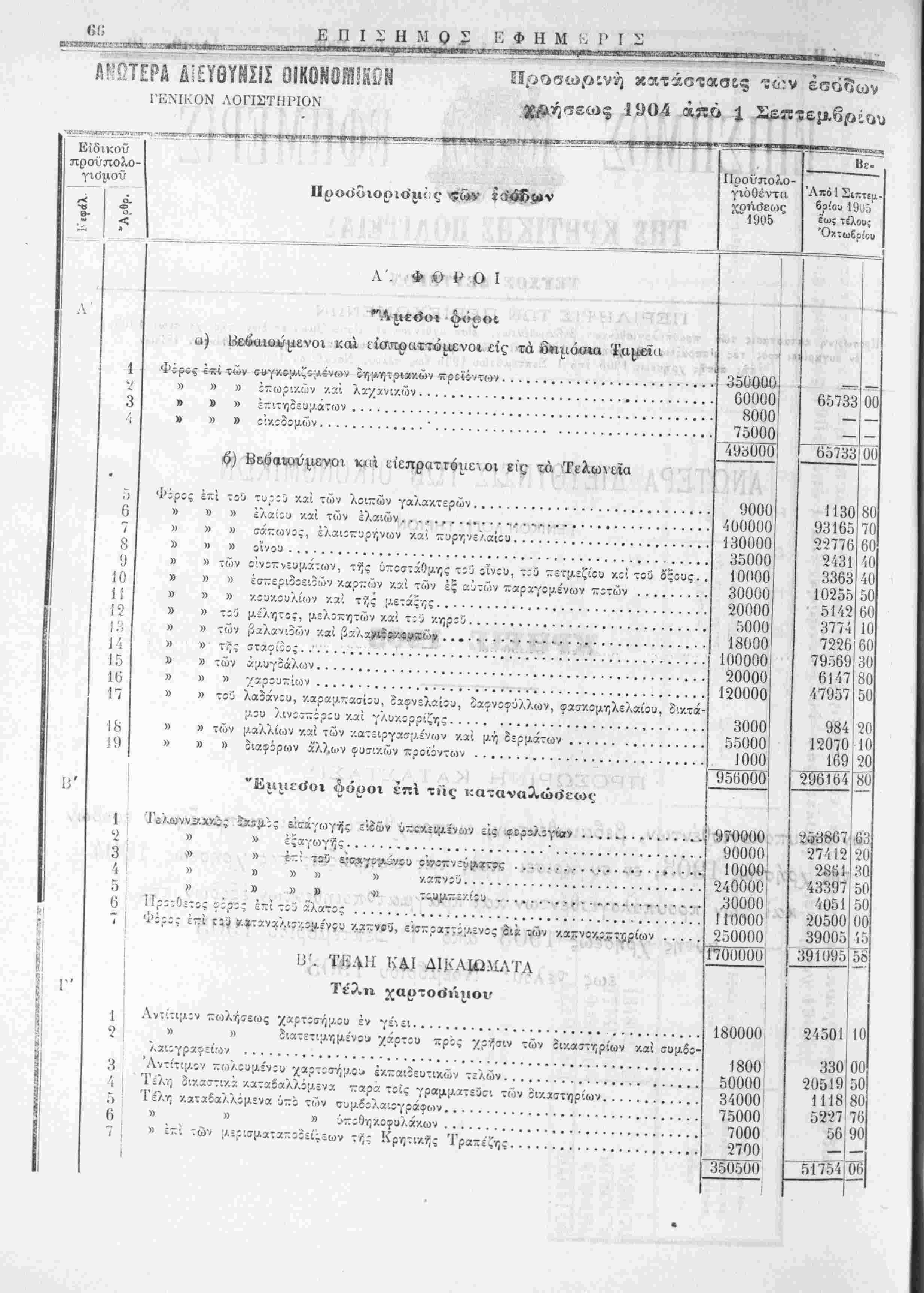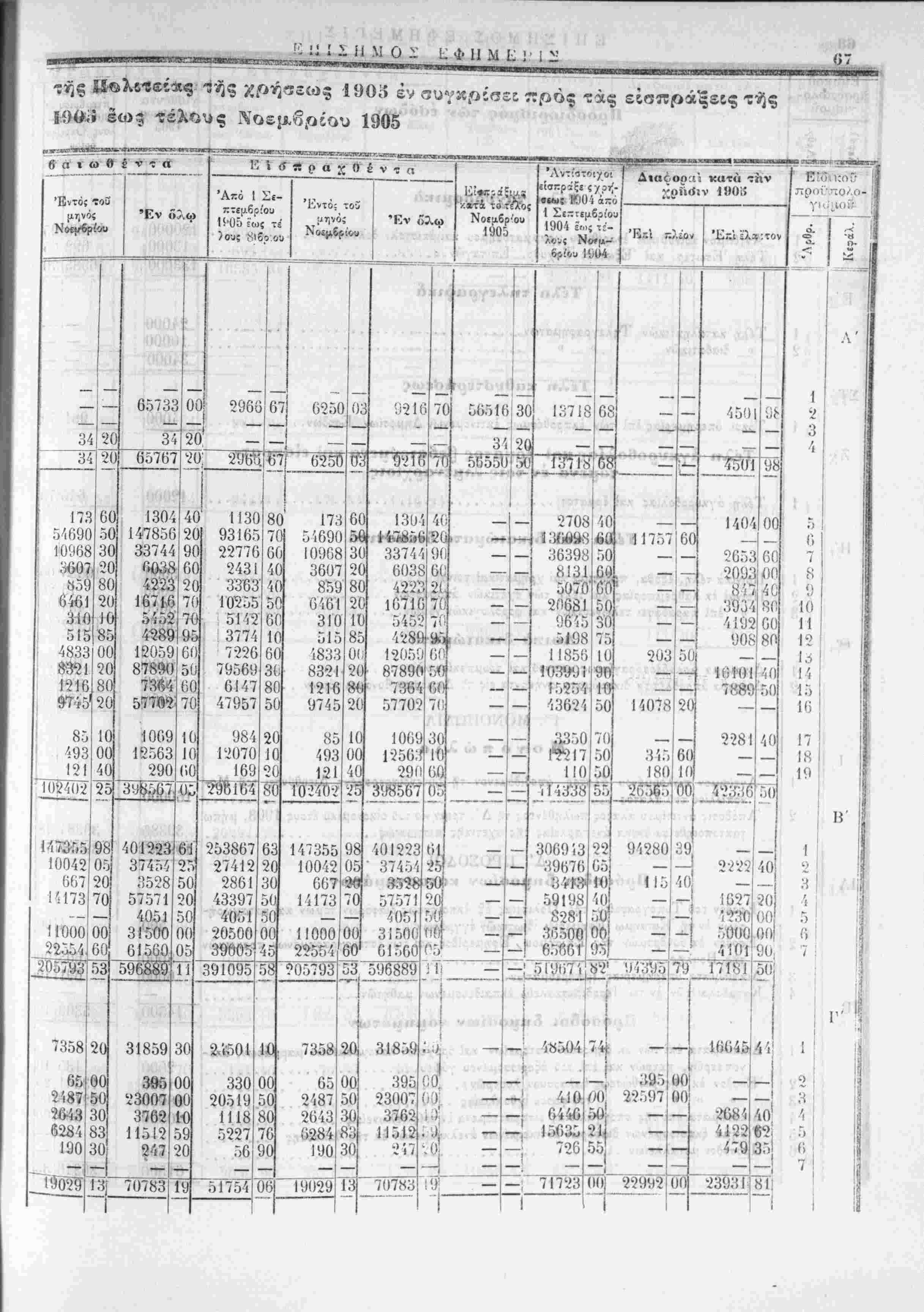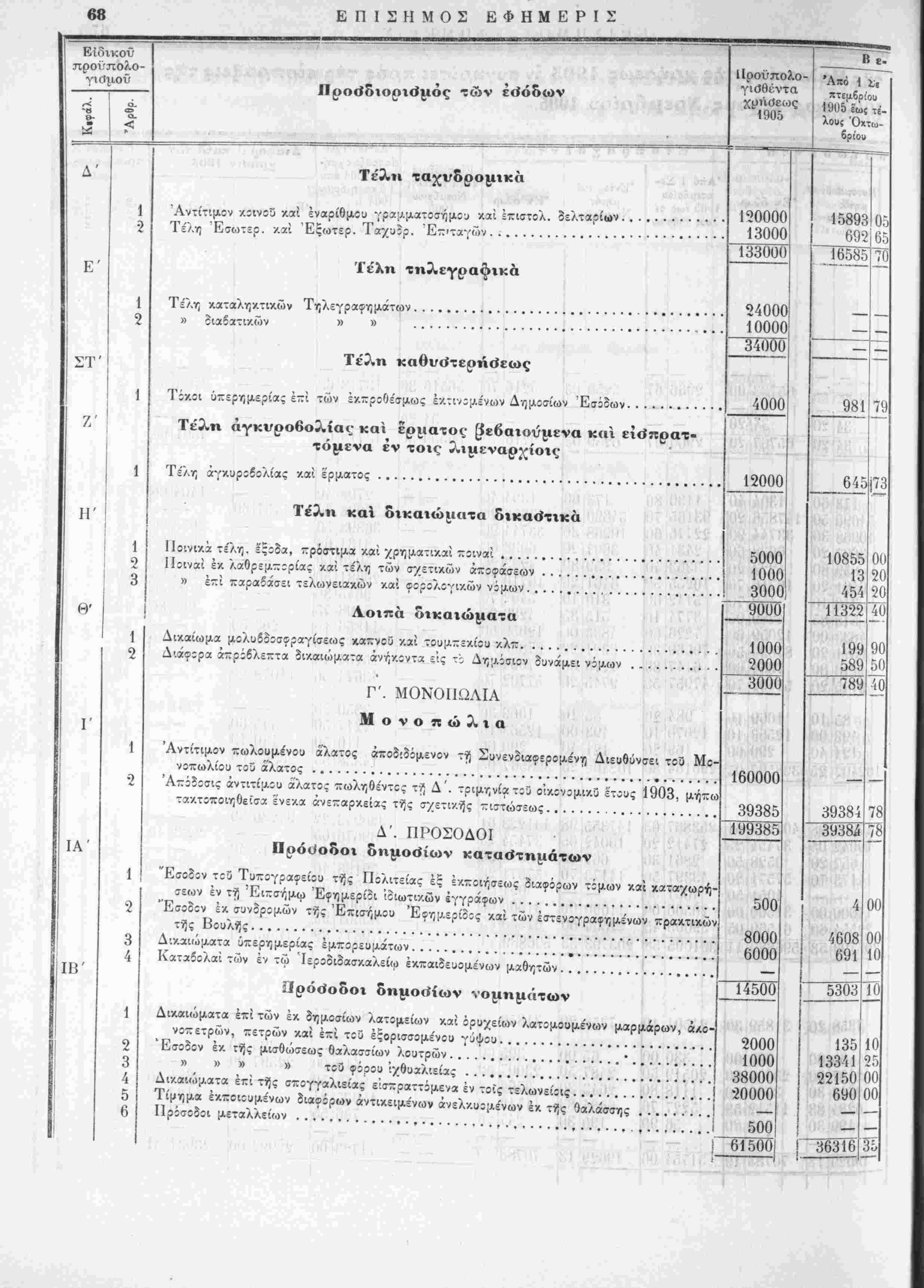 ίίΐοβωρινή κατάστασις των προϋπολογισθέντων, βεβαιωθέντων, «,ισποχ/ϋ.ντων χϊι είσπριςίμων έσοδων τής /οήσεως 1905,