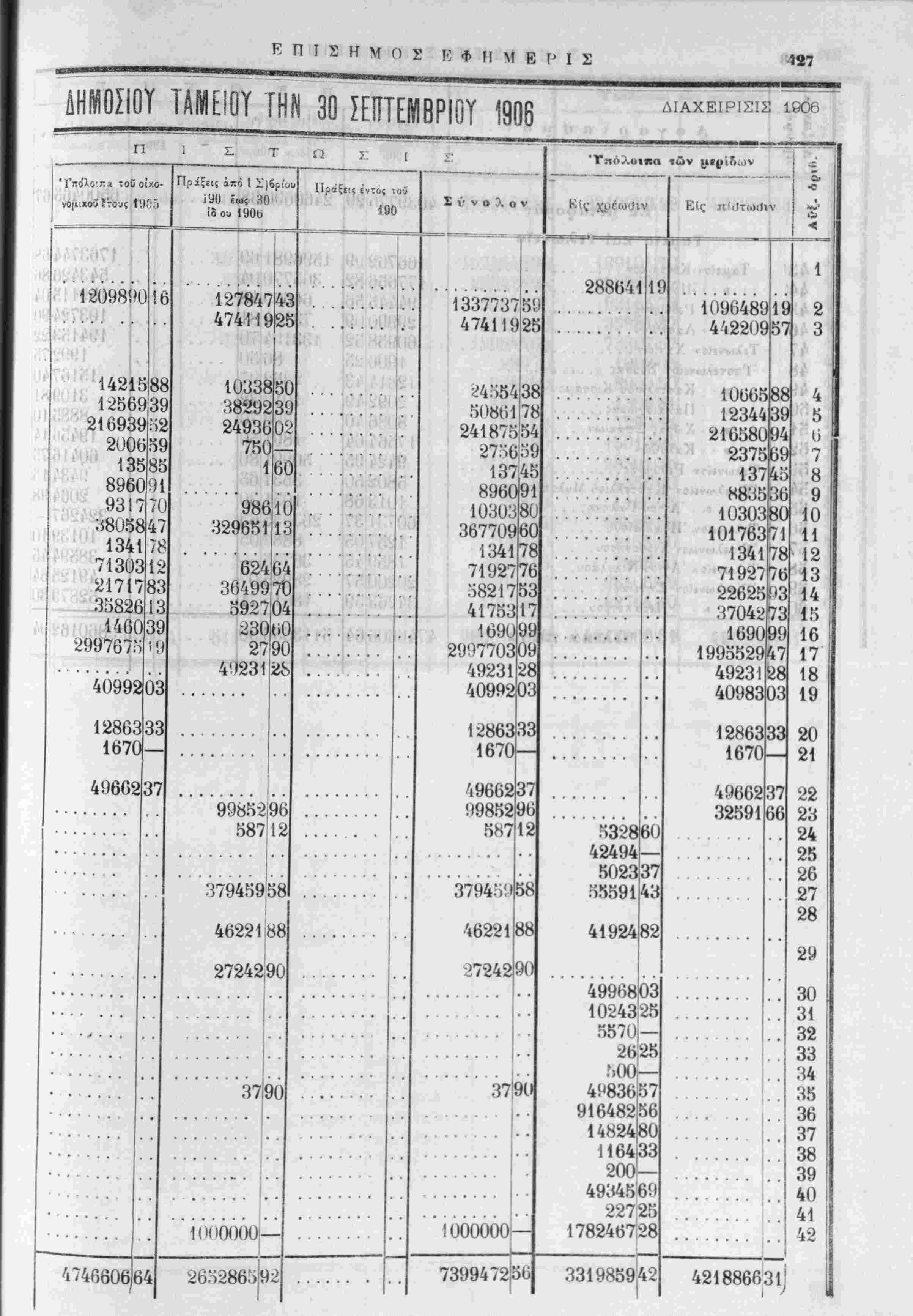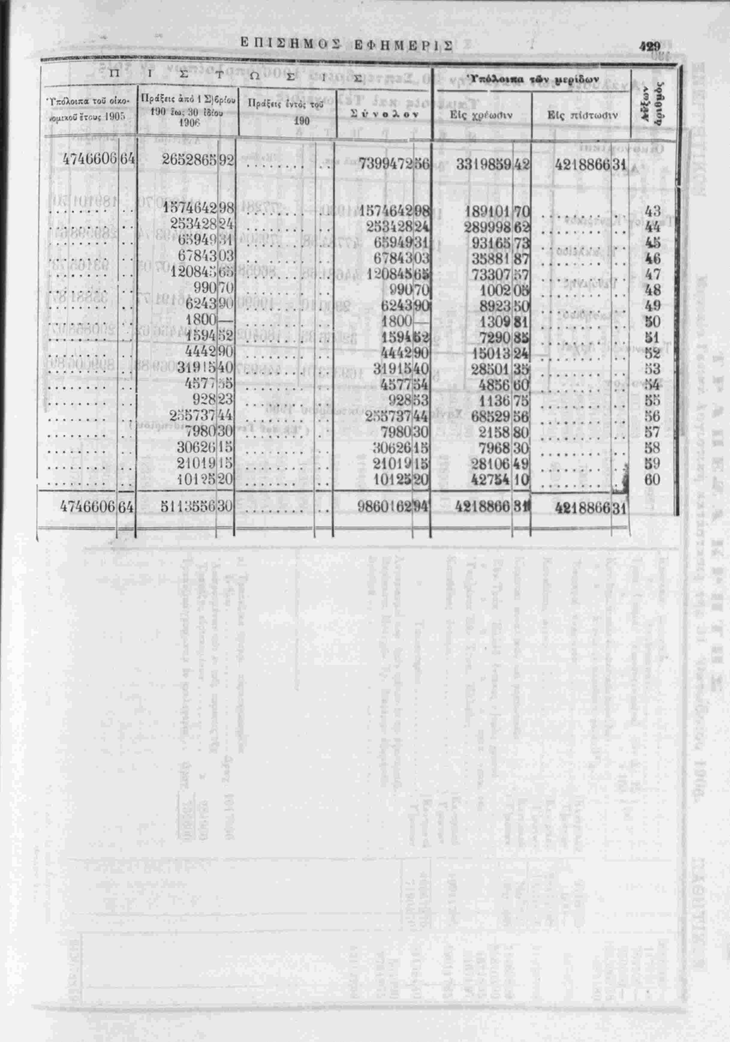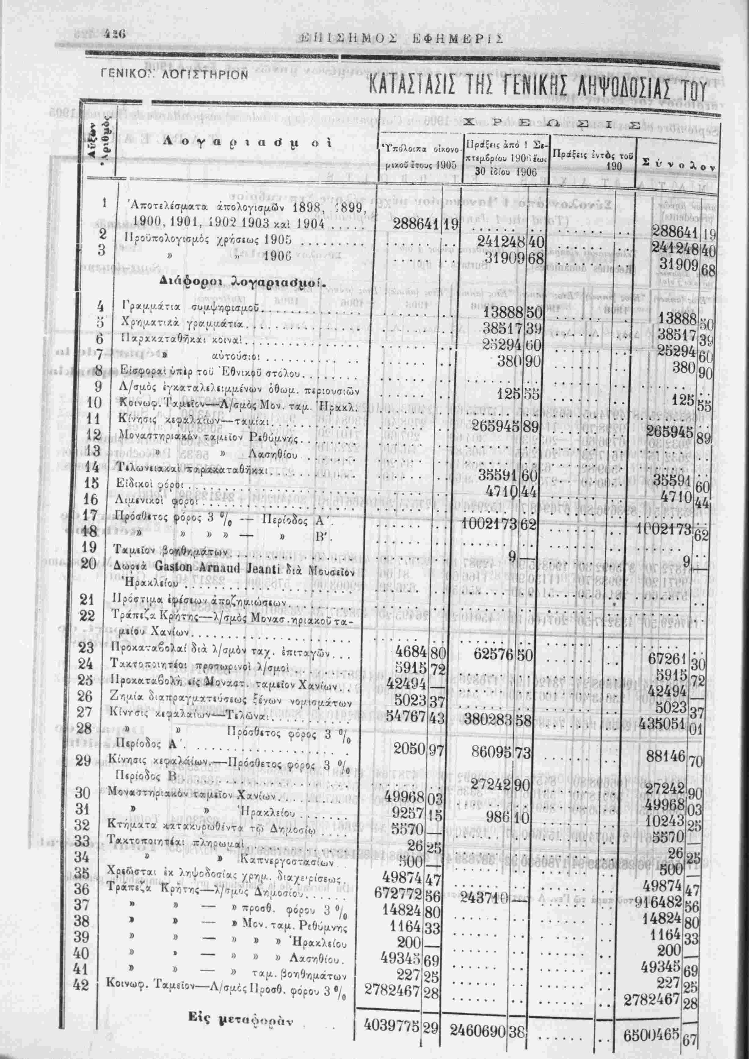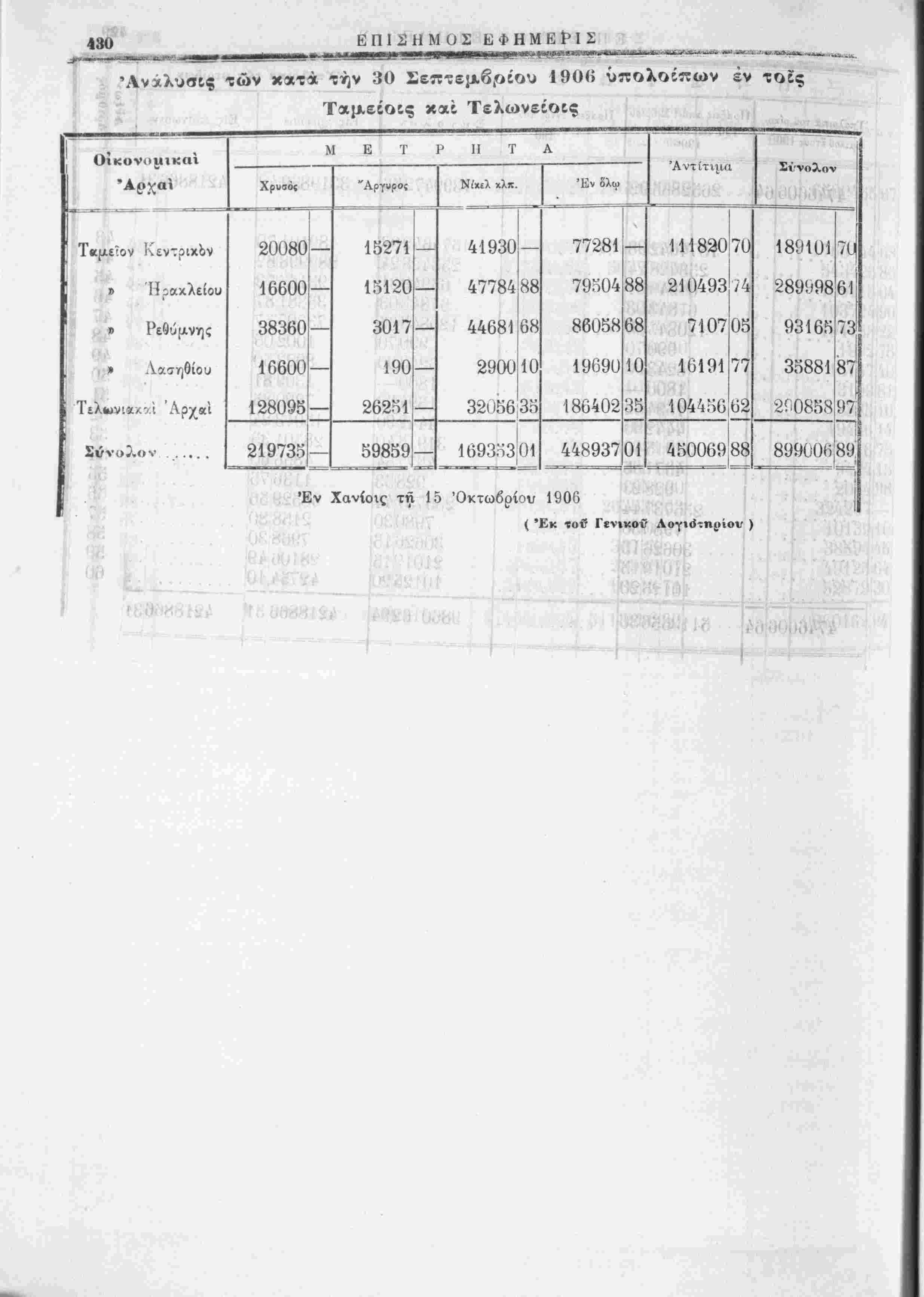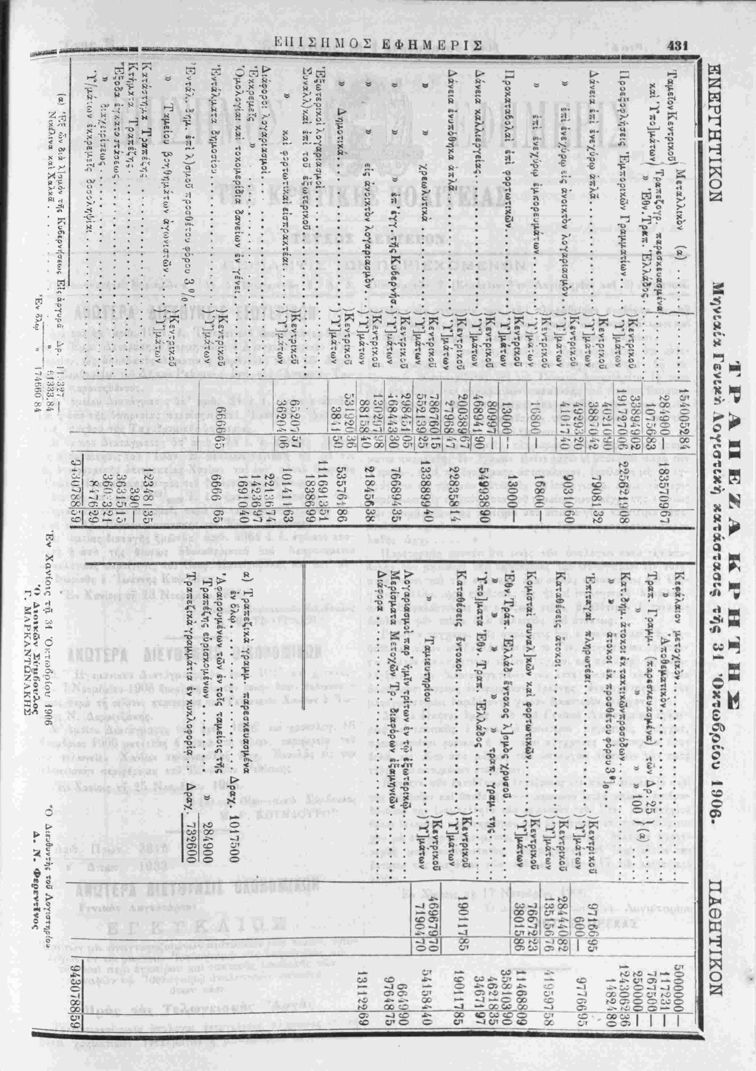 Έ*<ταγ» πληρωτεα!..................)ί$β,νΤ?ιχο8 ) 1]ματων 5000000 — 117-231 — 767500 — 25ΟΟΟΟ — 1·24:!06·»|36 1Ί82Ί8Ο! Καταθίσεις άτοκοι.....................)Κεντρικοϋ 97166195! 600 — 284440,82] 'Υ]μάτων 13515676! Ί1 Κομισταί συναλΐκών καΐ φορτωτικών........ Έθν.Τράχ. Έλλάδ. ίντοκος λ]σμος χρυβοΰ » » » » » τραχ. γραμ. της...... 'Υπο]ματα Έθν. Τραπ. Ελλάδος................. Καταθέση Ιντοκοι....................)Κ.ντρ1κο5 ) Υδάτων ·) , )ΚεντρικοΟ » Ταμίευτηριου................)Τ]μάτων Λογαριασμοί παρ' ήμΤν τρίτων έν τώ εξωτερικώ.......... Μερίσματα Μετοχών Τρ. διαφόρων έςαμηνιών......... Διάίορα...................................... α) Τραπεζικά γραμμ. χαρεσκευασμένα έν όλφ....................Δραχ. 1017500 Άφα'.ρουμένων των έν τοίς ταμείοις τής Τραπέζης ευρισκομένων.......... » 284900 Τραπεζικά γραμμάτια έν κυκλοφορία . . Δραγ. 732600 76672 3801586 190117 85 23 469679 'Ιίν Χανίοις τι^, 'Μ Όι-τ<.)βρίον 1906 Ό Λιηικών Σί'μίίοΐ'Γλος Γ. ΜΧΡΚΑΝΤΩΝΛΚΗΣ "Ο Δ!^^9ιιντ^)ί τοΰ Λογ·.στη,ο■'ο^ Λ. Λ. Φϊρεντϊνος Ι 11468809 35810390 46-218 34671 1901 Π 35 97 541584 66'·9 40 90 9764875 13112269 943078859