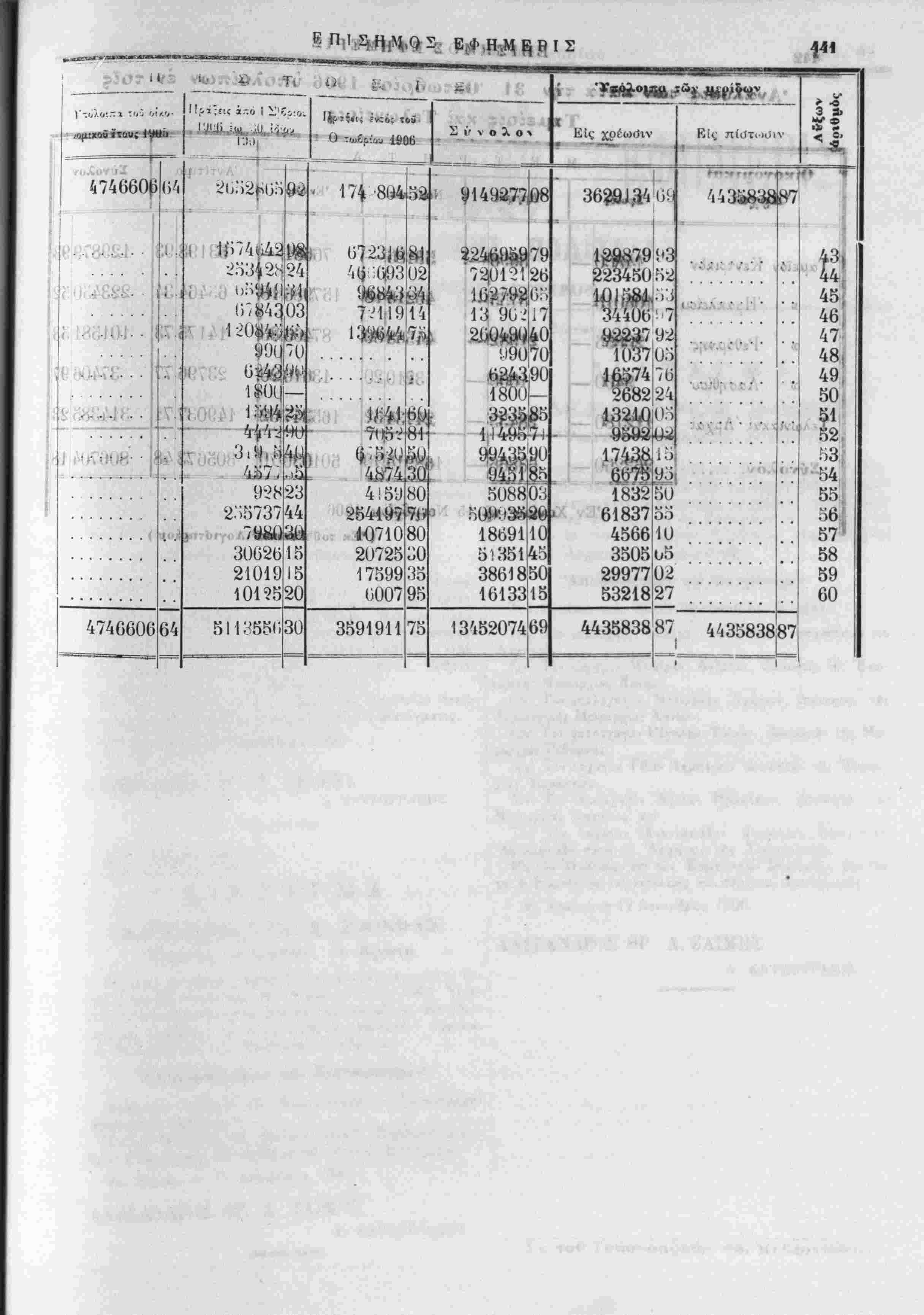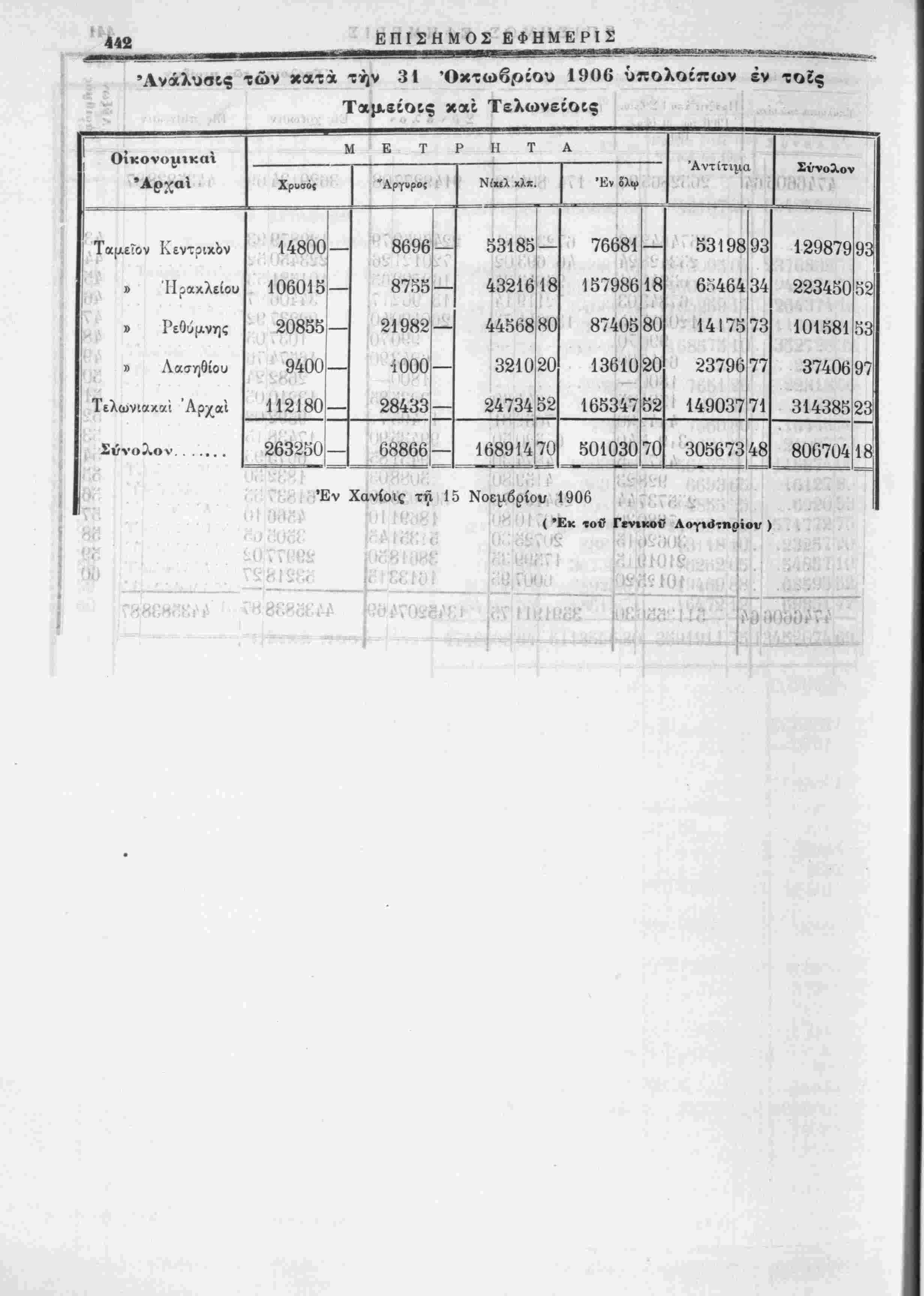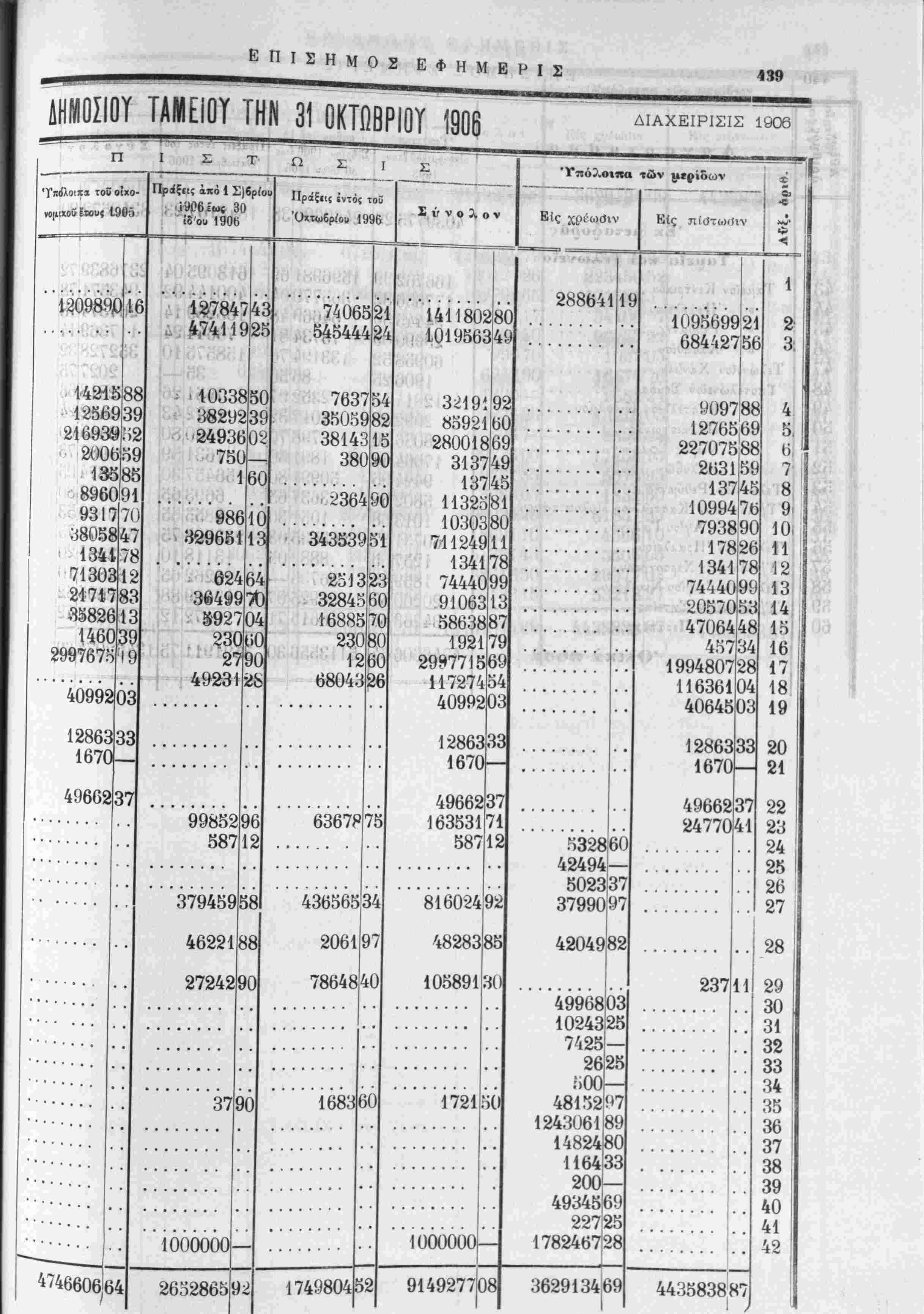 Ανάλυσις των κατα την 31 Όκτωβρίου 1906 ύπολοίπων έν τοίς