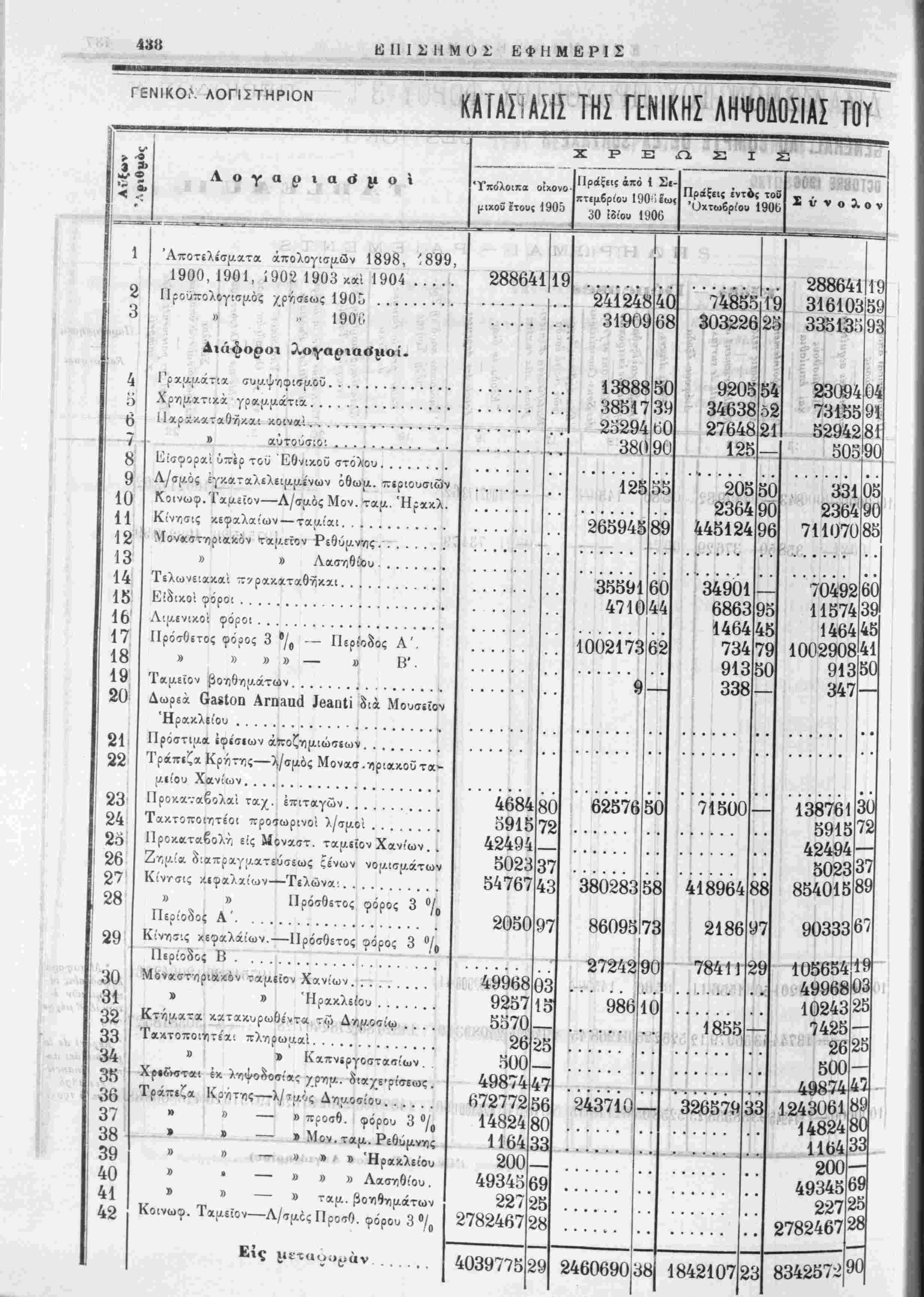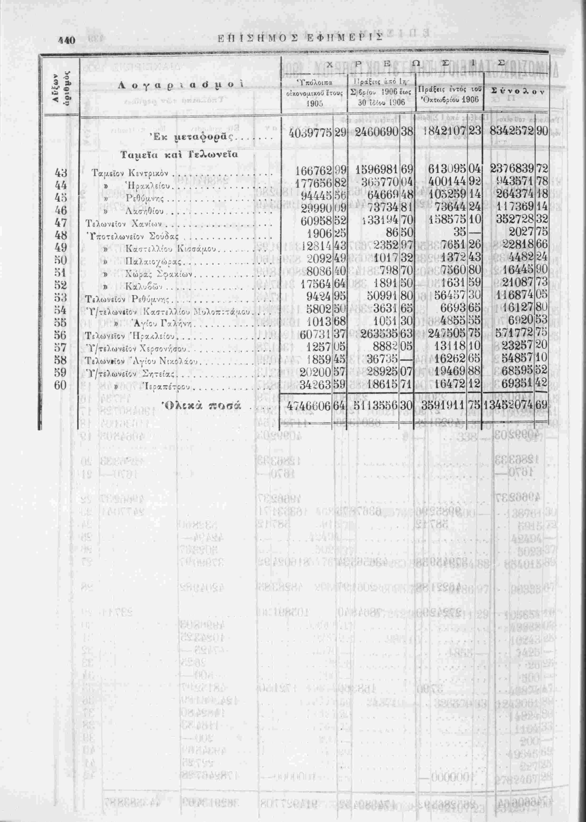 Ϊ;ν Χί;<ϊονν;σου Τελωνείον 'Λγ'Όυ Ν'.κί^χο·! ποσά .... "ΪΊΐόλοιπα οίχονοΐιιχοϋ ετου; 190.Ί Ρ Ε Ω ϊ'ράξίΐς λ πό Ι γ, 2)βριο. 1906έως 30 Ίί'ου ΓΙ06 -/(ΪΙ7Λ4,.! Πράξίΐε ε'ντόζ ιοϋ '()ζτ(ο6,:,:ου1906 10^9775 166762 177656 94445 29990 60958 1906 12-·η4 2092 8036 17564|64 94-^4 5802 1013 60731 1257 : 859145: 99, 82 56 52 43 49 40 951 50 68 37 2ί;200 34-263 4746ϋ06|64 57 59 2460690138 1596981 36Ο77004 64669 48 73734 8 69 33194 70 8650 2352 9 101732 798 70 1891 50991 3631 1051 263535 888-2 36735 28925|07| 18615 5113556 50 80 65 30 63 05; 71 30 1842107 61309504 400144 9 105259 73644 158575 35 7651 23 £ ν ν ο λ ο - 8342572190 14 24 10 26 4; 1372 7560180 1631 56457 669365 4855 247505175! 13118 16262 19469881 16472 3591911 591 31 55 101 65 12 75 2376839 943571 264374 117369 35272832 2027 2281866 4482 16445 21087 73 1ί6874 16127 72 78 18 14 75 24 90 35 80 6920|53 571772 2325720 5485710 6859552 69351 13452074 42 69 !:*;·;<·*;"♦ »♦'