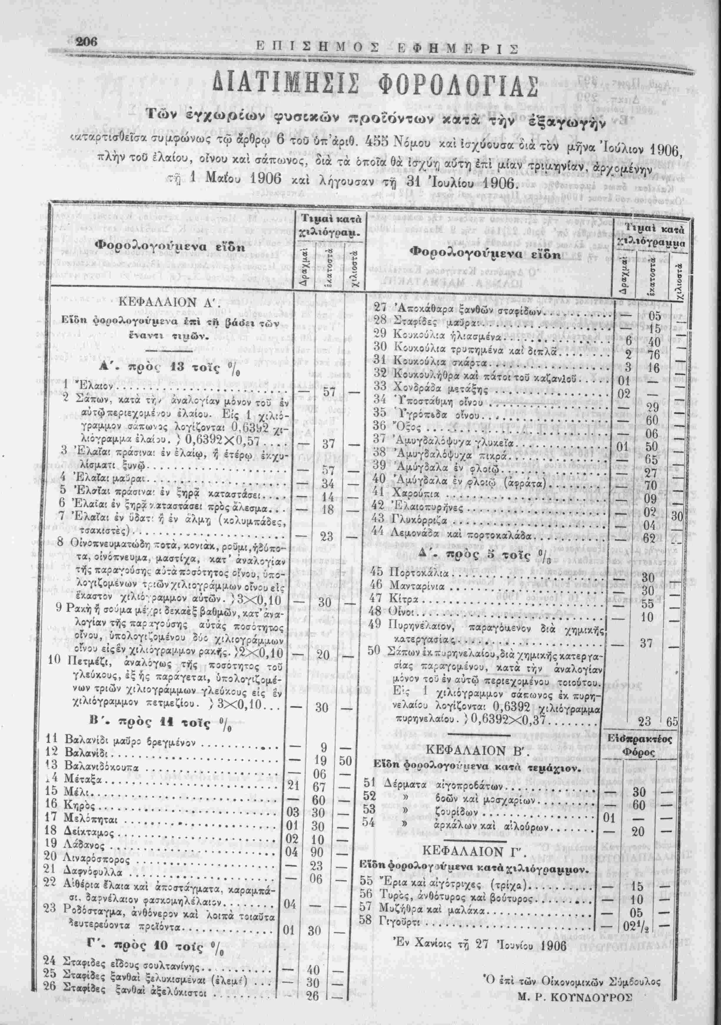 '.αταρτισθεϊσα συμφώνως τώ άρθρω 6 τοθ ύπ'άριθ. 455 Νομου καΐ ίσχύβυσα οιά τόν μήνα Ιούλιον 1906,