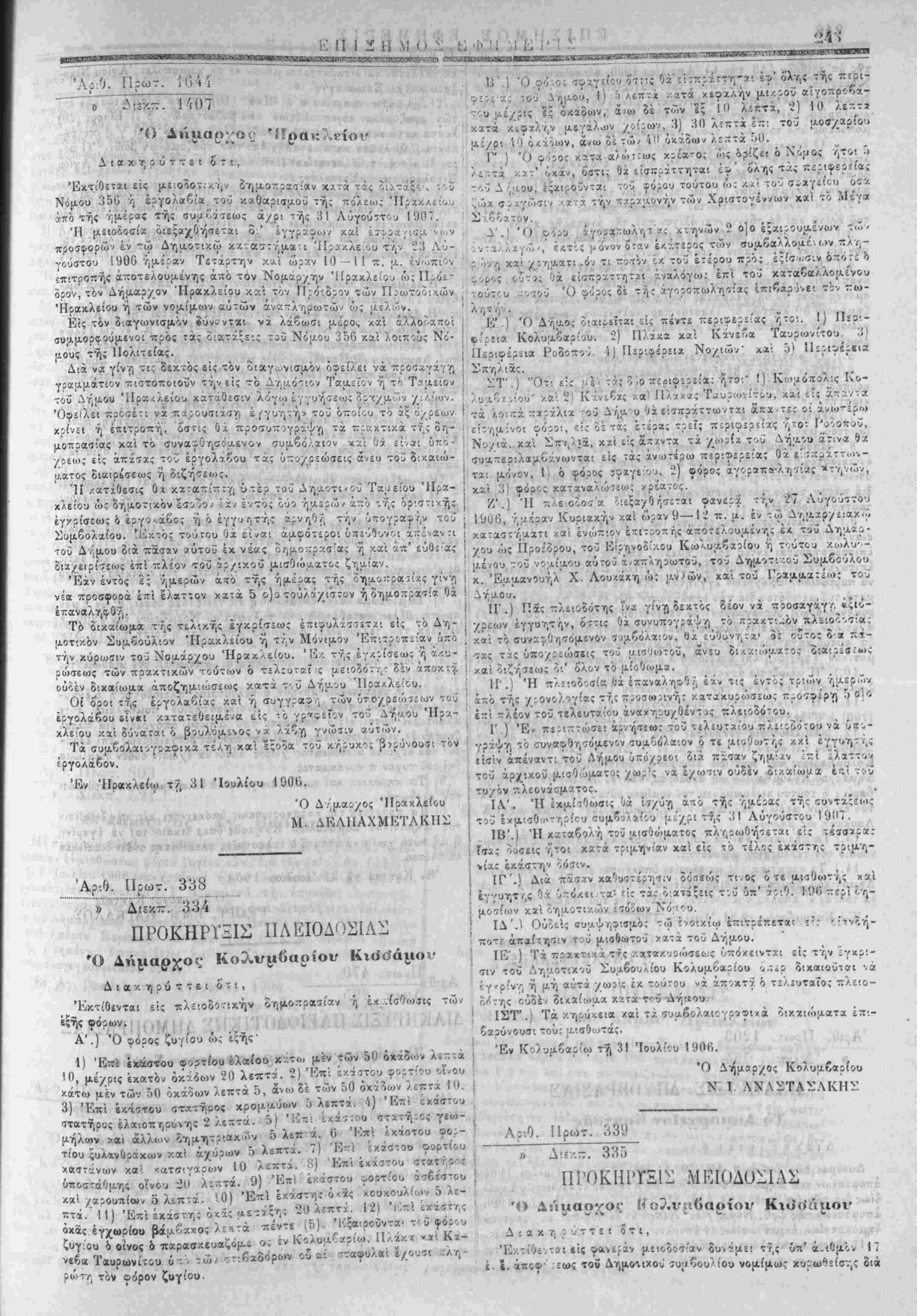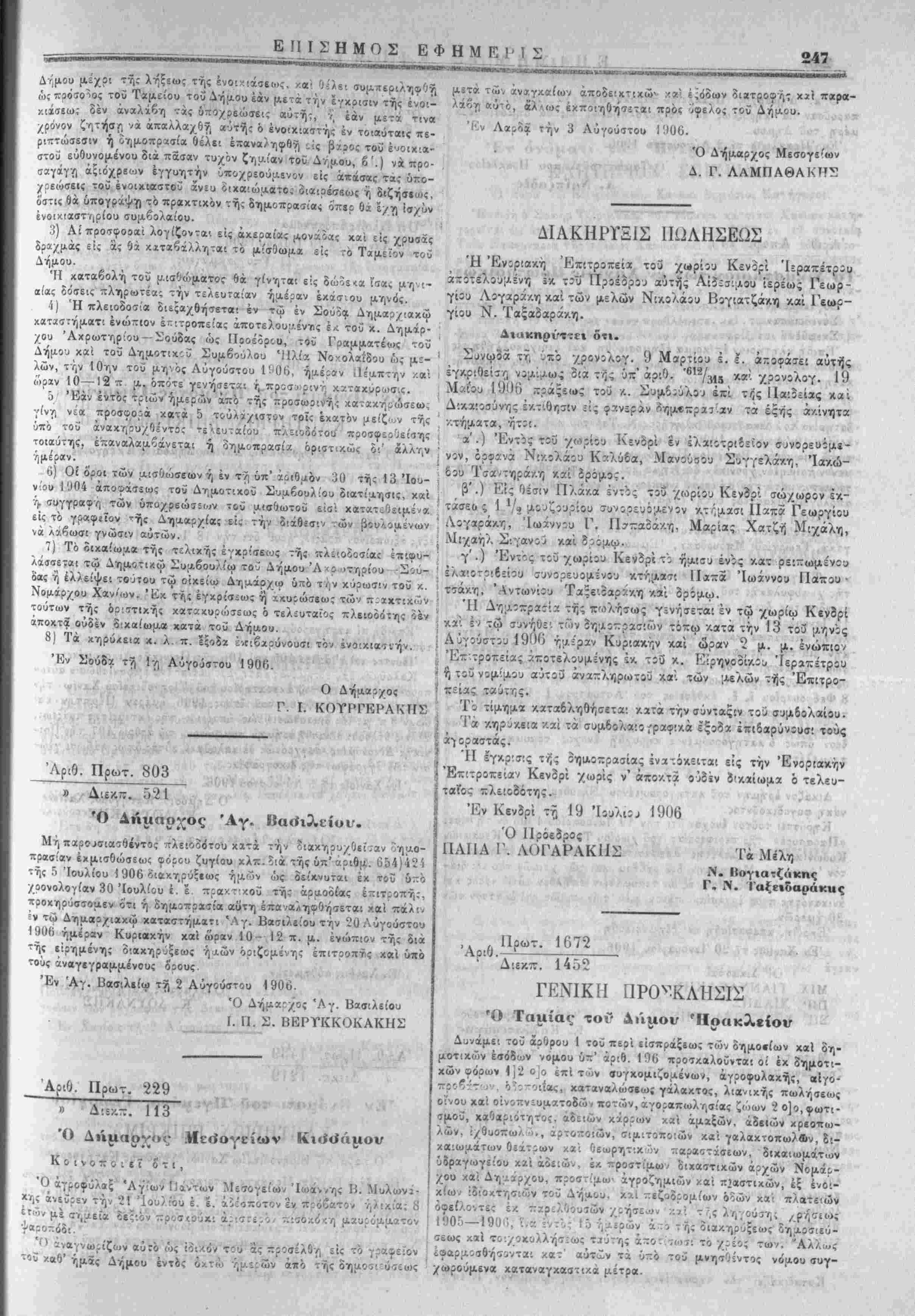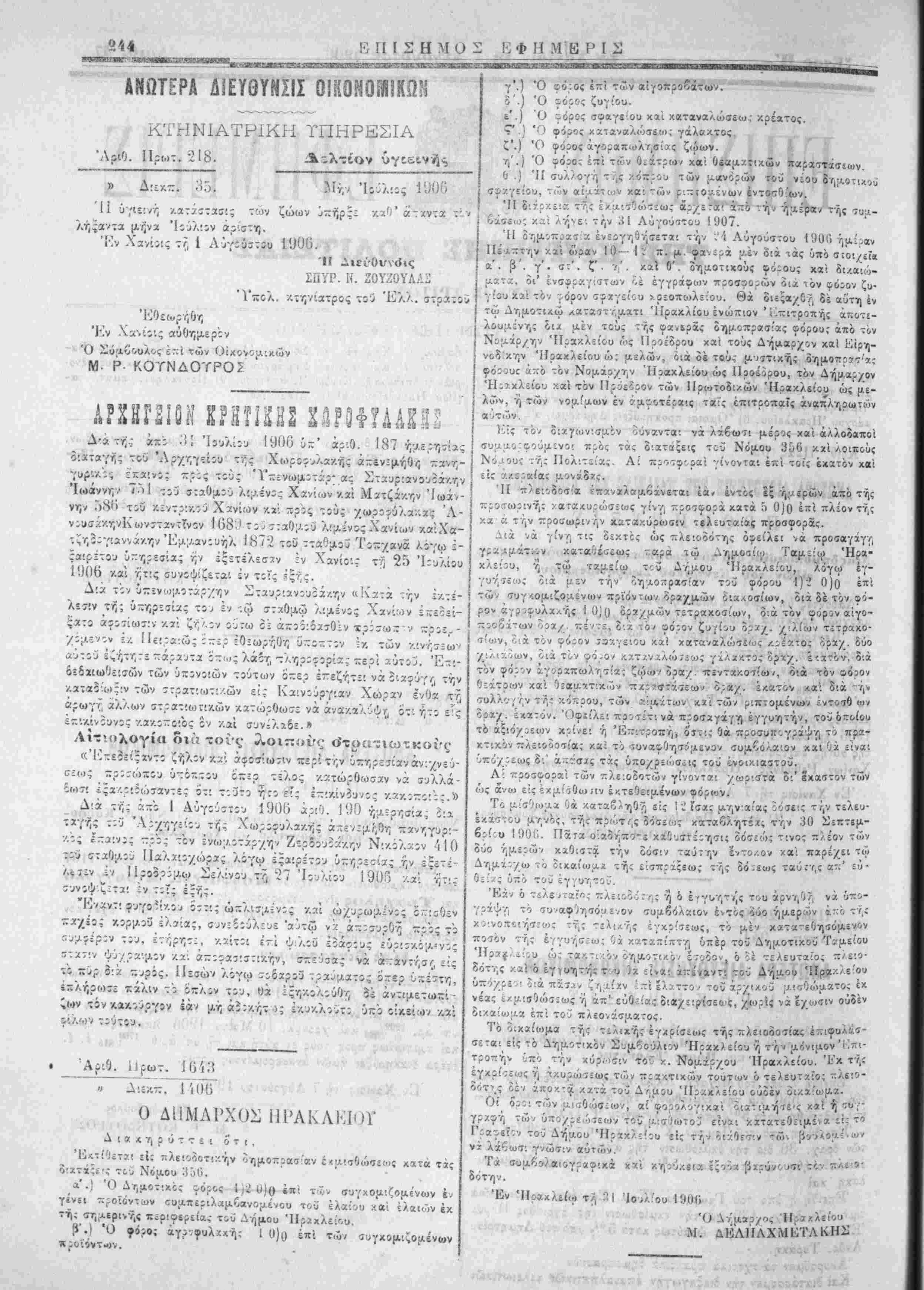 λήςαντα μ<;να "Ιούλιον αρ.ο-τη. Έν Χανίϋς ~1 1 Α·ύγ:ύστ5υ 190(0. ΊΙ Λιεί'ΟννοΊς ΣΠΥΡ. Ιί. ΖΟΥΖΟΥΛΑ^ Ί'πολ. /.τηνιατρβς τ;ύ Έλλ. ^τρατίύ Έν Χίΐν.οις αυθημερόν Ό —ύ'Αυθυλο; έ::ί των Οίκον* ιδικών Μ- Ρ ΚΟΎΝΔΟΥΡΟΣ Α 1 αι ιηηηΐΜ Μΐινα^Μί γ'.) Ό ϊό;.ος επί τ<Ιν αίγοττρ 8'.) Ό £Ορος ζυγίου. ε'.) Ο γόρος σϊ/ΐιγε-.ου καί χαταναλώσεω; κρέατος. ™ ) '·' · ©όρος χαταναλώσει,ι: γάλακτος ___ ί'.) Ό (ρόρος άγ'ιραπωλησί^-ς ζώων. η'.) Ό οόρο; επί των θεάτρω/ χαί Οεαμζ-ϋιώ'ν παραιτάσίων. 0 .) ΊΙ αυλ/ογή τ.',ς κόπρου των μιχνόρών τοϋ νέου β'ηιΐ,θτΐΛβυ σΐχγείου, "ών αί;^άτ(υν καί των ριπΐοιιενων έντο<7θ'ων. ΊΙ δ:ίρχ.£!« τή; εκμισθώσεως άρχεται ί~Ό τή,, ημέραν τής 7υ·λ- Οίσε.ιΚ χα'ι λήϊε; την 31 Αύγούστου 1907. 'ΙΙ οημοπ.ιαΐ-α ενεργηθήσεται την ;'4 Αΰγούιτου 1900 Γ,α^αν Πέαπτην κα'ι ί>ραν 10— Ι ΐ π. μ.'φανερά μέν διά τάς υπό σΐοΐχεϊϊ