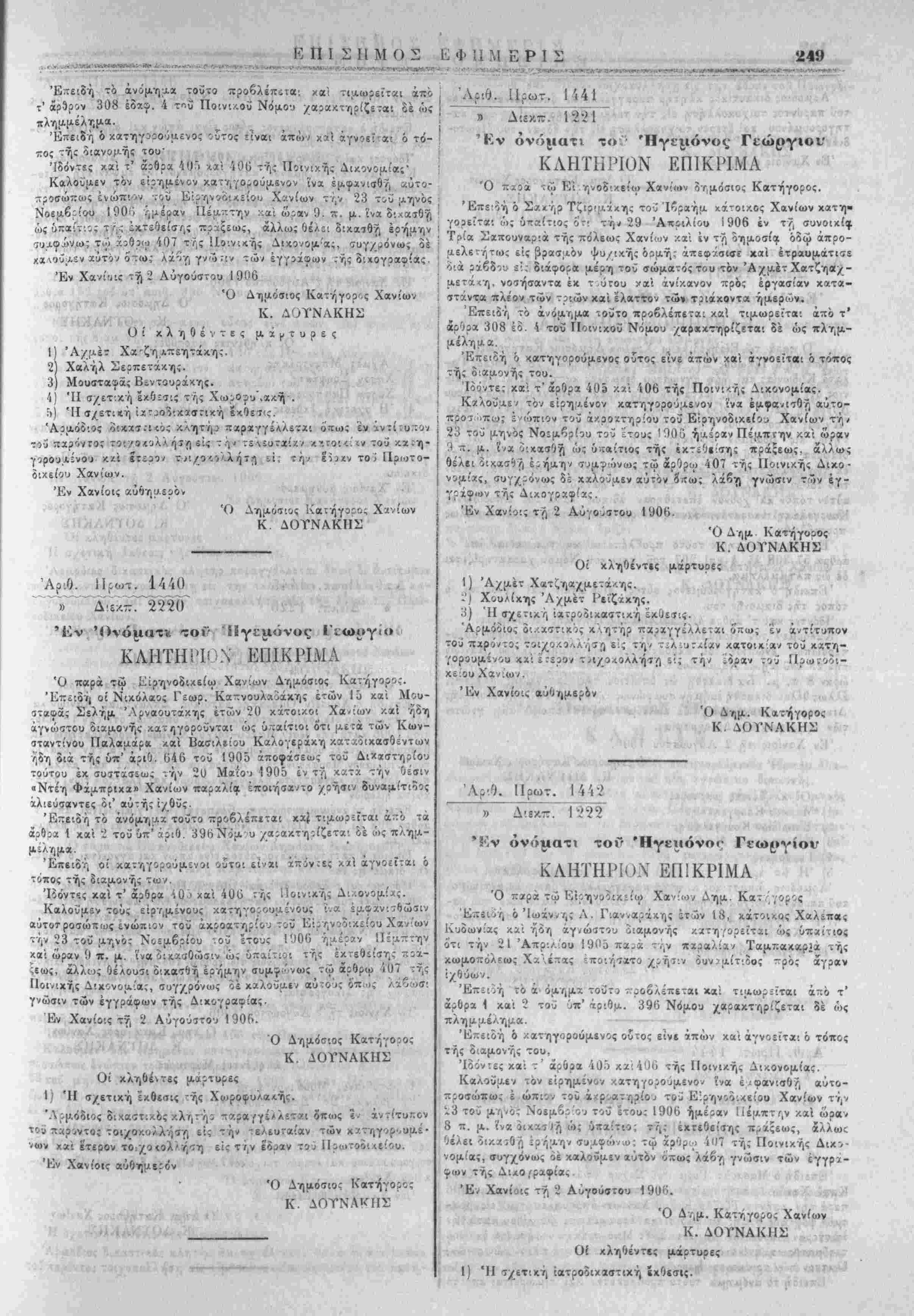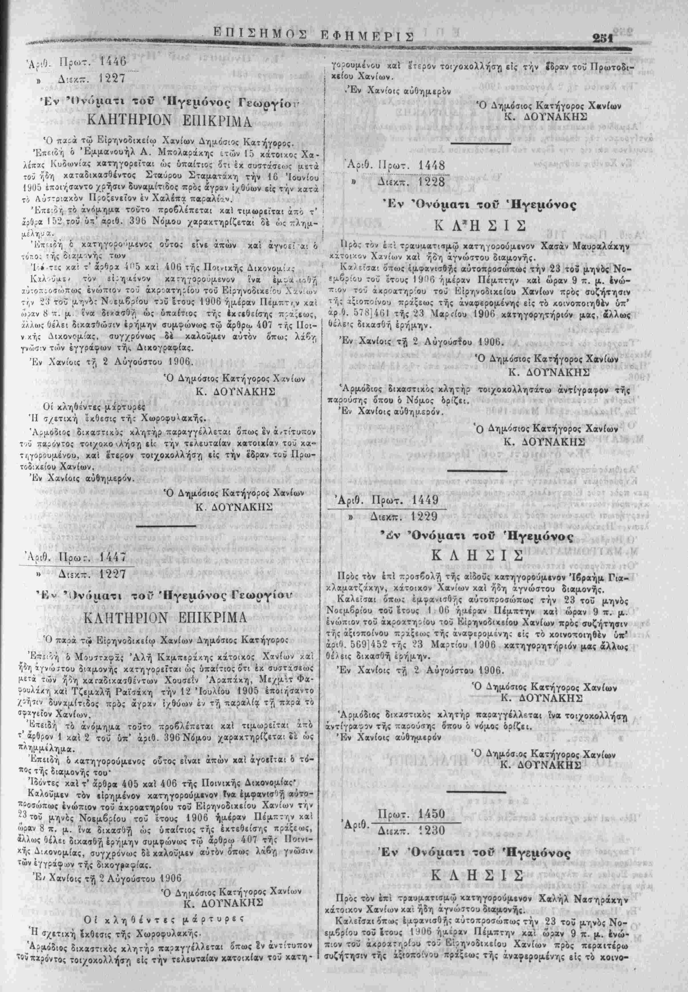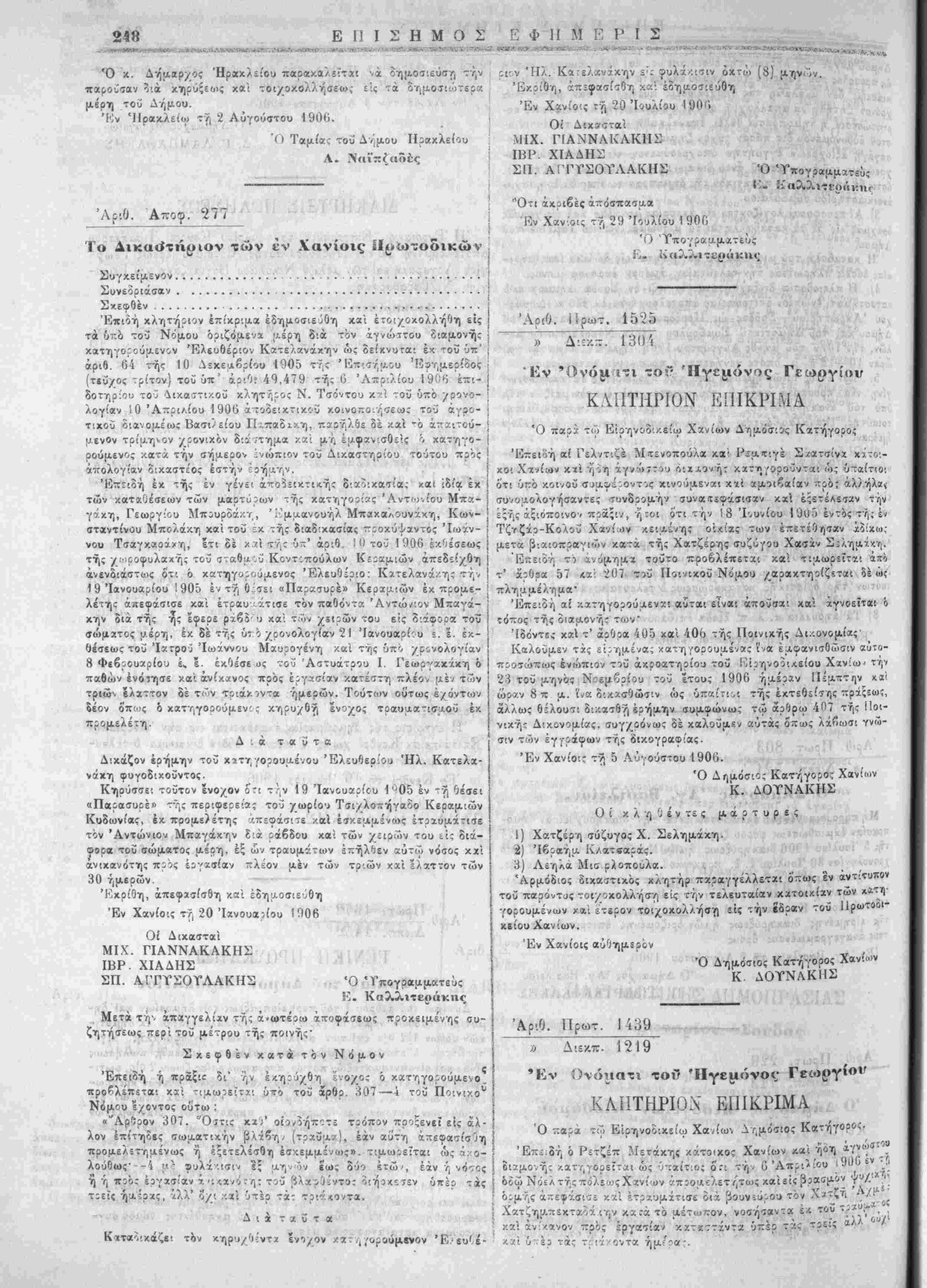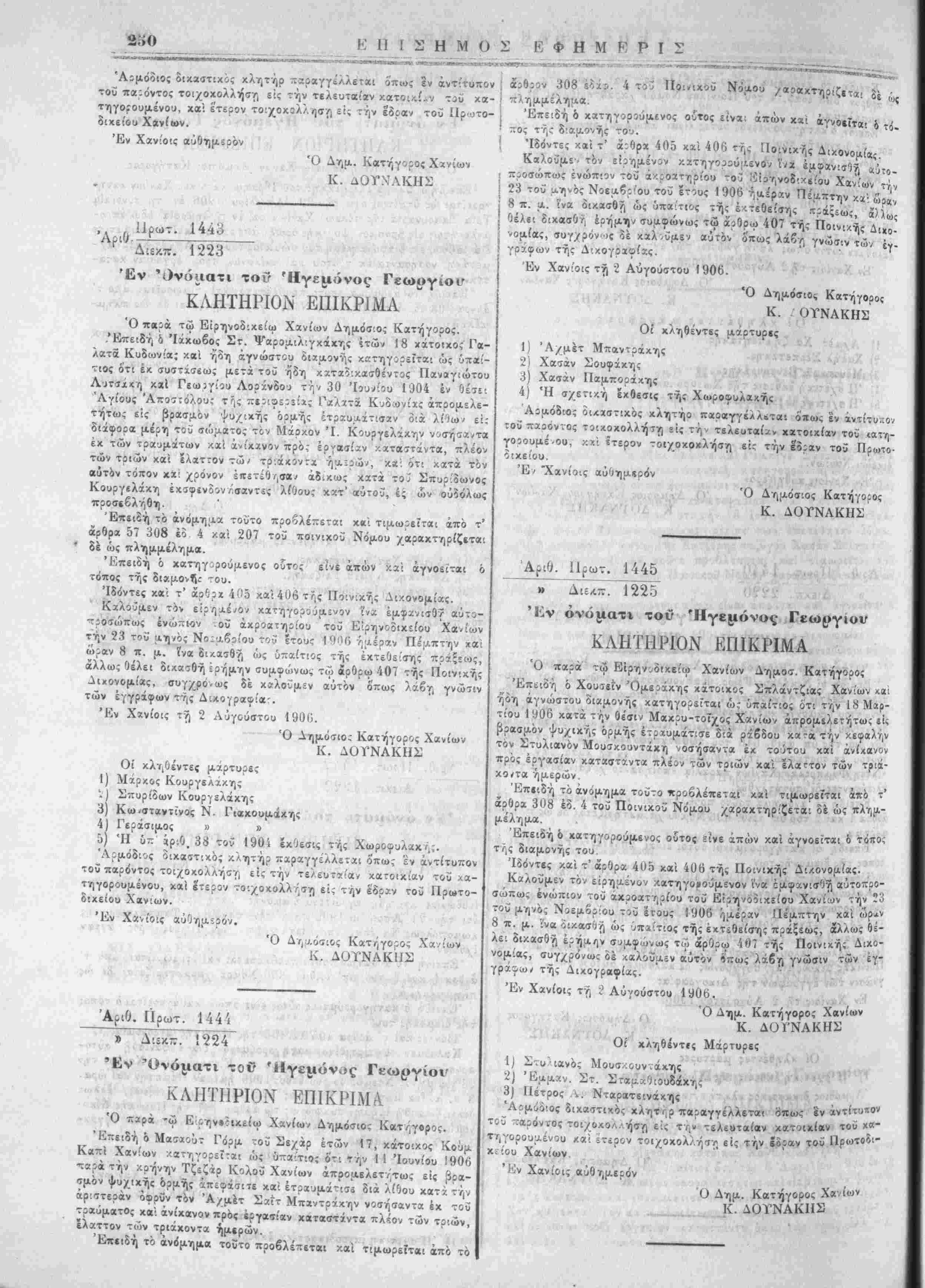 | ^ζ' ά:. 120ϊ/5ϊο "ΛΟ1<1 7.ΡονΐΑ. 10 Μαέου 190ΰ ϊιακηρΰςει ημών * καί ^μ?ωνως πρΐς τους Ιν αύτ^ καί τή ,ι-' «ρΌ. ι·./^Ά έ. Ι. ετέρα διαν.ηρύςει ημών άναφερομς'νους ςρ-υς. Έν Χανίοις τί, 7 Αύγούττυ 19'Ό. · -Ι ΑΊ Π .{ Μ. Ρ. ΚΟΥΝΔΟΥΡΟΣ