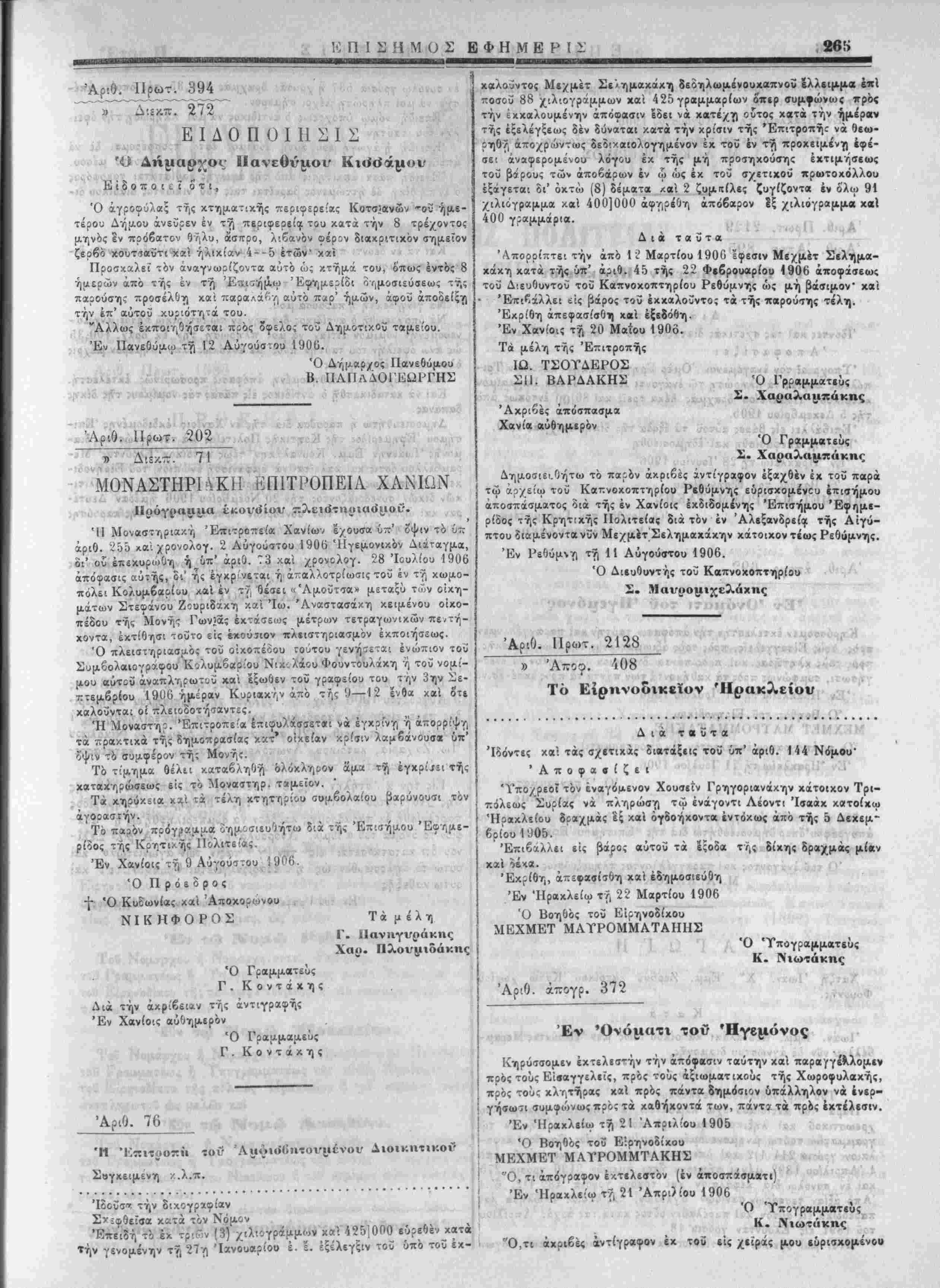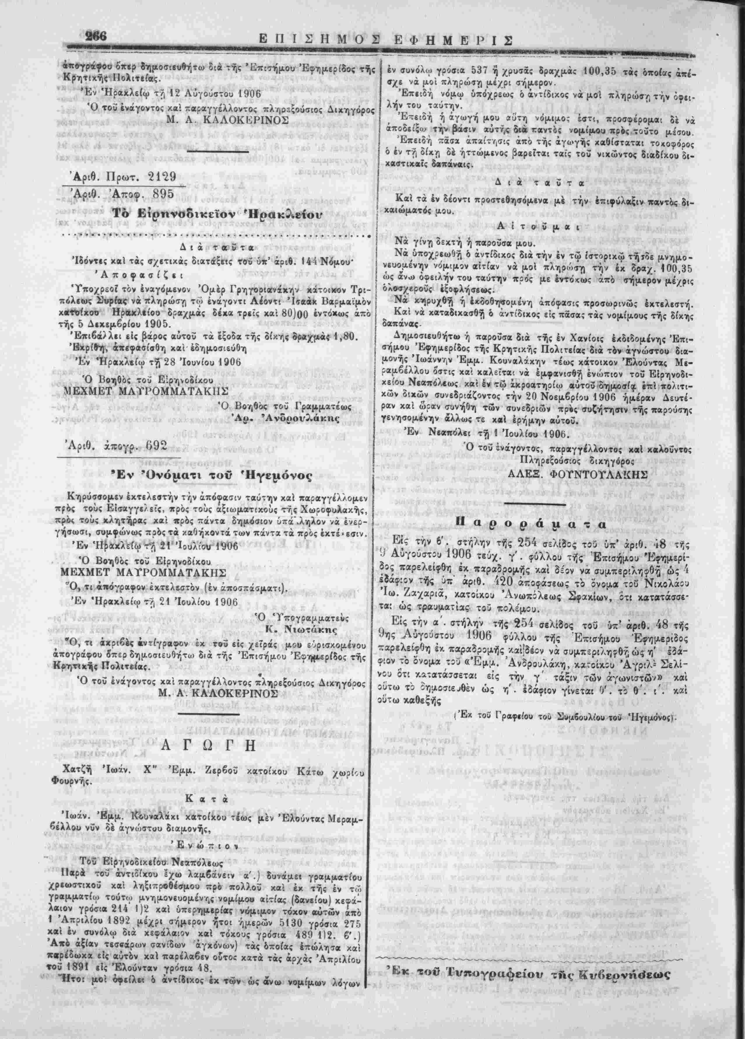 Ό Βοηθός τοΰ Ε'.ρϊΐνοδί-<ου ΜΕΧΜΕΤ ΜΛΥΡΟΜΜΑΤΑΚΠΣ Ό Βο/)θος τοΰ Γραμμζτέως Αριθ. ά-ογΡ. 692 Έν "Ονόματι τον Ήγεμόνος Κηρΰσσομεν έχτελββτήν την απόφασιν ταύτην χαί παραγγέλλομεν πρός τοϋς ΕΊσαγγε/£Ϊς, πρός τούς αξιωματΐχοΰς τής Χωροφυλακής, πρός τούς κληττίραί χαϊ πρός πάντα δημόσιον ύπά .ληλον να έ/ερ- γήσωσι, συμφώνως ποός τα χαθήχοντά των πάντα τα πρός έχτέ·εσιν. Έν Ηρακλείω τ"/) 2' Ίοολ·ο« 1906 Ό Βοηθός τοϋ Βίρηνοδίχου ΜΕΧΜΕΤ ΜΑΤΡΟΜΜΑΤΑΚΗΣ Ό, τι «πόγραφον έκτελεστόν (έν αποσϋάσματι). Έν Ηρακλείω τ>, 21 Ιουλίου 1906