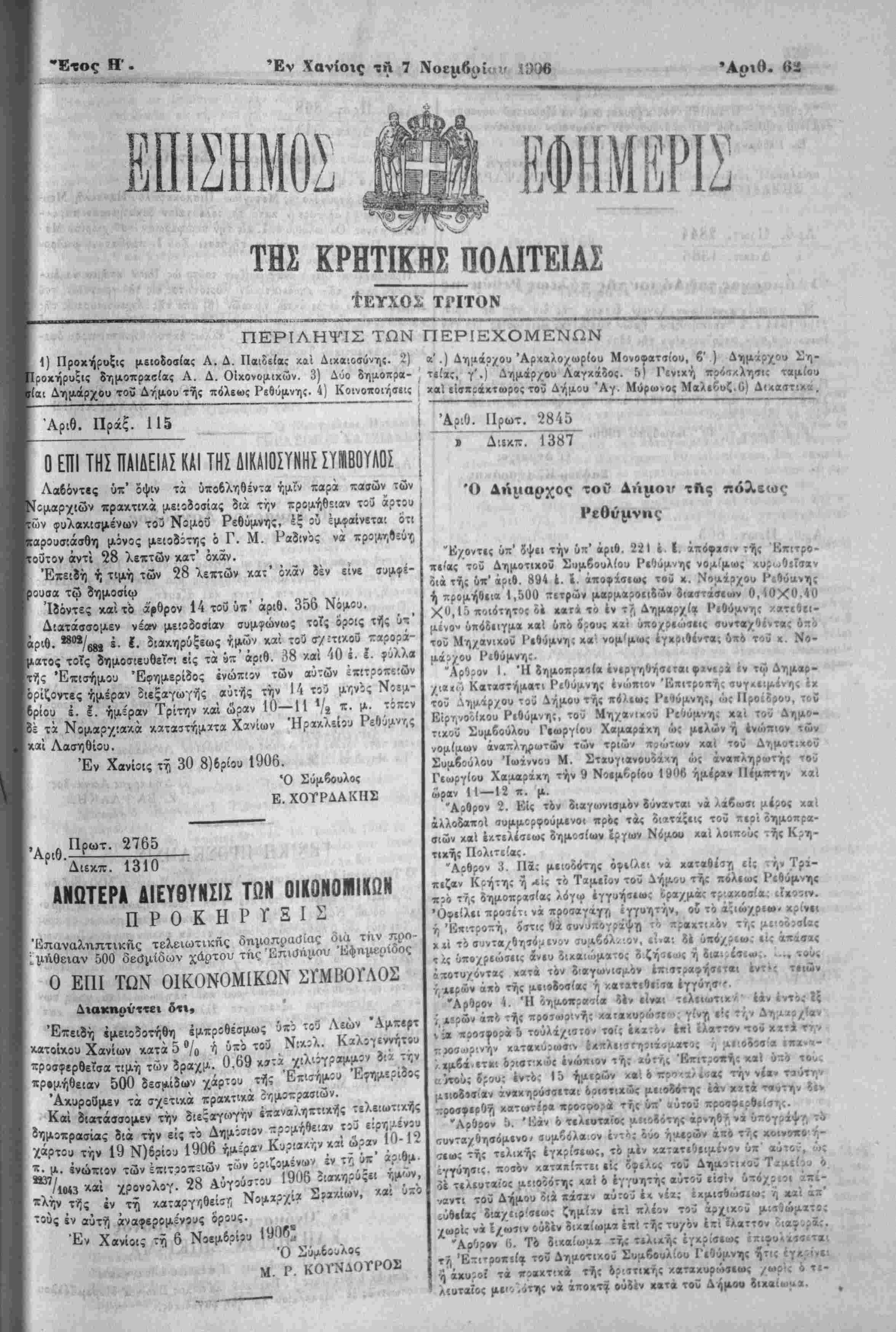 Είρτ,νοόίκου Ριθύμνη;, τοϋ ΜηχαΊχοϋ Ριθόμνη; χΐί τού Δημο-