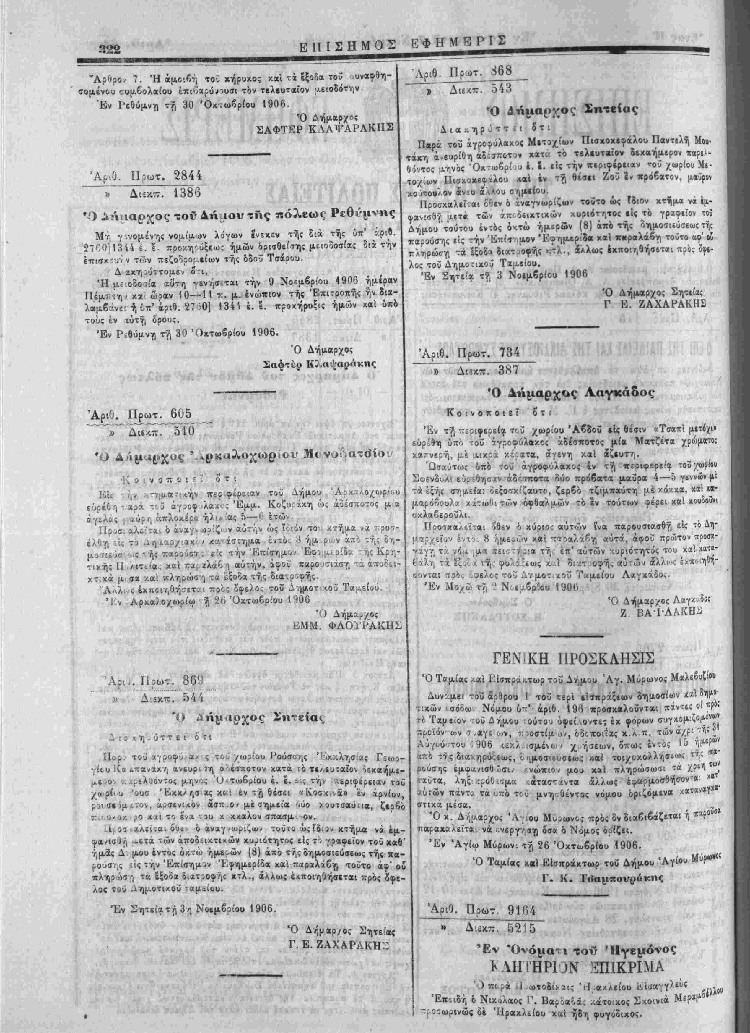 πληρ'όσι τα εξοοα δνχτιοφηε κτλ., άλλως ί*ποιη6ή<κται πρός 8<ρε- Αθς τού ΛΤΓ)ρ.οτικοϋ ταμείου. Έν Σητείατή3·ι Νοεμβρίου 1906. (Ο Δήμαρ/ος Σητείας Γ Ε. ΖΑΧΑΡΑΚΗ^ ♦Ο ΑΛμα^χος Σητείας . Δια., ηρόττίΐίτι · Παρά τοΰ άγροφύλαχος Μετιχίων Πιακοχεφαλου Παντιλή Μο»· τάκη ά.ευρίδη άδ-:βποτ« κατ« τό τίλευτβΐον δεχαήμιρον παρι'- θίντος ΆΤινός Όχτωβρί,υ έ. ί. ιίς την πιριφ*ρ*ιαν τοϋ χωρίου Μϊ· το/ιων Πισχοκβφϊλου χαί .ν τη «έσ»ι Ζοϋ 1» *ρό6ατον, μαύρον Λουλον άν^υ άλου σ/)(»ϊίου. Προσχαλεΐται όθεν ό χναγνωοίζων τουτο ώς ίδιον χτήμ« νΐ έ|ΐ- φβνισθγ, μίτ« των άποΒειχτιχών χυριίτ^τος είς τό γραφΐϊον τού Δήμου'τούτου ίντός οχτώ ήμεοών (8) άπό τής δτ,μοσΐίύϊεως τής ΐίούσης ιίς την Επίσημον Έοημιρι'δα καΐ παραλάβϊ) τουτο αφ' οί ,τρώΓγι -λ Ιξοδίΐ διατοοοής >ςτλ., άλλως έκποιηθήσιτβι πρός δβι-