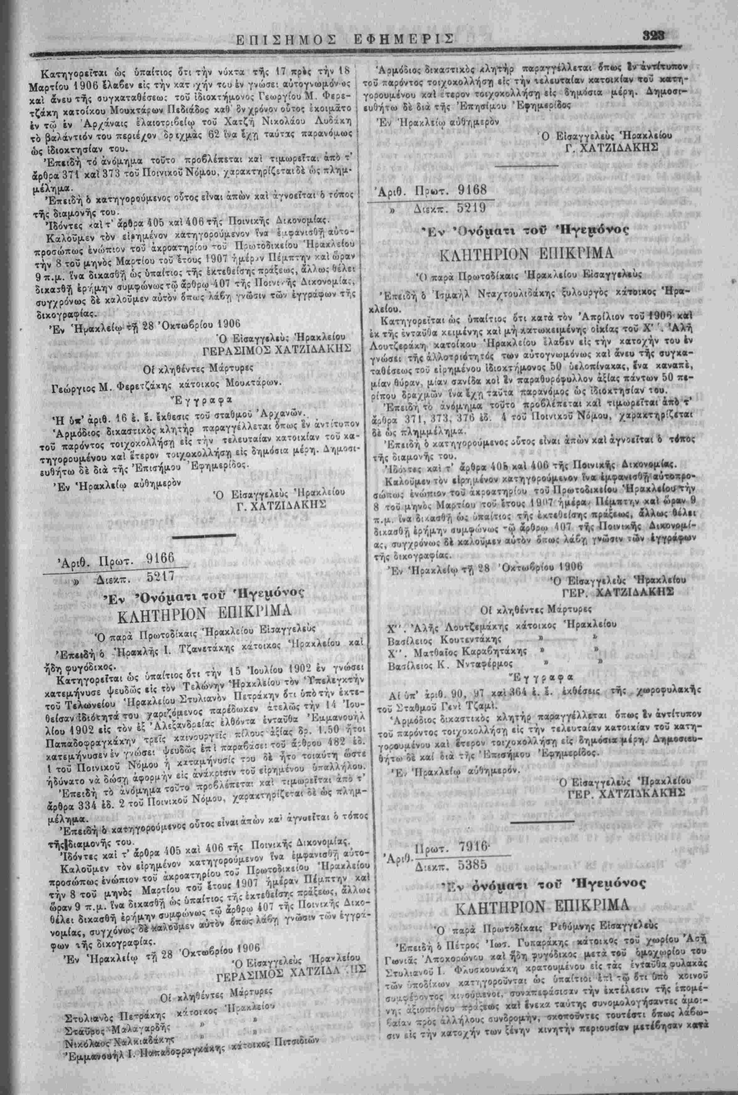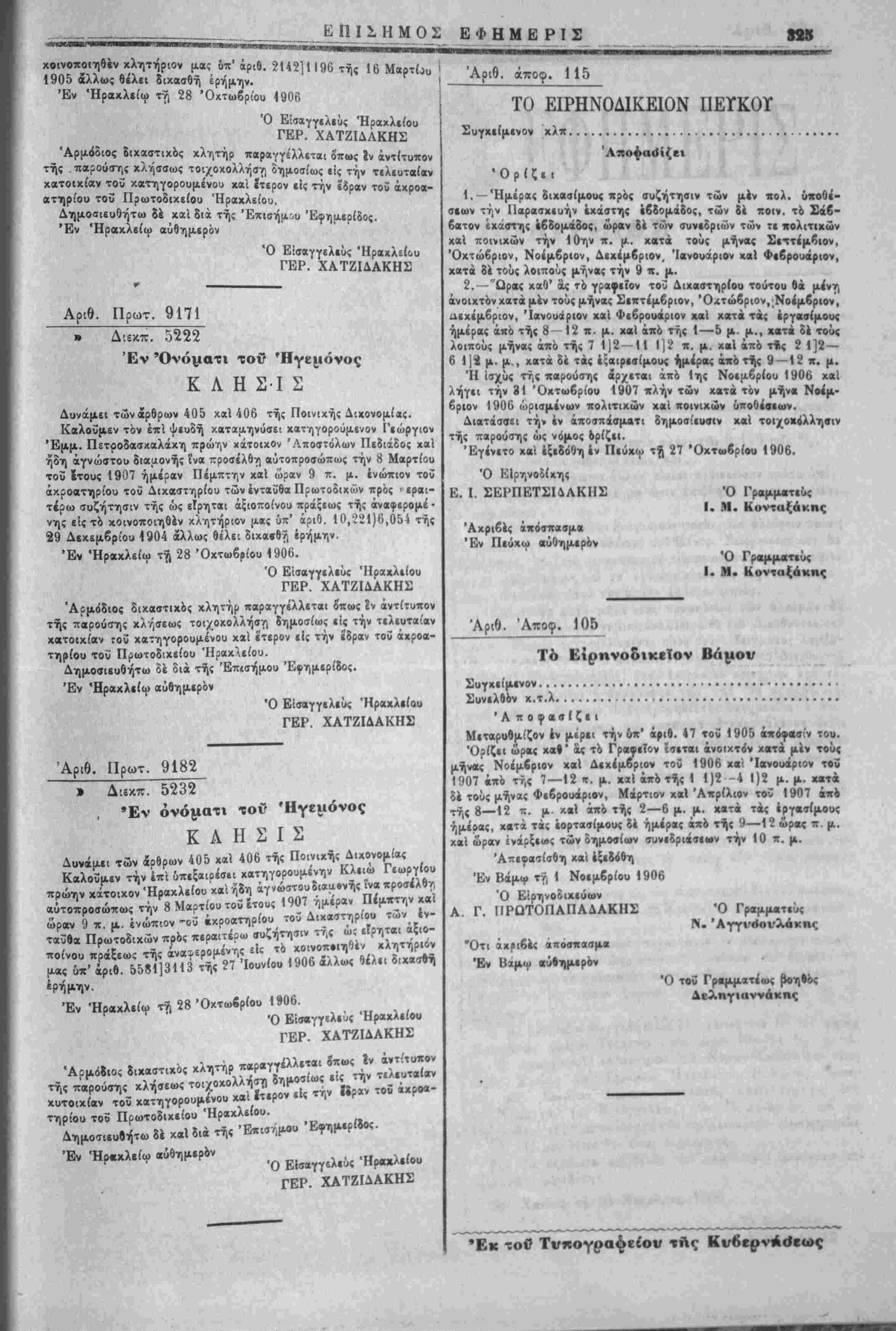 μας δπ' αριθ. 5581]3113 τής 27 Ίουνί,υ 1906 άλλως «<λε· δικασθή έρήμην. Έν Ηρακλείω τγί 28 Όχτωβρίου 1906. Ό Εισαγγελεύς Ηρακλείου ΓΕΡ. ΧΑΤΖΙΔΑΚΗΣ δικαστάς κλητήρ παρ.γγέλλεται ^ τής Μούσης κλήσεω. τοιχοκολλήση **£*>' £