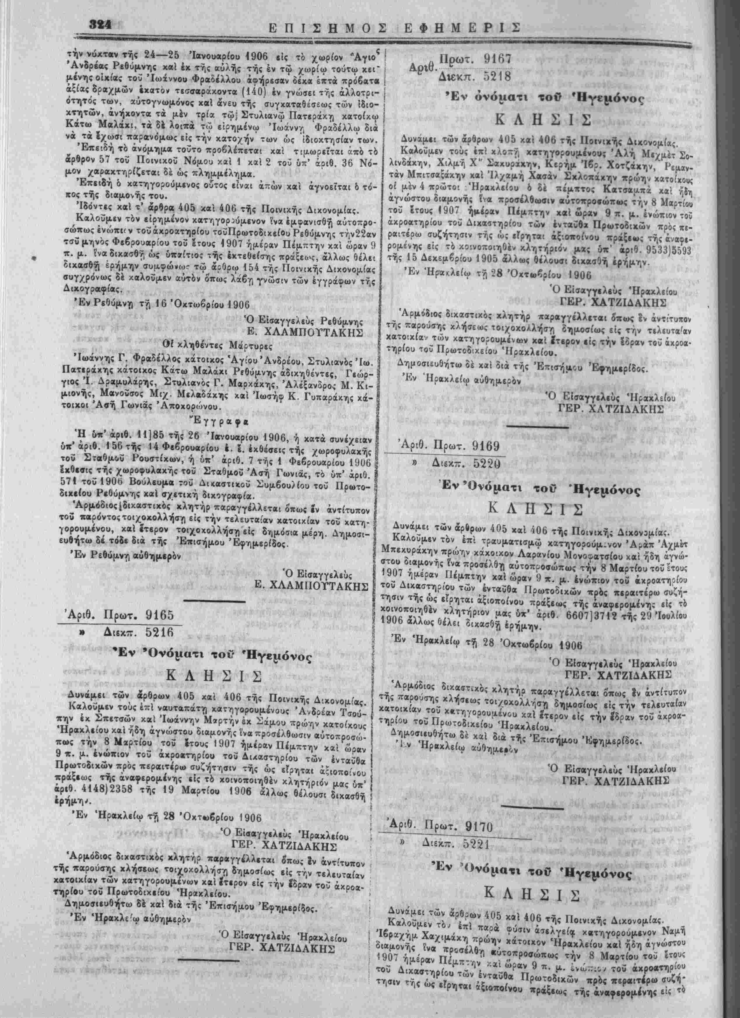 κατοικίαν τ<ΰν κατηγορουμένων καί Ιτερον είς την ίδραν τοΰ άχροα- τηρίου τοΰ Πρωτοδίκείου Ηρακλείου. Δημοσιευθήτω 3έ χαί διά τής "Επισήμου Εφημερίδος. '·*'*" Έν Ηρακλείω αυθημερόν ^ Ό Είσαγγΐλεΰς Ηρακλείου ΓΕΡ. ΧΑΤΖΙΔΑΚΗΣ „«■-,..* Αριθ. Πρωτ. 9165 » Διεκπ. 5216 •Ονόματι τοΰ Ήγεμόνος Κ Λ Η Σ Ι Σ Δυνάμει των άρθρων 405 χαί 406 τής Ποινιχής Διχονομι'ας. Καλούμεν τοϋς επί ναυταπάτ·») χατηγορουμένους Άνδρέαν Τσού- πην έχ Σπετσών χαί "Ιωάννην Μΐρτήν έχ Σάμου πρώην χατοίκους Ηρακλείου χα'ι ήδη αγνώστου διαμονής ίνα προσέλθωσιν αυτοπροσώ¬ πως την 8 Μαρτίου τοΰ ίτους 1 907 ημέραν Πέμπτην χαί ώραν 9 π. μ. ενώπιον τοϋ άκροατηρίου τοΰ Δικαστηρίου των ενταύθα Πρωτοδιχών πρός περαιτέρω συζήτησιν τής ώς είρηται άςιοποΐκου πράξεως τής άναφερομένης είς τό κοινοποιηθέν χλητήριόν μας ύπ' αριθ. 4148)2358 τής 19 Μαρτίου 1906 άϊλως θέλουσι δικασθή έρήμηΛ Έν Ηρακλείω τη 28 Όκτωβρίου 1906 ·>··ν*Μ <[Π ί Ό Εισαγγελεύς Ηρακλείου ΓΕΡ. ΧΑΤΖΙΔΑΚΗΣ Άρμόδιος διχαστ'ιχός χλητήρ παραγγέλλεται ό'πως ϊν αντίτυπον τής παρούσης χλήσεως τοιχοκολλήση δημοσίως είς την τελευταίαν κατοικίαν των κατηγορουμένων καί ίτερον είς την έδραν τοΰ άχροα- τηρίθυ τοϋ Πρωτοδιχείου Ηρακλείου. Δημοσιευθήτω δέ καί διά τής Επισήμου Εφημερίδος. Αριθ. Πρωτ. 9169 „, » Διεκπ. 522ϋ Έν Όνόματι τοθ *Ηγβμόνος Κ Λ Η Σ Ι Σ Δυνάμει των άρίρων 405 καί ίθ6 τής Ποινική; Δικονομίας. Καλοΰμβν τόν επί τραυματισμώ χατηγορούμ.νον Άράπ "Αχμέτ Μπεχυράχην πρώην χάκο-.χον Λαρανίου Μονοφατσίου χαί ήδη αγνώ¬ στου διαμονής ίνα προσέλθη αυτοπροσώπως την 8 Μαρτίου τοΰ ετους 1907 ημέραν Πέμπτην καί ώραν 9 π. μ. ενώπιον τοΰ άχροατηοίου τοΰ Δικαστηρίου των ενταύθα Πρωτοδικών πρός περαιτέρω συζή¬ τησιν τής ώς είρηται άξιοποίνου πράξεως τής αναφερομένη; βί« τό κοινοποιηθέν κλητήριον μας δπ' αριθ. 660713712 τής 29 Ιουλίου 1906 άλλως θέλε( δικασθή έρήμην. Έν Ηρακλείω τη- 28 Όκτωβρίου 1906 Ό Εισαγγελεύς Ηρακλείου ΓΕΡ. ΧΑΤΖΙΔΑΚΗΣ _ Άρμόδιος δικαστ,χος κλητήρ παραγγέλλεται Οπως ϊν αντίτυπον της παρούσης κλήσεως τοιχοκολλήση δημοσίως ίίς την τελευταίαν κατοικίαν τοΰ χβτηγορουμένου χαί ίτερον είς την ίδραν τού άχρο«" τηρίου τοΰ Πρωτοδιχείου Ηρακλείου. Δημοσιευθήτω δέ χαί διά τής Επισήμου "Εφημερίδος. 1 ν Ηρακλείω αυθημερόν Ό Εισαγγελεύς Ηρακλείου ΓΕΡ. ΧΑΤΖΙΔΑΚΗΣ ,ιί ***' Έν Ήραχλε'ω αυθημερόν Ό Εισαγγελεύς Ηρακλείου ΓΕΡ. ΧΑΤΖΙΔΑΚΗΣ Αριθ. Πρωτ. 9170 » Διεκτυ. 522Ί Έν 'Ονόματι τοθ Ήγβμόνος Κ Λ Η Σ Ι Σ . Δυνάμει των άρθρων 405 χβί 406 τής Ποινικής Διχονομίας. Καλούμεν το, 4πι παρά φυσ[ν άσίχγε^ χβτηγορούμ.νον Ναμή _ΐ6ραχημ Χαχιμαχη πρωην χίχοιίίον Ηρακλείου καί ήδη αγνώστου ^"ί*.0^5 . ινβ 'Ρ'ιθίλθν, «ύτοποοσώπωί τ^ν 8 Μ,ϊοτίου τοί *«««