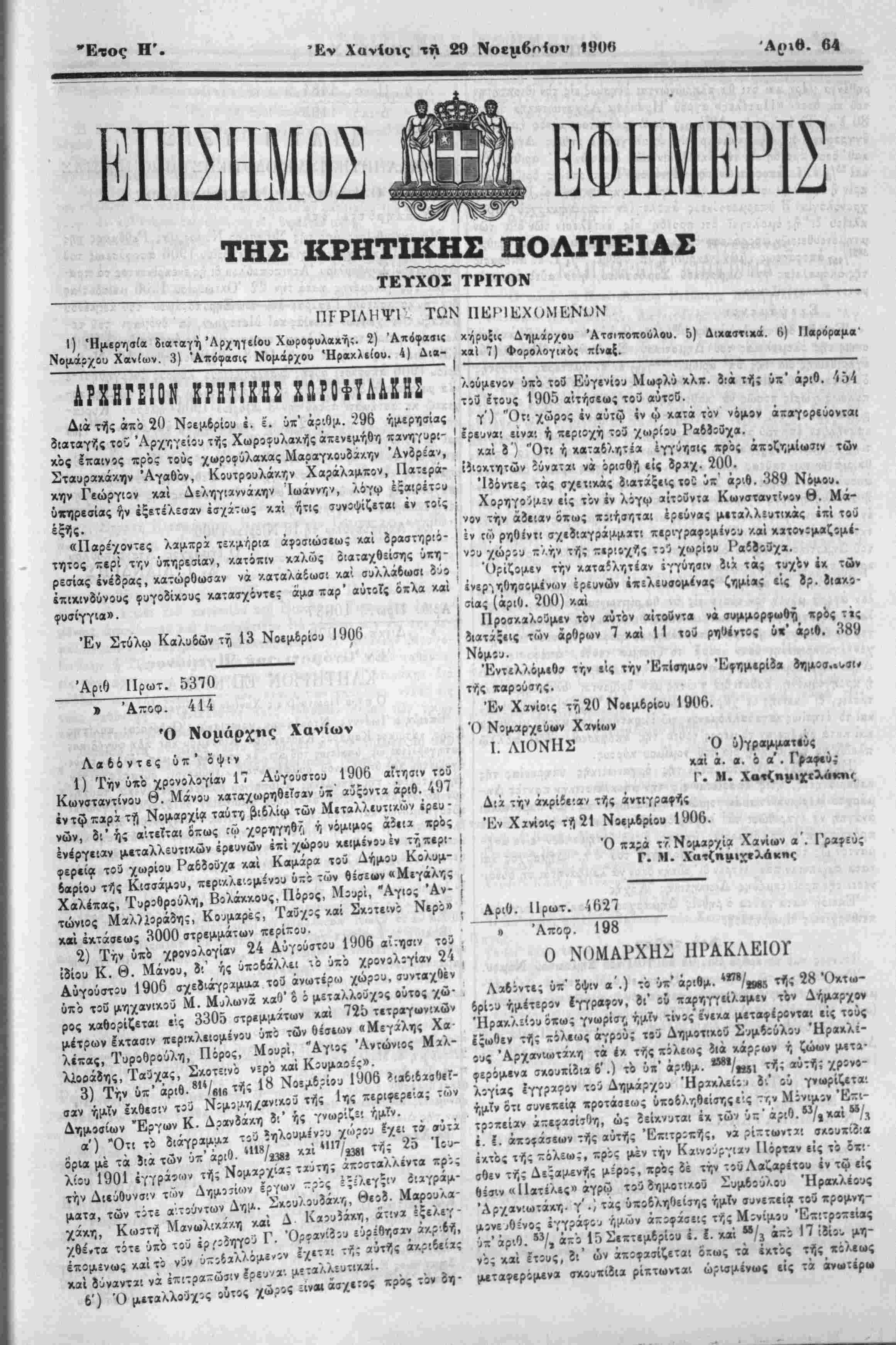 Νομάρχου Χανίων. 3) "Απόφασις Νομάρχου Ηρακλείου. 4) Δι*- κΐΐ 7) Φορολογιχός πίναξ.