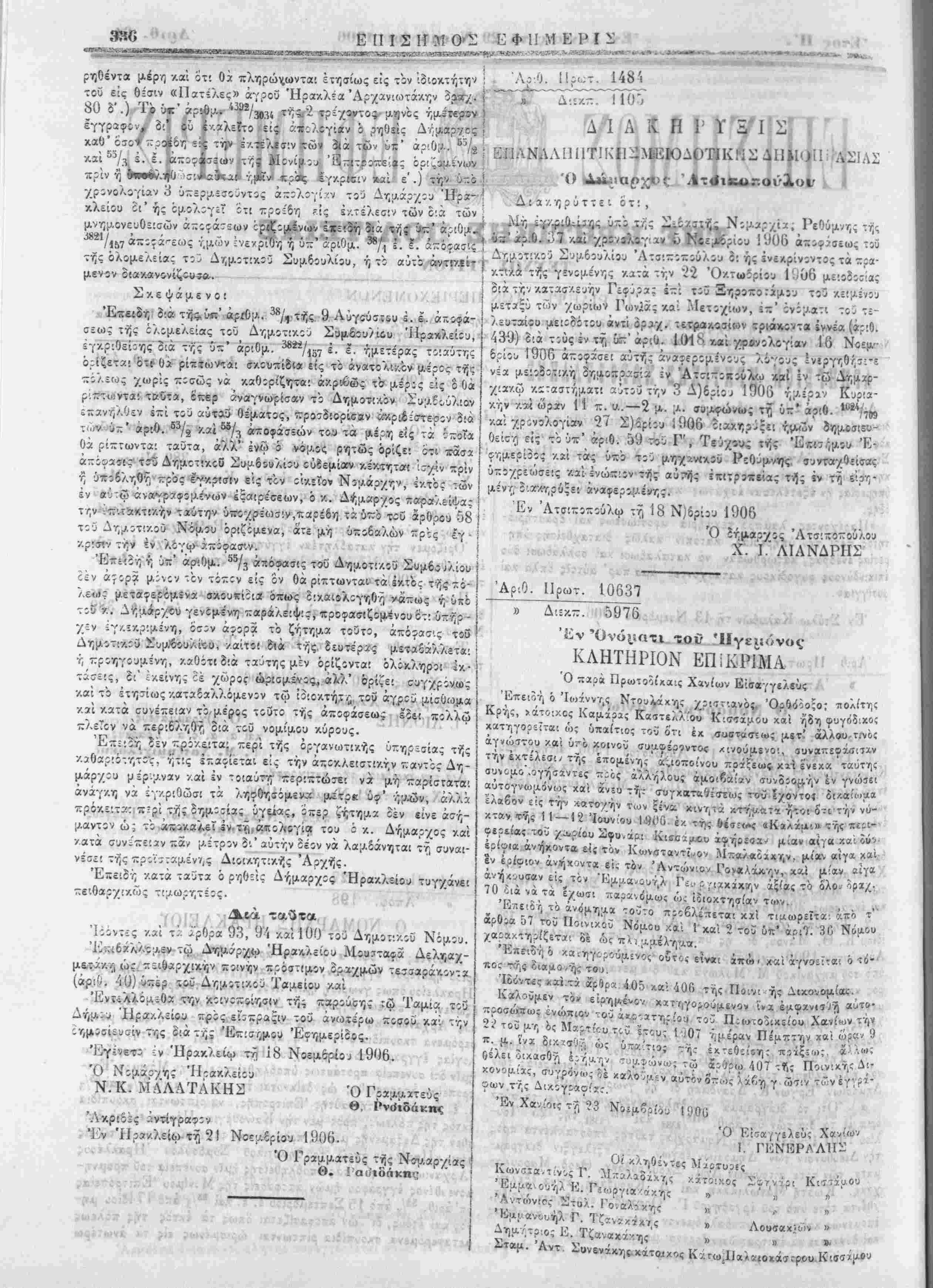 Κγίϊς Ιγγ?=»ν τούΔημάρχου Ήρ»λε«. ϊ' «. ΤΓ.-Ρ*™ ϊ-._ ..χ -Λ Ίΐί «5ν ϋπ αρι9· /ϊ38ί ._____-,-.ί,,τ,» τα-.- ματα,τώντ^α^τ,υντωνΔημ Κϊ0,ϊάχη, άτινα Ιξε/.εγ- χάκη, Κωστή Μ«·λικ^ -« ^ ι1?ίβ,σ— π.?Μ, χθέ,τα τότε Ιπο τού ·? (^ ■ 1' £ τή. ΐύτί)ς «?ι6.«; έπομενωςκαίτό νυν υ«6»^ομ-- ^λλευτ.χαί- , καί δύνανται να έπιτρα^ωσιν ε^ »· Ι*; ^ τον 8η- 6') Ό μ«αλλοϋχ>ς βυτβς χω,.ς -»«