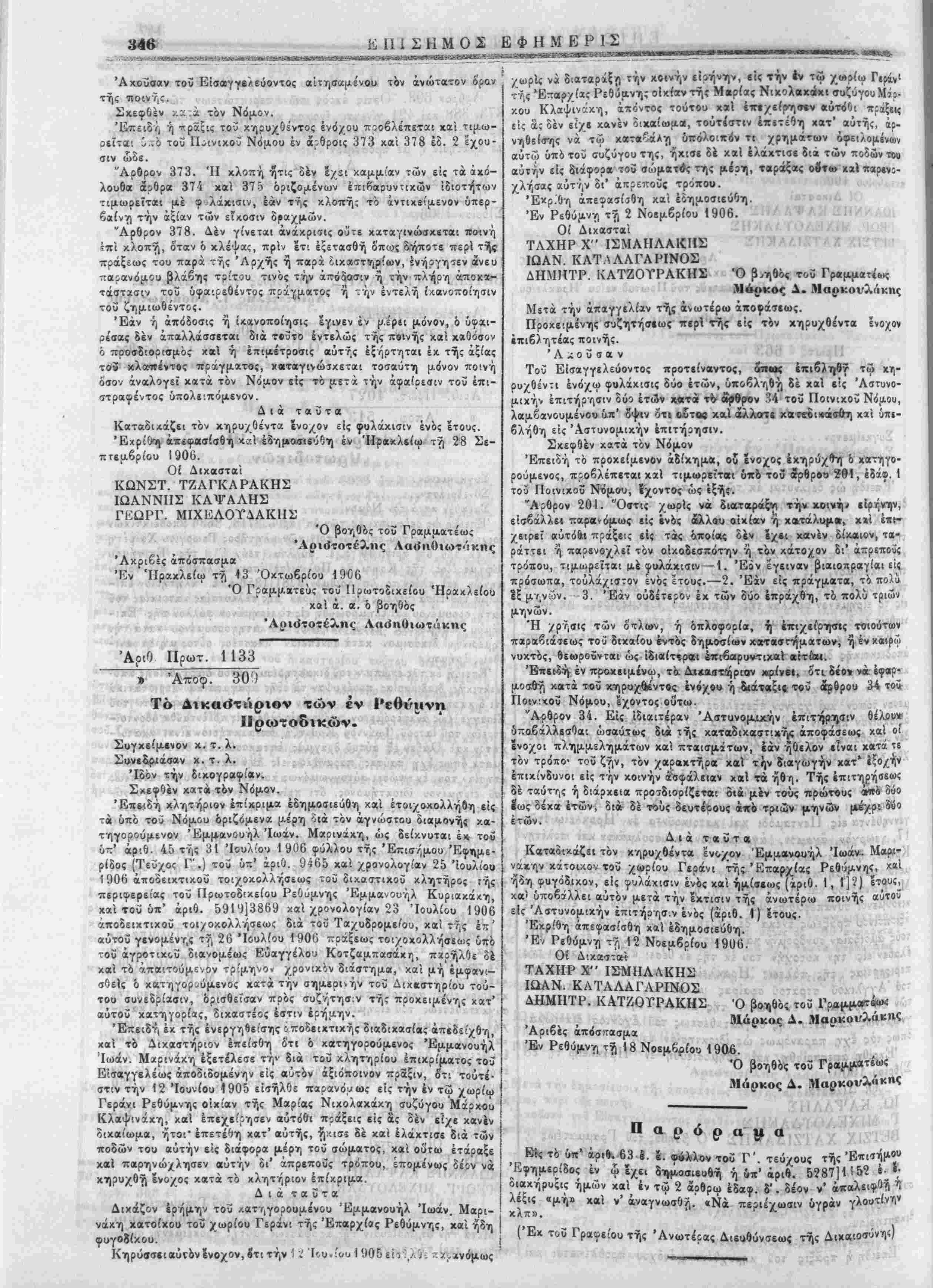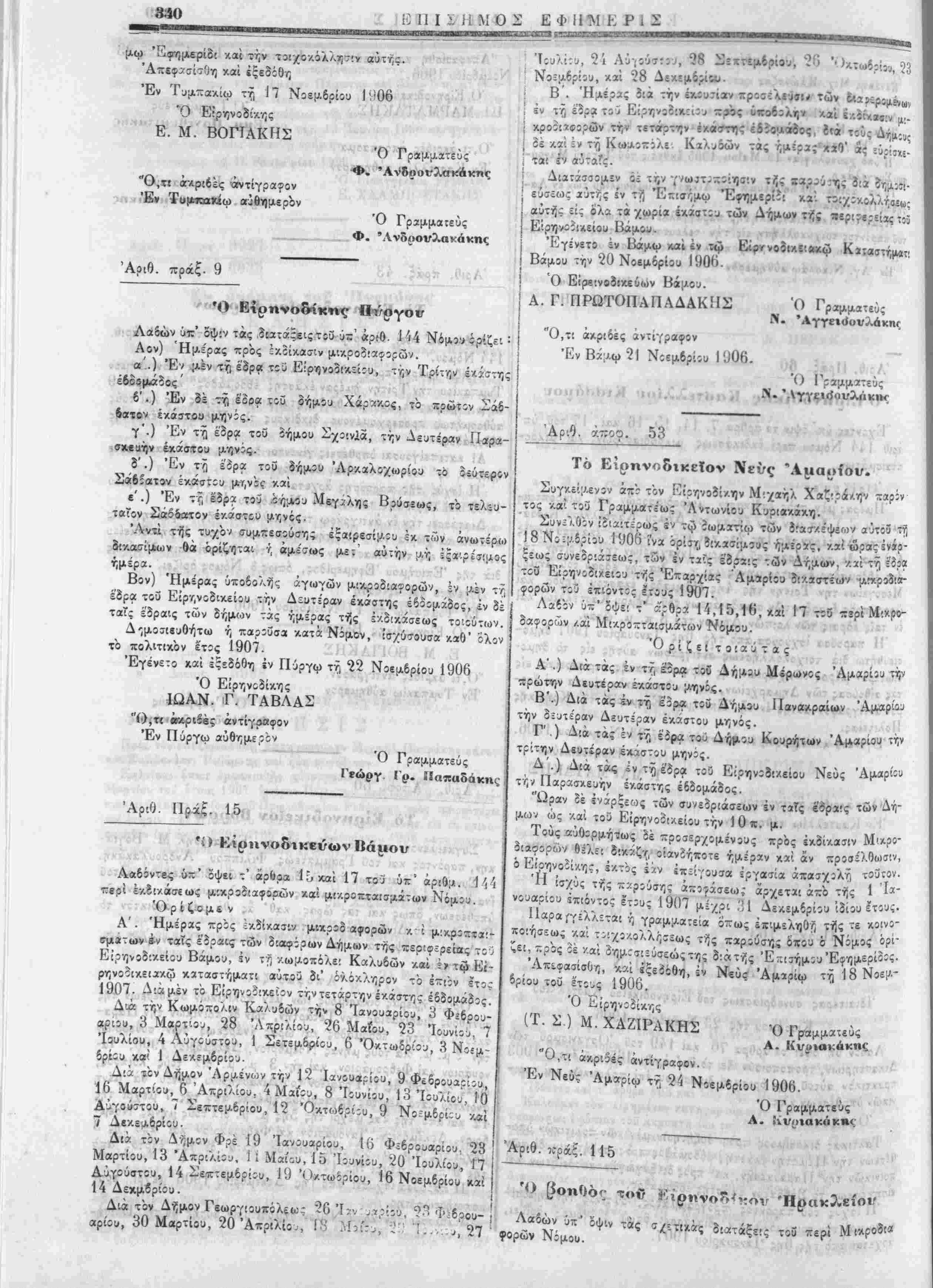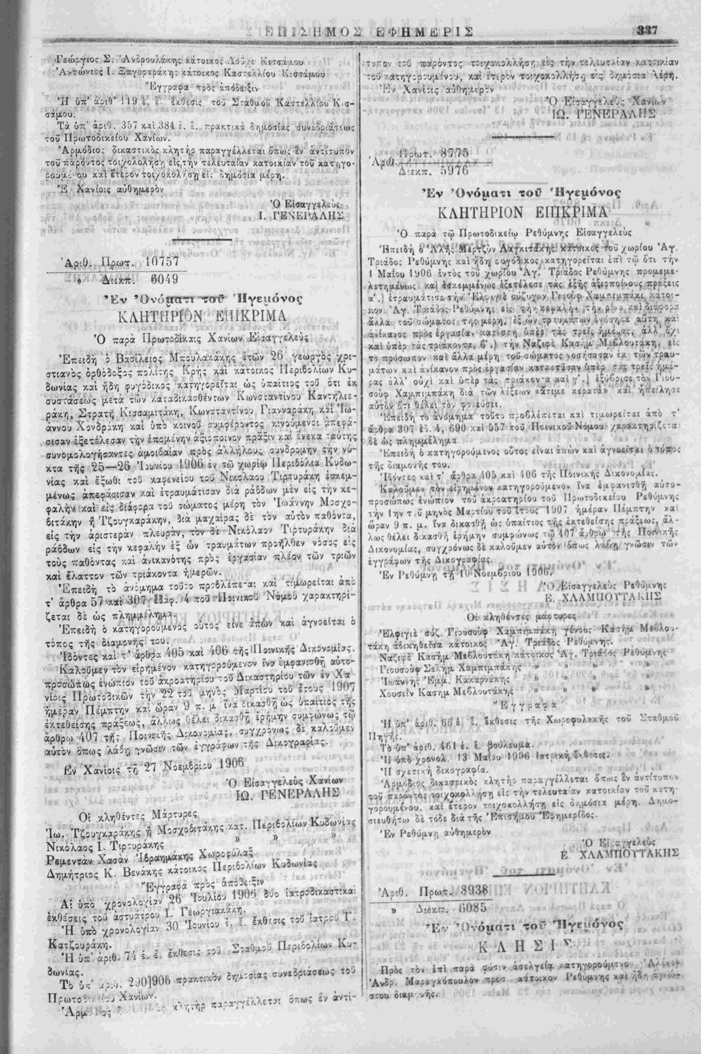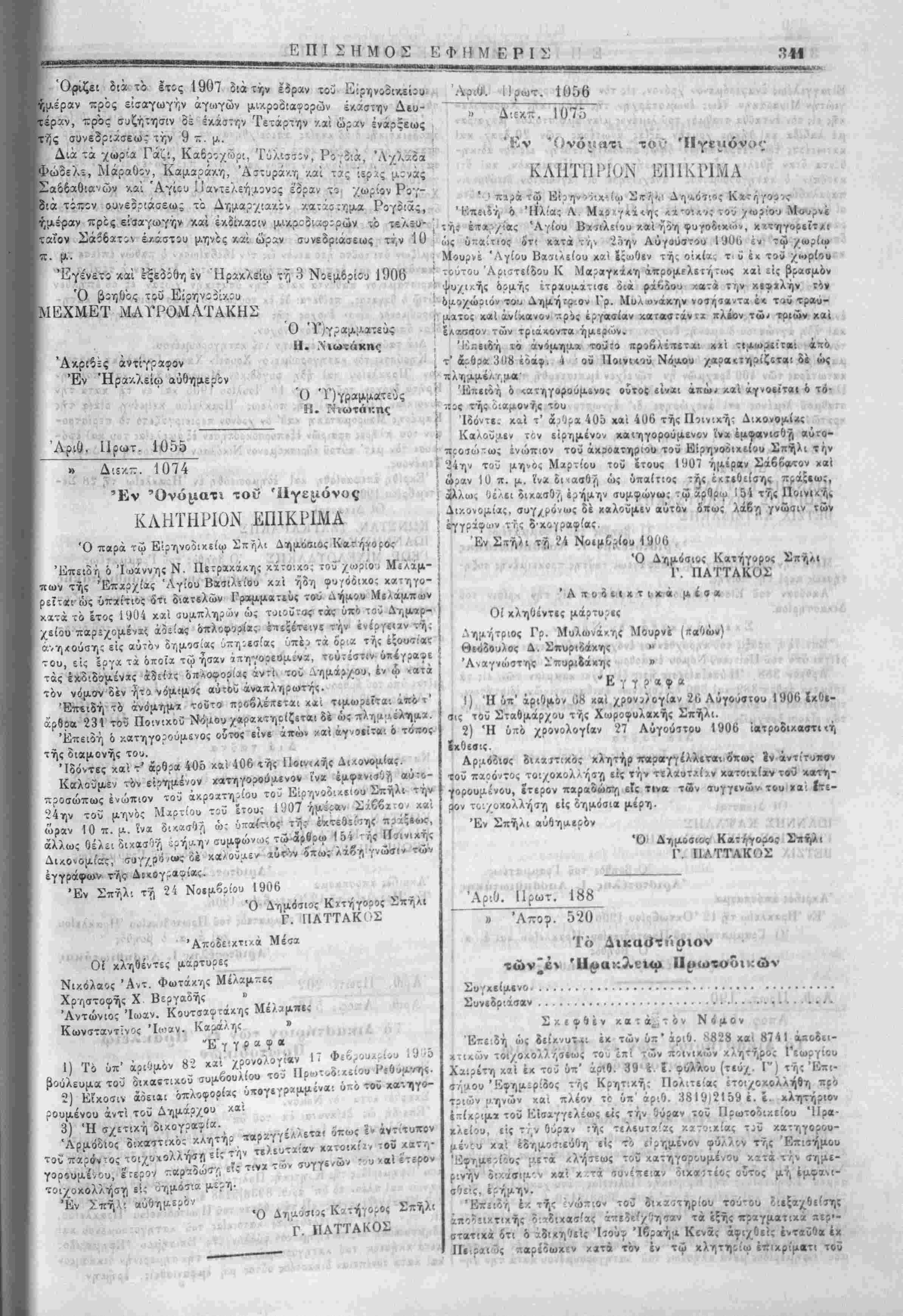 Ι Έντελλόμιθσ την ι'ις την Έπίσηιιον Εφημερίδα δημοσ.«υσι< | τής παρίύσης. ■ Έν Χανίοις τή 20 Νβεμδρίου 1906. Ό Νομαρχεύων Χανίων 1. ΛΙΟΝΙΙΣ Ό ύ)γραμματ«ΰς καί ά. α. ό α'. " Ι Γ. Μ. Χ·ι<νι | Διά την άχρίίί'.αν τής άντιγραφής Έν Χανίοις τή 21 Νοεμβριού 1906. Ό πα;ά τ?Νομαρχία Χανίων α'. Γραφεύς Γ. Μ. Χ *-: ■'--—■>*-—-