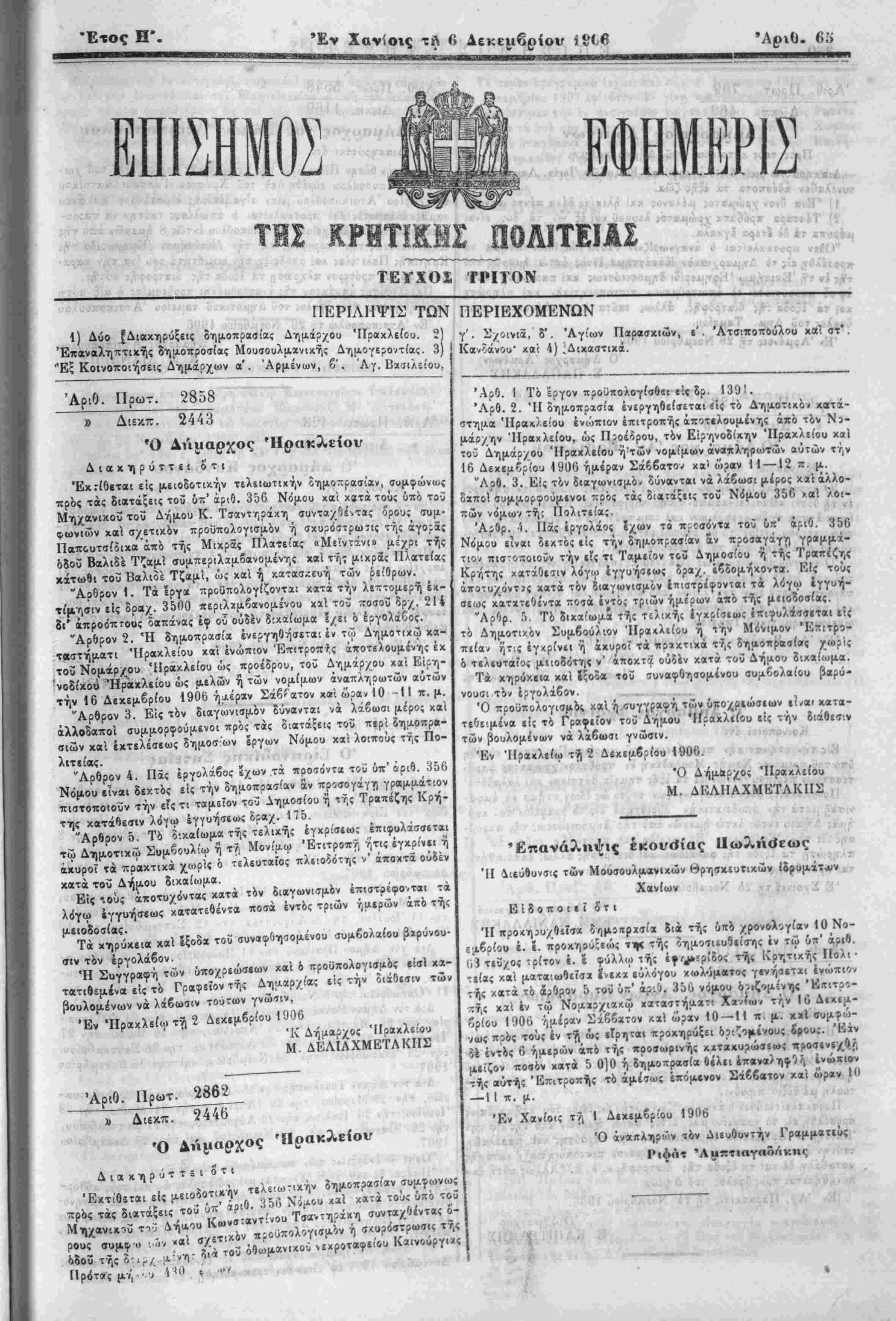την 16 Δεκεμβριού 1906 ημέραν Σάβ'ατον χ«ίώρα<10 -II π. μ. "Αρθρον 3. Είς τόν διαγωνισμόν δύνανται νά λάβωσι μερο; χαι άλλθδαποΐ συμμορφούμενοι πρός τάς διατάξεΐς τοϋ πίρί δηαοπρα- σιών καΐ έκτελέσβως δημοσ ών έργων Νομου χά! λοιπούς τής Πο- λιτείας. "Αρθρον 4. Πας έργολάβος έχων τα ποοσοντα τοϋ ΰπ'ίριθ. 356 Νόμου είναι δεκτός είς την δημοπ^ασ'αν αν προσογάγϊ) γραμμάτιον πιστοποιοϊν την είς τι ταμείον τοϋ Δημοσίου ή' τής Τραπέζης Κρή¬ της κατάθεσιν λό-[ω εγγυήσεως δρα/. Πό Αρθρο τω Δημι αχυροϊ τα πρακτιχά χωρίς κατά τοΰ Δήμου δικαίωμα Είς τοΰ; άποτυχόντας κατά τον διαγωνισμόν έπιστρεφο.ται τα λόγω εγγυήσεως χατατεθέντα ποσά έντός τριών 5-,ιιερών άπό τής μειοδοσίας. , , . , „ , Τα χηρύκειβ καΐ εζοοχ τού «υναφθηιομενου συμβολαίου βϊρυνου- σιν τόν εργολάβον . Ή Συγγραφή των υποχρεώσεων καί ο προυπολογισμός ιισΐ κα- τατιθεμένα ε'ς τό Γοαφείον τής Δηααρ/'ας είς την διάθεσιν των βουλομένων νά λάβωσιν τούτων γνώιιν, Έν Ηρακλείω τγι 2 Δεκεμβριού 1006 'Κ Δήμαρχος ΊΙραχλε'θυ Μ. ΔΕΛΙΛΧΜΕΤΛΚΗΣ κατάθεσιν λό·[ω εγγυήυεως 6?α/. 11 ο ιρβρον δ. Τό 3·.χαίωμα τής τελιχής έγχρ'σεω; έπιφολασσεται .ημοτικώ Συμβουλίω η τ>, Μονί(Λω Έτιτροπ/ί ήτις έγχρίνιι ή