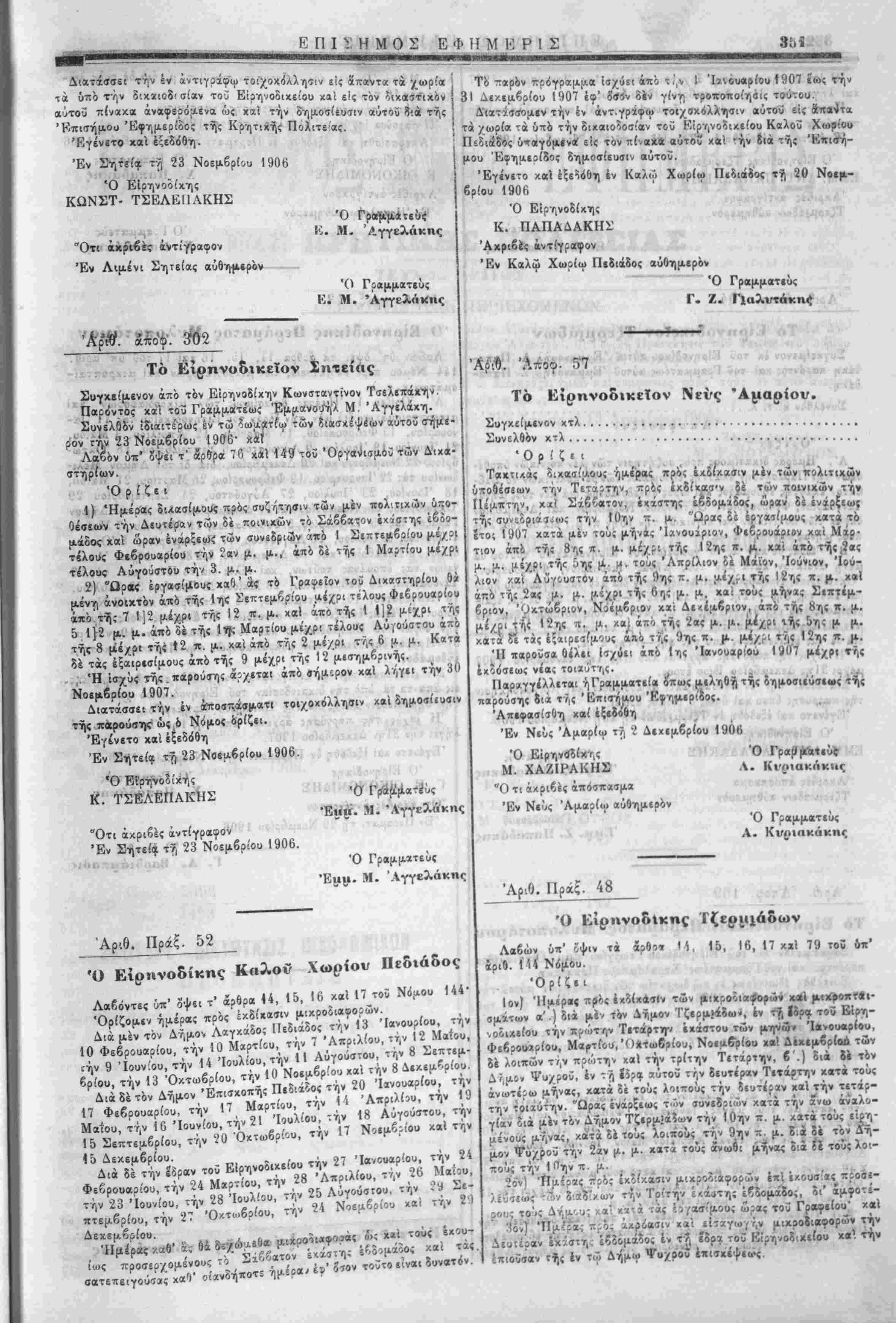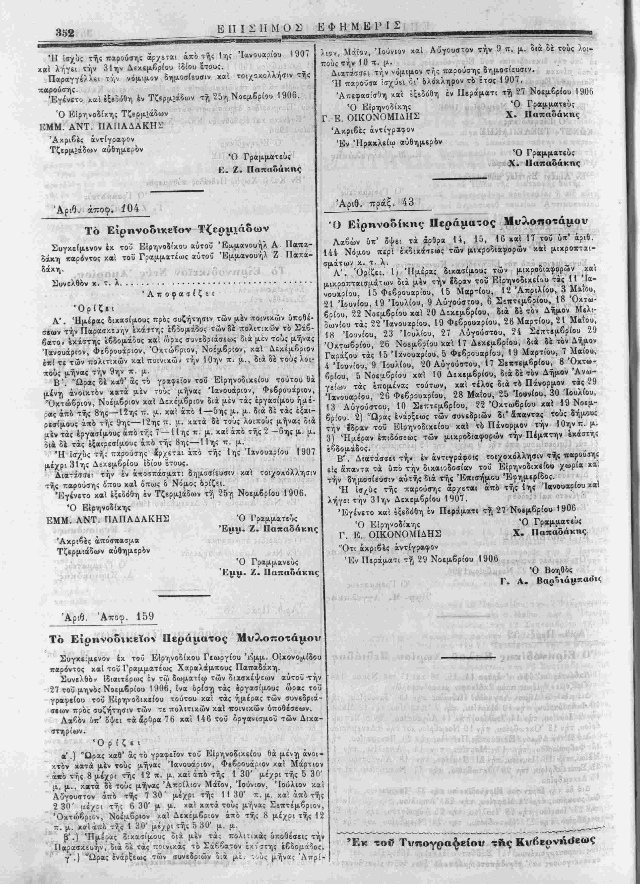 Άπεφασ'σθη καί εξεδόθη έν Περάματι τη 27 Νοεμβρίου 1906