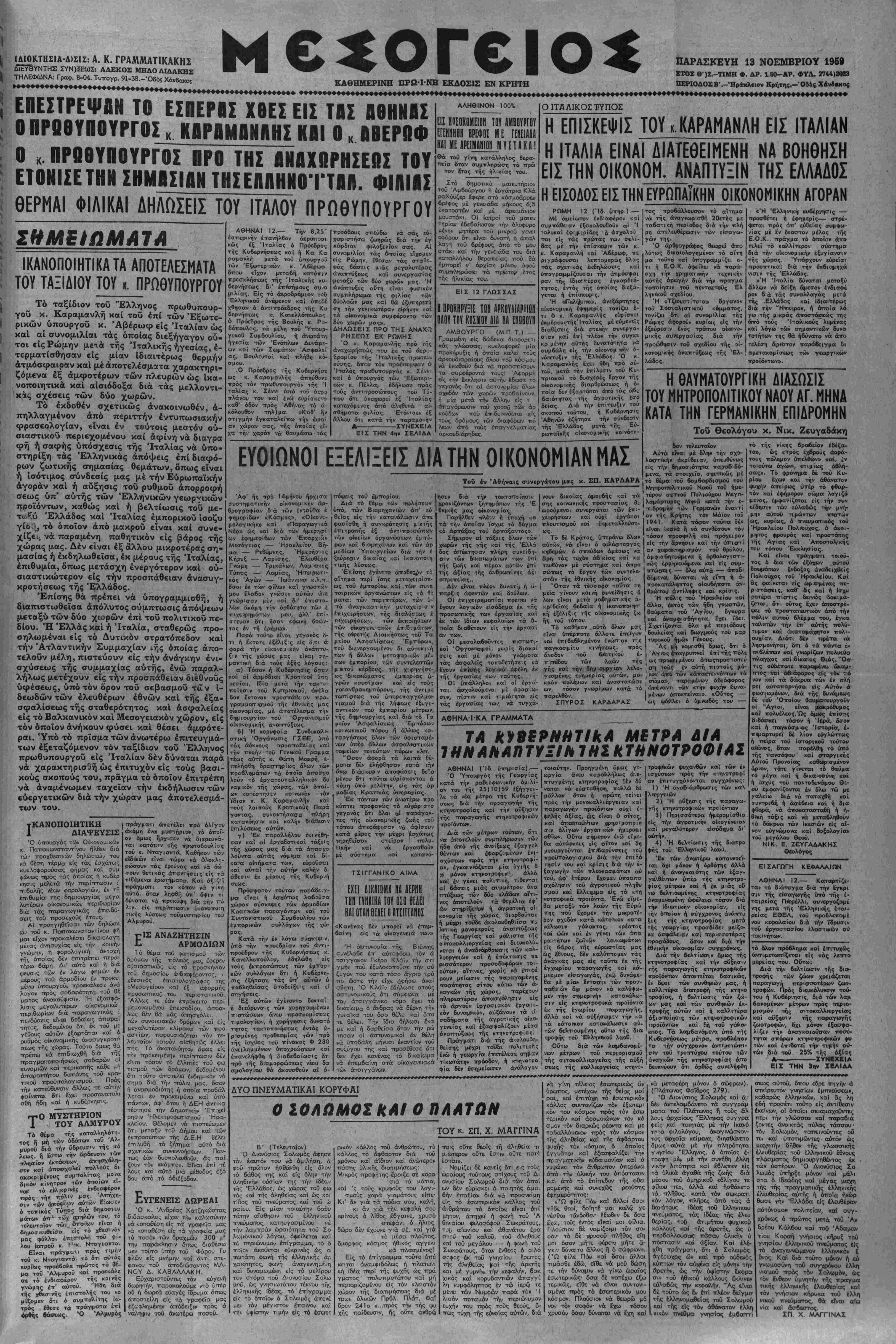 »♦♦♦♦··♦♦+♦< Μ€ ΟΓ€ΙΟ* ΚΑΘΗΜΕΡΙΝΉ ΠΡΩΙΝΗ ΕΚΔΟΣΙΣ ΕΝ ΚΡΗΤΗ ΠΑΡΑΣΚΕΥΗ 13 ΝΟΕΜΒΡΙΟΥ 1969 ΕΤΟΧ Θ')2.-ΤΙΜΗ Φ. ΔΡ. 1.60-ΑΡ. ΦΥΛ. 2744)2883 ΠΕΡΙΟΔΟΣίΒ'.-Ηράκλειον Κρήτης.-10 54ς Χάνδακος ΕΠΕΣΤΡΕΨΑΝ ΤΟ ΕΣΠΕΡΙΣ Χ8ΕΣ ΕΙΣ ΤΑΣ ΑΘΗΝΑΣ Ο ΠΡΒ6ΥΠ0ΥΡΓ0Σ κ ΚΑΡΑΜΑΝΙΙΗΣ ΚΑΙ Ο κ ΑΒΕΡΩΦ Ο χ. ΠΡΟΘΥΠΟΥΡΓΟΣ ΠΡΟ ΤΗΣ ΑΝΑΧΩΡΗΣΕΩΣ ΤΟΥ ΕΤΟΝΙΣΕ ΤΗΝ ΣΗΜΑΣΙΑΝ ΤΗΣΕΛΛΗΝΟΤΤΑΠ. ΦΗΜΑΣ ΘΕΡΜΑΙ ΦΙΛΙΚΑΙ ΔΗΛΩΣΕΙΣ ΤΟΥ ΙΤΑΛΟΥ ΠΡΩΘΥΠΟΥΡΓΟΥ >♦♦♦♦♦»♦♦♦♦♦♦»♦♦♦♦♦♦♦»< ΣΗΜΕΙΩΜΑ7Α ΙΚΑΝΟΠΟΙΗΤΙΚΑ ΤΑ ΑΠΟΤΕΛΕΣΜΑΤΑ ΤΟΥ ΤΑΞΙΔΙΟΥ ΤΟΥ κ. ΠΡΩΘΥΠΟΥΡΓΟΥ Τό ταξίδιον τοΰ Έλληνος πρωθυπουρ- γοθ κ. Καραμανλή καί τοΰ επί των Εξωτε¬ ρικών ύπουργοΰ κ. Αβέρωφ είς Ιταλίαν ώς καί αί συνομιλίαι τάς οποίας διεξήγαγον ού¬ τοι εΙςΡώμην μετά τής Ίταλικήςήγεσίας, ε¬ τερματίσθησαν είς μίαν ιδιαιτέρως θερμήν ατμόσφαιραν καί μέ άποτελέσματα χαρακτηρι- ζόμενα έξ αμφοτέρων των πλευρών ώς ίκα- νοποιητικά καί αίσιόδοξα διά τάς μελλοντι- κ&<, σχέσεις των δύο χωρών. Τό εκδοθέν σχετικώς ανακοινωθέν, α¬ πηλλαγμένον άπό περιττήν έντυπωσιακήν φρασεολογίαν, βΐναι έν τούτοις μεστόν ού- σιαστικοΰ περιεχομένου καί άφίνη νά διαγρα φή ή σαφής ύπόσχεσις τής Ιταλίας νά υπο¬ στηρίξη τάς Ελληνικάς άπόψεις επί διαφό¬ ρων ζωτικής σημασίας θεμάτων, δπως είναι ή ίσύτιμος σύνδεσις μας μέ την Εύρωπαϊκήν αγοράν καί ή αύξησις τοΰ ρυθμοΰ άπορροφή σεως ύπ' αυτής των Έλληνικών γεωρνικών προϊόντων, καθώς καί ή βελτίωσις τοΰ με- τ^ύ Ελλάδος καί "Ιταλίας έμπορικοΰ ίσοζυ γ£ο;^ τό οποίον άπό μακροΰ είναι καί συνε- χίζει· νά παραμένη παθητικόν είς βάρος της χώρας μας. Δέν είναι έξ όίλλου μικροτέρας ση¬ μασίας ή εκδηλωθείσα, έκ μέρους τής Ιταλίας, έπιθυμία, δπως μετάσχη ένεργότερον καί ου¬ σιαστικώτερον είς την προσπάθειαν ανασυγ¬ κροτήσεως τής Ελλάδος. Έπίσης θά πρέπει νά ύπογραμμισθή, ή δΐαπιστιοθεΐσα άπόλυτος σύμπτωσις άπόψεων μεταξύ των δύο χωρών επί τοΰ πολιτικοΰ πε- δίου. Ή Ελλάς καί ή Ιταλία, σταθερώς προ- σηλωμέναι είς τό Δυτικόν στρατόπεδόν καί την Άτλαντικήν Συμμαχίαν ιής οποίας άπο- τελοΰν μέλη, πιστεύουν είς την ανάγκην ένι- σχύσεως τής συμμαχίας αυτής, ένώ παραλ¬ λήλως μετέχουν είς την προσπάθειαν διέθνοΰς ύφέσεως, υπό τόν όρον τοΰ σεβασμοΰ τα ν I- δεωδών των έλευθέρων εθνών καί τής έξα- σφαλίσεως τής σταθερότητος καί ασφαλείας είς τό Βαλκανικόν καί Μεσογειακόν χώρον, είς τόν οποίον άνήκουν φύσει καί θέσει αμφότε¬ ραι. Υπό τό πρΐσμα των ανωτέρω έπιτευγμά- των έξεταζόμενον τόν ταξίδιον τοΰ "Ελληνος πρωθυπουργόν είς Ιταλίαν δέν δύναται παρά νά χαρακτηρισθή ώς έπιτυχόν είς τούς βασι- κούς σκοπούς τού, πράγμα τό οποίον έπιτρέπη νά άναμένωμεν ταχείαν την εκδήλωσιν των εύεργετικών διά την χώραν μας άποτελεσμά- των τού. ΑΘΗΝΑΙ 12.— Τϊ,ν 8,25' εσπερινήν έπανήλθον άεροπορι κώς έξ Ιταλίας ό Πράεδρος τής Κυβερνήσεως καί ή Κα <α ραμανλή μετ ά τοΰ ΰπονργοθ των Εξωτερικών κ. Αβέρωφ δττου είχον μεταβή κατόπιν προσκλήσεως τής Ίταλικής κυ¬ βερνήσεως δι' έττιΙσήΊμους συνο μιλίας. Είς τό αεροδρόμιον τού "Ελληνικόν ανέμενον καϊ ύπε£έ χβηισσν ό άντιττρόεδρος της Κ υ 6ε·ρνή—ως κ. Κανελλόπουλος ό Πράεέρος της Βονλής κ. Ρο- 6όπο·υλος, τα μέλη τού Υπουρ¬ γικον Συμβουλιον, ή άνωτάτι>