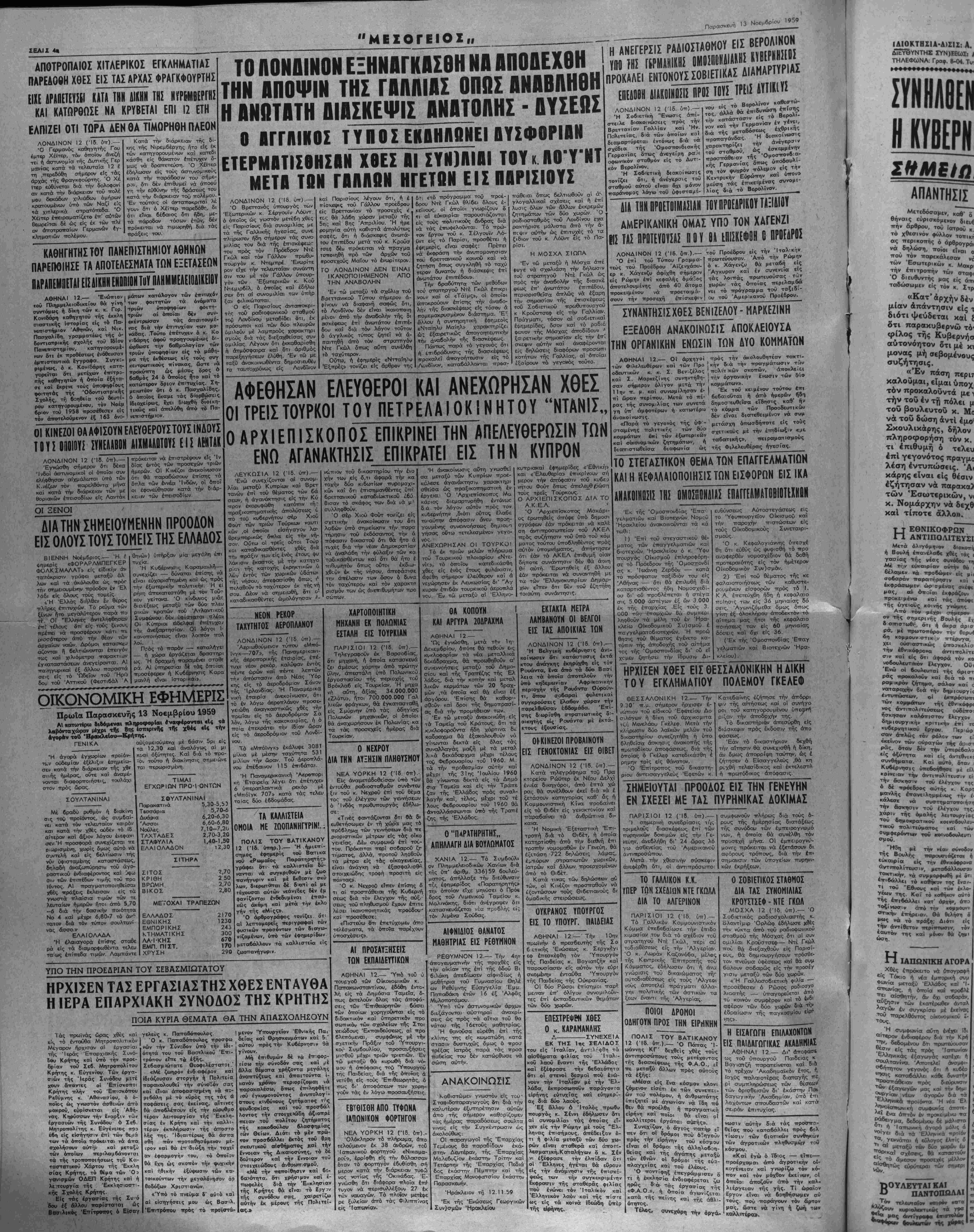 στρατηγοϋ Ντέ Γκώλ, περί <χύ τοδιαθέσεως είς την Άλγερίαν "Ο κ. Αχοράν Καζανόβα, μέλος της Κεντρικής Έπιτροπής τού Κόμματος, εδήλωσεν δτι ή άνα γνωρισις^ τοΰ δικαιώματτος ττγ συτοδιοιθέσεως ε(ς τούς Άλγεοι νους άττοτελεΤ πράγματι αλλα¬ γήν ττολιτικής τον άστικων τα ξεων έναντι της Άλί ΠΟΙΟΙ ΔΡΟΜΟΙ ΟΔΗΓΟΥΝ ΠΡΟΣ ΤΗΝ ΕΙΡΗΝΗΝ 19?^. Τ°Υ ΒΑΤΙΚΑΝΟΥ 12 ( Ι«· ύπ.).— Ό Πάπας Ι¬ ωάννης ΚΓ' δεχβείς χθές τούς άντ-ροσωπους τούς μετέ^χοντας τη,ς διοσκεψεως ,ή ΦΑ ^ 3 Κ? ·" ^ 3 ών του^πολε,μ™, ή ^, θά7ίνθι καλλίτερο. έργ6—«, αώτη τού Γ πρός την εΤνβι οί δρ6μο βειας «ι τής άγί—ης μ των εθνών αί δρδμο, τή? -λαγχνιας καί τού έλέους ^^&3 ς —εινης ^ Τέλβς, οννεχάρη τί,,, όργά. Ό Ο ΣΟΒΙΕΤΙΚΟΣ ΣΤΑΘΜΟΣ ΔΙΑ ΤΑΣ ΣΥΝΟΜΙΛΙΑΣ ΚΡΟΥΣΤΣΕΦ - ΝΤΕ ΓΚΩΛ ΜΟΣΧΑ 12 (Ίδ. ύπ).— Ό Σοβιετικάς ραδιοσχολιαστής κ. Βλαντίμιρ Όρλώψ εδήλωσε χθές την νύκτα α—ό τρΰ ραδιοφωνικοϋ σταθμού τής Μόσχας δτι αί συν ομιλίαι Κροθστσεφ— Ντέ Γκώλ ποϋ θά διεξαχθούν είς Παρισί¬ ους, θά δηιμιουργήσουν πρόσθε¬ τον πνεϋμα ύφέσεως καί θά συμ βαλουν σοδαιρώς είς την ποοσέγ γισΐν μεταξυ των δύο χωρών. *'Η Γαλλοσοδιετική φΐλία — προσέθεσεν ό Ρώσος ραδιοσχο λιοιστής — ΰτταγορεύετσι άττό τϋ κοι.νόν συμφέρον καί τό 4νδι αφέρον των δύο χωρών διά ττ,ν εδραίωσιν της παγκοσμίου ΙΡ" νης*. Η ΕΙΣΑΓΩΓΗ ΕΠΙΛΑΧΟΝΤΩΝ ΕΙΣ ΠΑΙΔΑΓΩΠΚΑΣ ΑΚΑ&ΗΜΙΑΣ ΑΘΗΝΑΙ 12— Δι" άποφάσί ως τού ύπουργού Παιδείας κ Βογιο—ζή παρο—είνεται καί διά τό τρέχον Άκ,αδηααϊκόν έτος, Α '^χυς τταλοίΐοτέρας διαταγής ττε ρί συμπλη.ρώσεο>ς των θέσεων'